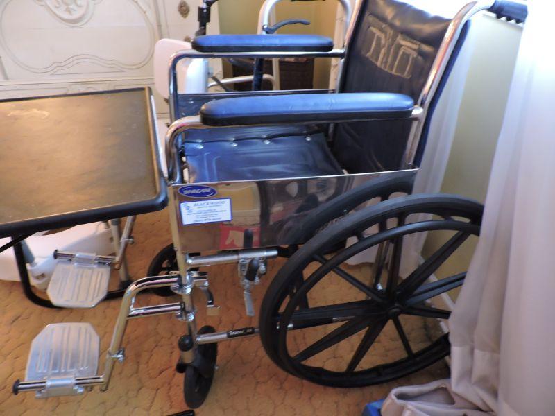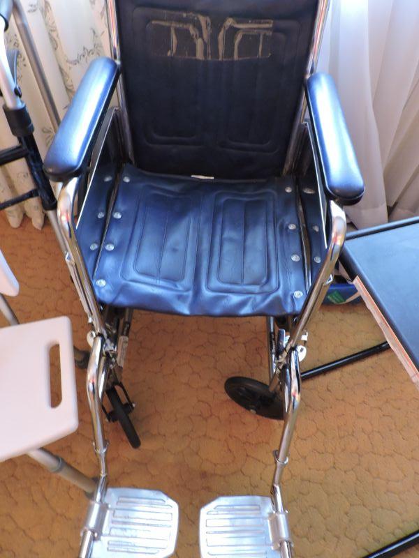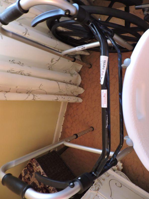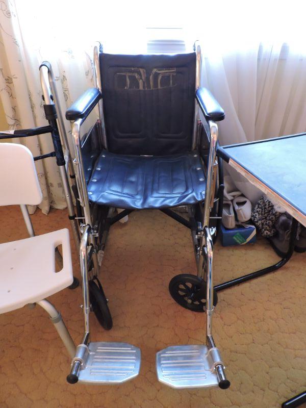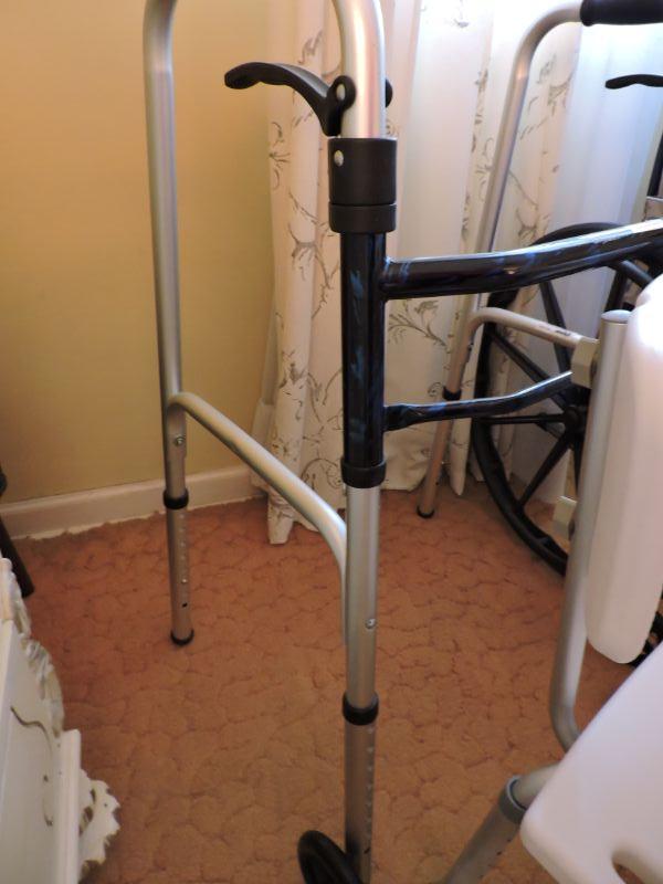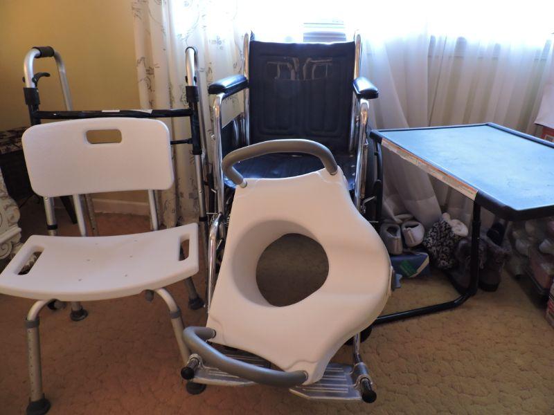 Wheel chair, walker, shower chair, tray table, and toilet seat. Please review all photos and read Terms and Conditions before placing a bid. Pick up is Wednesday, November 20 from 4-7pm and Saturday, November 23 from 9am-2pm in Mantua, New Jersey. All sales are final. All sales are as is, where is. Please bring all boxes, tools, and muscle needed to remove your items. Any photo props are not included. All measurements are approximate. Items come from dog-friendly home.