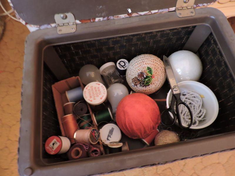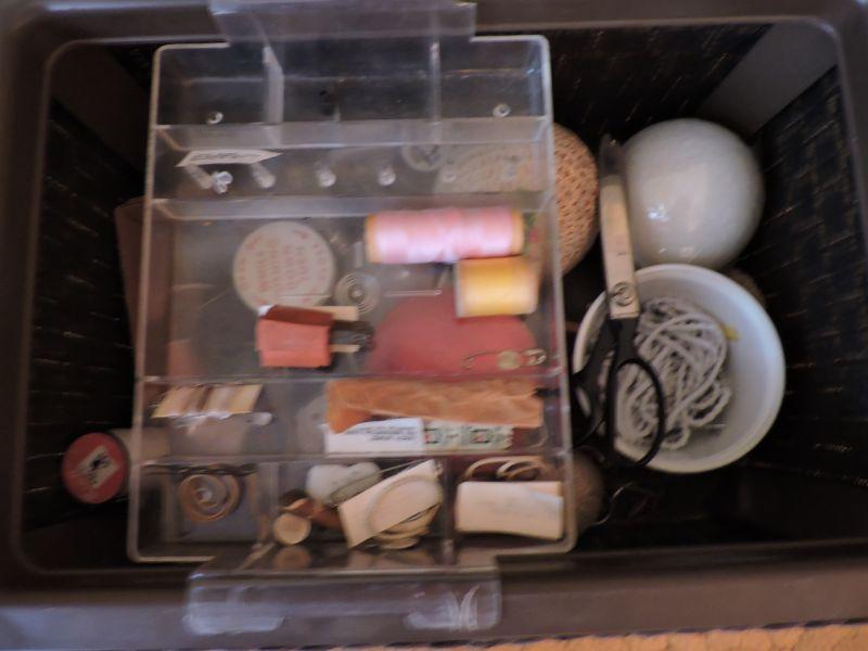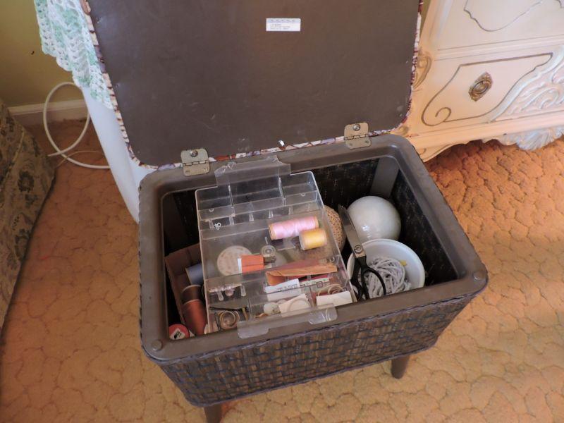 Sewing basket with all contents. Please review all photos and read Terms and Conditions before placing a bid. Pick up is Wednesday, November 20 from 4-7pm and Saturday, November 23 from 9am-2pm in Mantua, New Jersey. All sales are final. All sales are as is, where is. Please bring all boxes, tools, and muscle needed to remove your items. Any photo props are not included. All measurements are approximate. Items come from dog-friendly home.