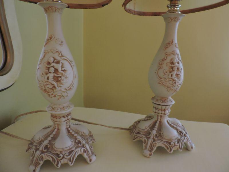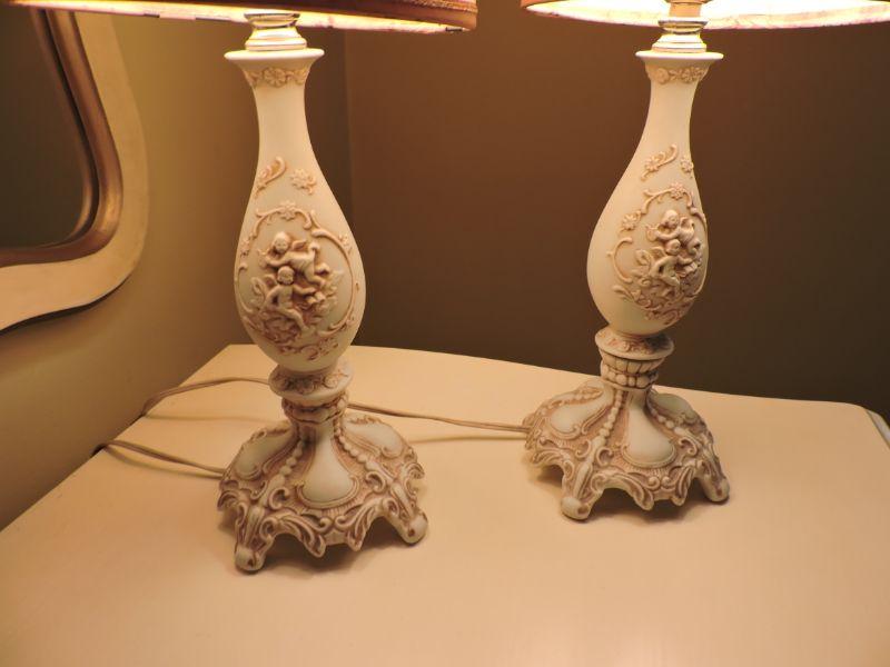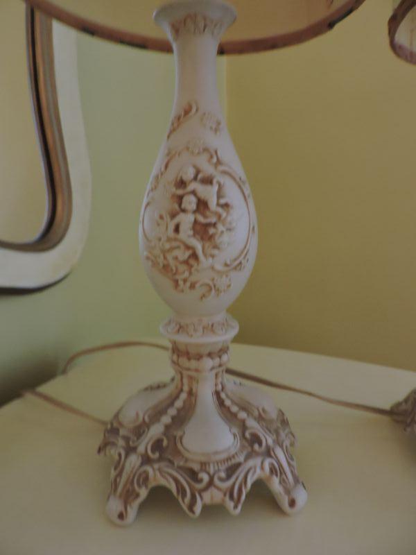 Lamps with cherubs and elaborate base. Working condition. Please review all photos and read Terms and Conditions before placing a bid. Pick up is Wednesday, November 20 from 4-7pm and Saturday, November 23 from 9am-2pm in Mantua, New Jersey. All sales are final. All sales are as is, where is. Please bring all boxes, tools, and muscle needed to remove your items. Any photo props are not included. All measurements are approximate. Items come from dog-friendly home.