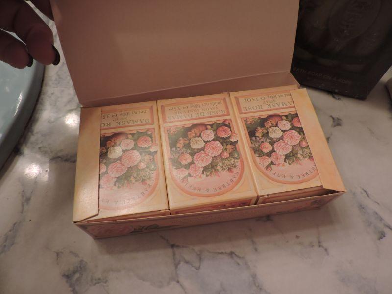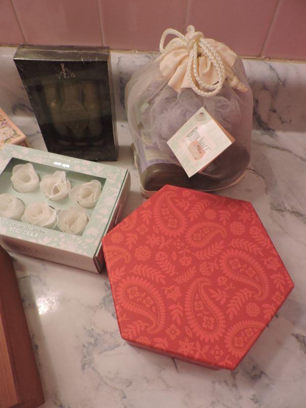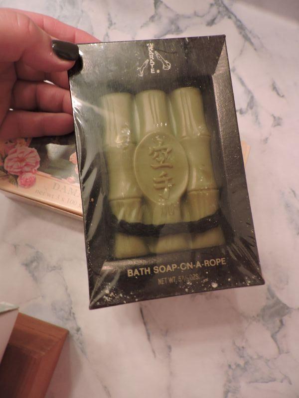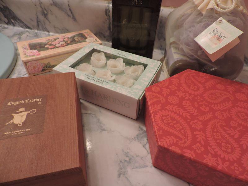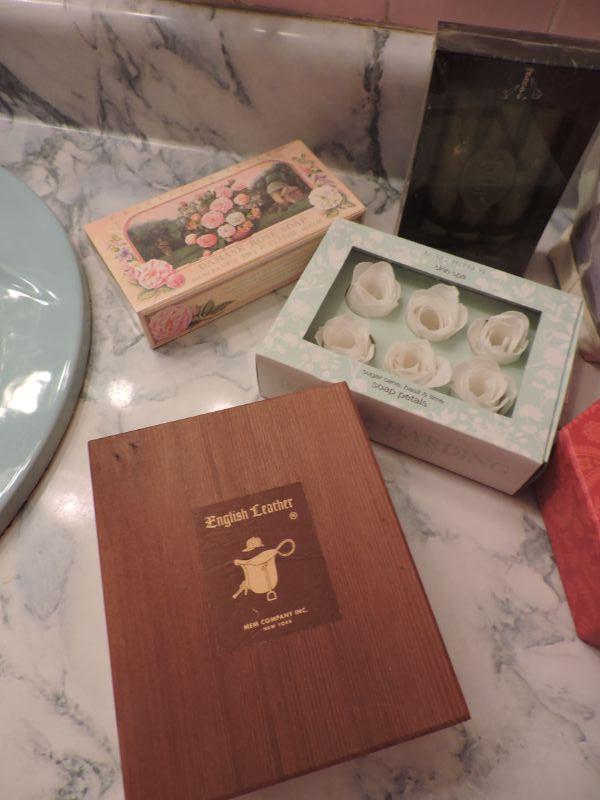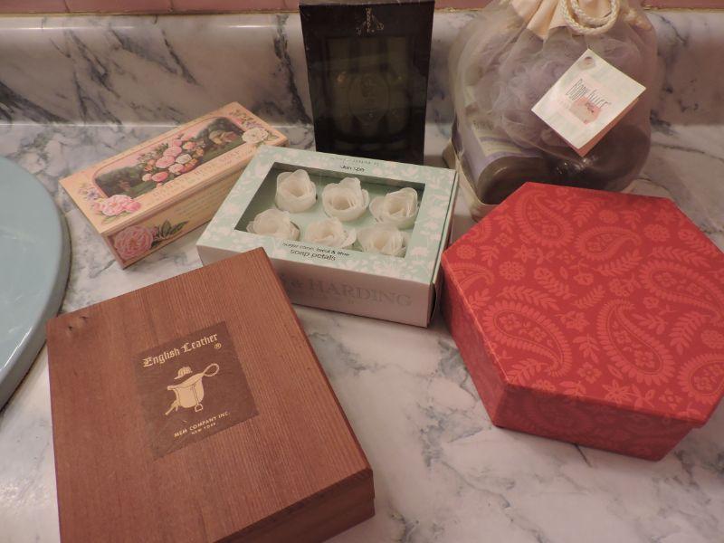Simple Pleasures, English Leather, Body Image, petal soaps, soap on a rope, and more. Please review all photos and read Terms and Conditions before placing a bid. Pick up is Wednesday, November 20 from 4-7pm and Saturday, November 23 from 9am-2pm in Mantua, New Jersey. All sales are final. All sales are as is, where is. Please bring all boxes, tools, and muscle needed to remove your items. Any photo props are not included. All measurements are approximate. Items come from dog-friendly home.