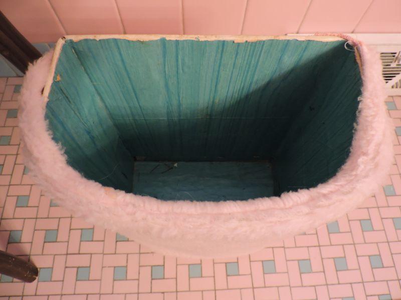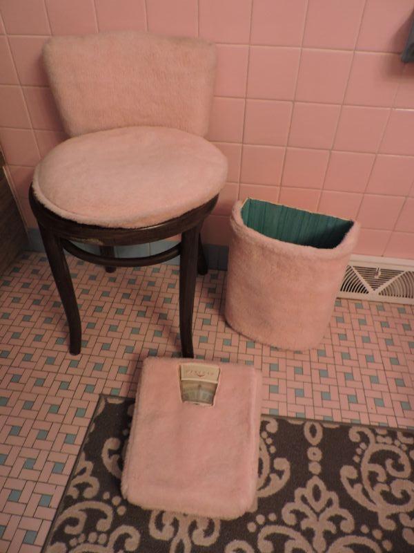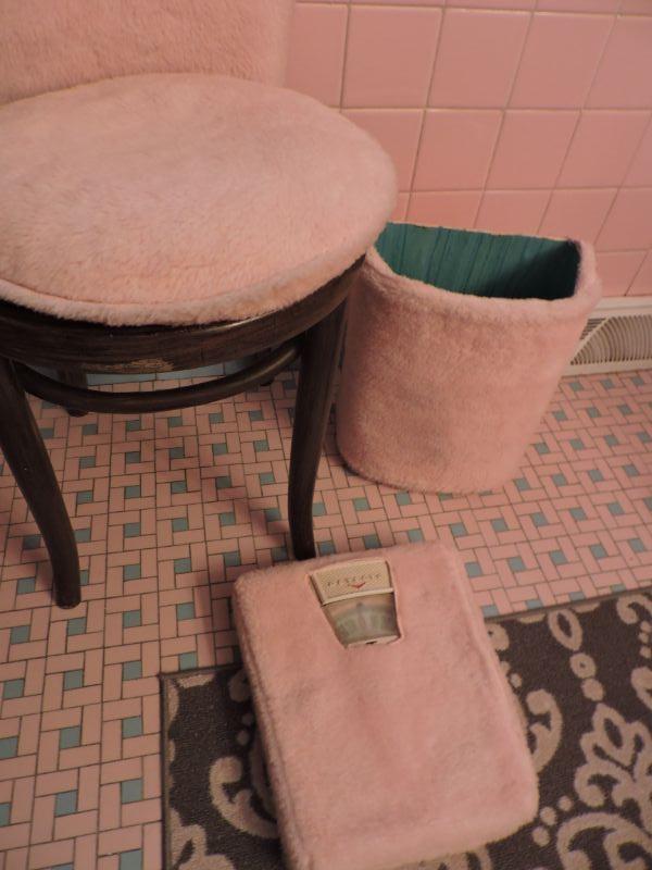 Wooden stool, metal trash can with dents, and a scale. All in custom pink covers. Please review all photos and read Terms and Conditions before placing a bid. Pick up is Wednesday, November 20 from 4-7pm and Saturday, November 23 from 9am-2pm in Mantua, New Jersey. All sales are final. All sales are as is, where is. Please bring all boxes, tools, and muscle needed to remove your items. Any photo props are not included. All measurements are approximate. Items come from dog-friendly home.
