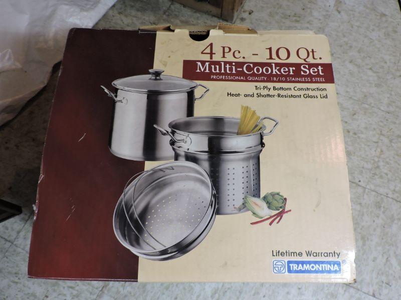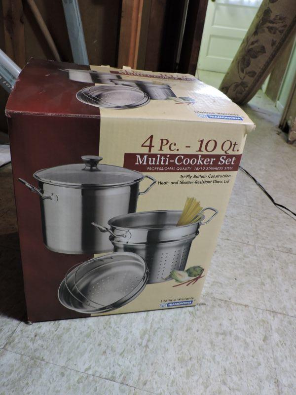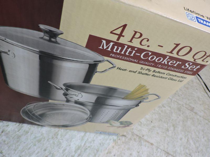 Stainless, four piece multi cooker set in box.Please review all photos and read Terms and Conditions before placing a bid. Pick up is Wednesday, November 20 from 4-7pm and Saturday, November 23 from 9am-2pm in Mantua, New Jersey. All sales are final. All sales are as is, where is. Please bring all boxes, tools, and muscle needed to remove your items. Any photo props are not included. All measurements are approximate. Items come from dog-friendly home.