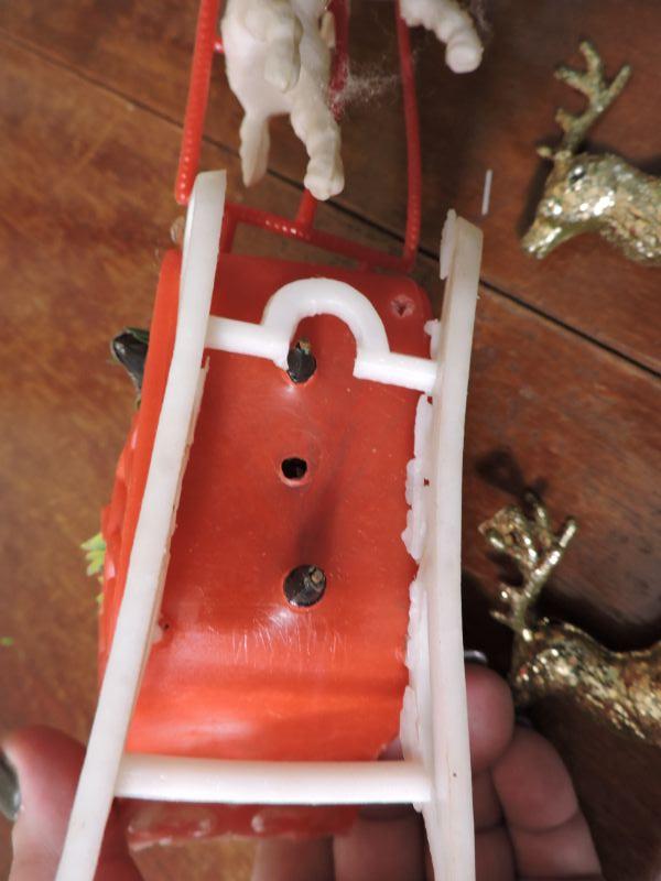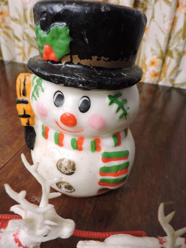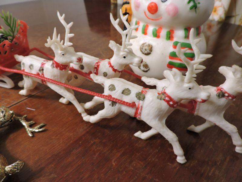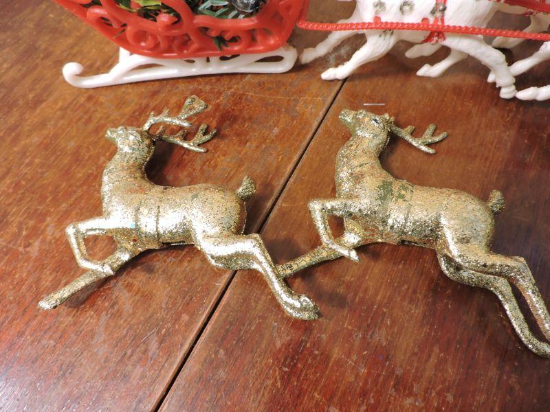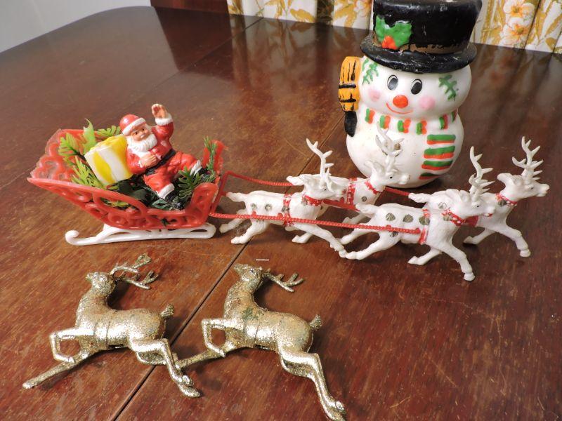 Vintage plastic Santa and sled and reindeer, snowman candle, and two gold reindeer. Please review all photos and read Terms and Conditions before placing a bid. Pick up is Wednesday, November 20 from 4-7pm and Saturday, November 23 from 9am-2pm in Mantua, New Jersey. All sales are final. All sales are as is, where is. Please bring all boxes, tools, and muscle needed to remove your items. Any photo props are not included. All measurements are approximate. Items come from dog-friendly home.