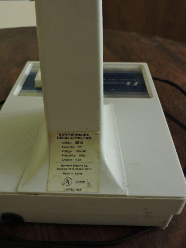 Northernaire oscillating fan, untested. Please review all photos and read Terms and Conditions before placing a bid. Pick up is Wednesday, November 20 from 4-7pm and Saturday, November 23 from 9am-2pm in Mantua, New Jersey. All sales are final. All sales are as is, where is. Please bring all boxes, tools, and muscle needed to remove your items. Any photo props are not included. All measurements are approximate. Items come from dog-friendly home.