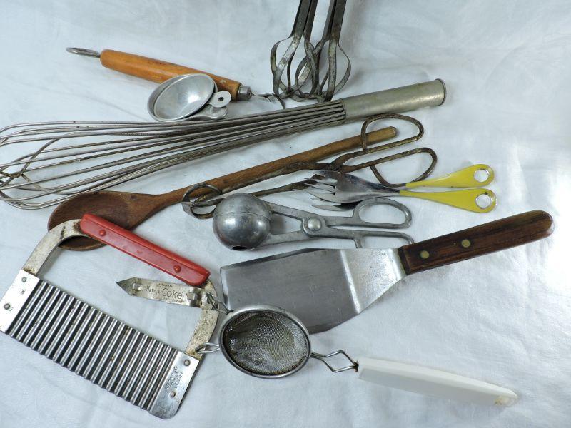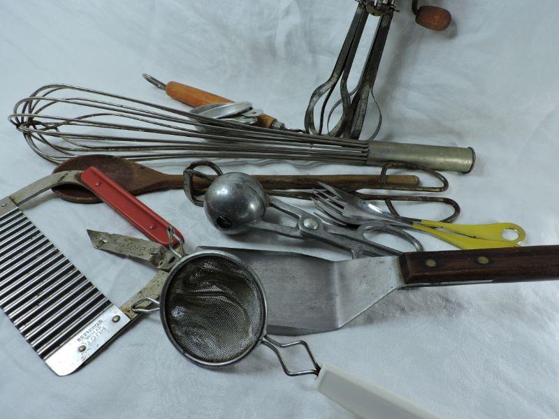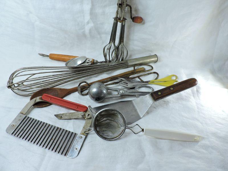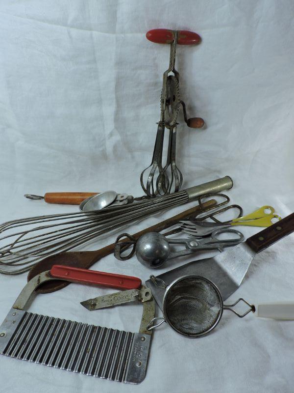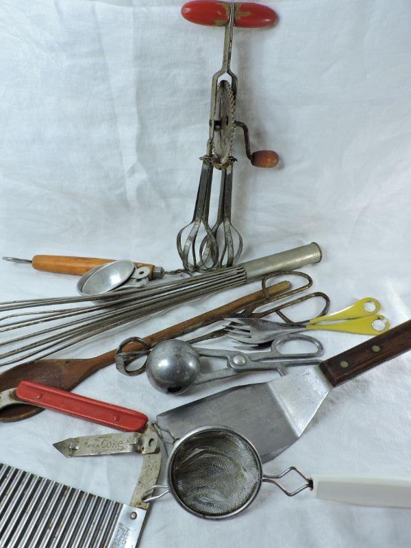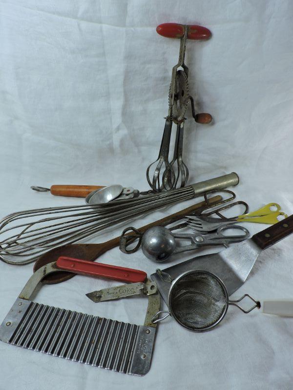 Vintage egg beater, wisk, strainer, "church key" bottle opener, a crinkle slicer, and more. Please review all photos and read Terms and Conditions before placing a bid. Pick up is Wednesday, November 20 from 4-7pm and Saturday, November 23 from 9am-2pm in Mantua, New Jersey. All sales are final. All sales are as is, where is. Please bring all boxes, tools, and muscle needed to remove your items. Any photo props are not included. All measurements are approximate. Items come from dog-friendly home.
