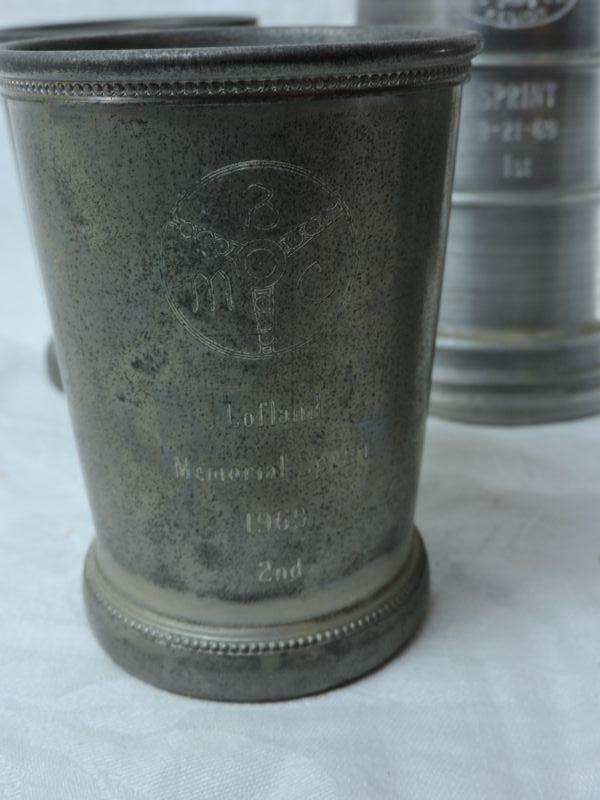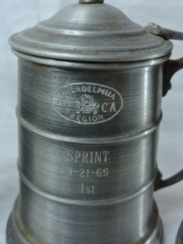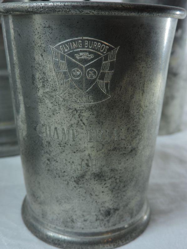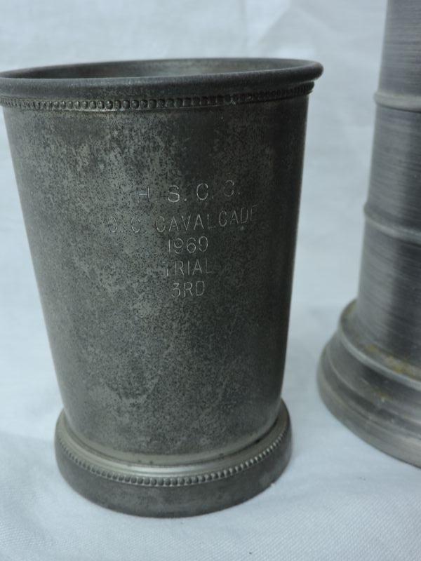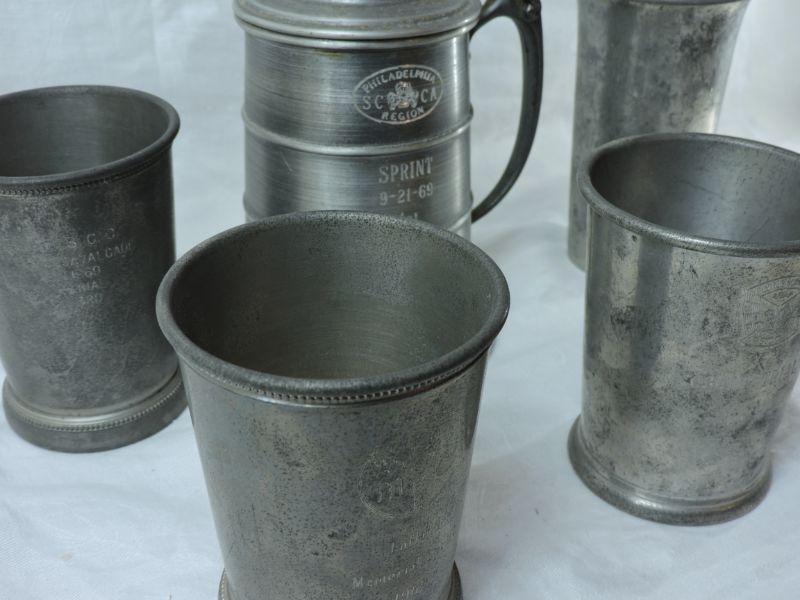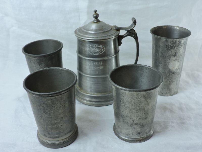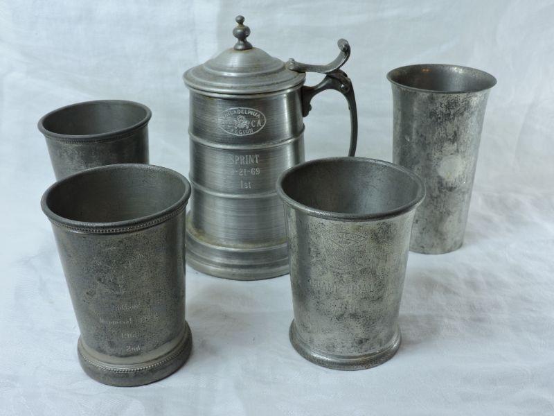 Pewter stein and four pewter cups. They all are engraved, trophy like. Please review all photos and read Terms and Conditions before placing a bid. Pick up is Wednesday, November 20 from 4-7pm and Saturday, November 23 from 9am-2pm in Mantua, New Jersey. All sales are final. All sales are as is, where is. Please bring all boxes, tools, and muscle needed to remove your items. Any photo props are not included. All measurements are approximate. Items come from dog-friendly home.