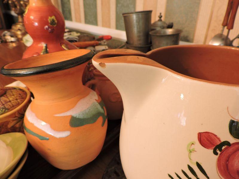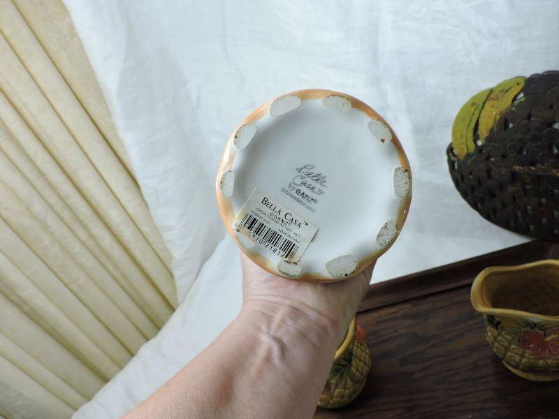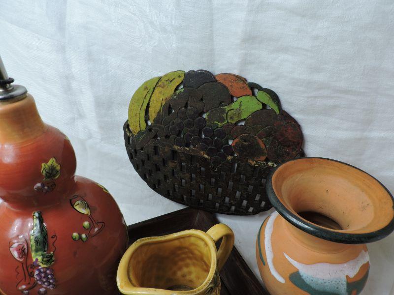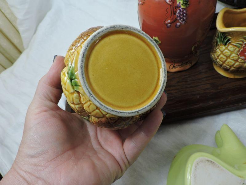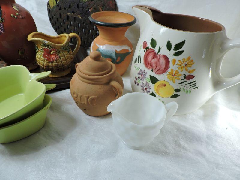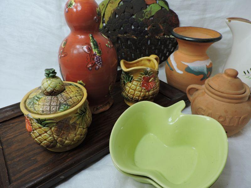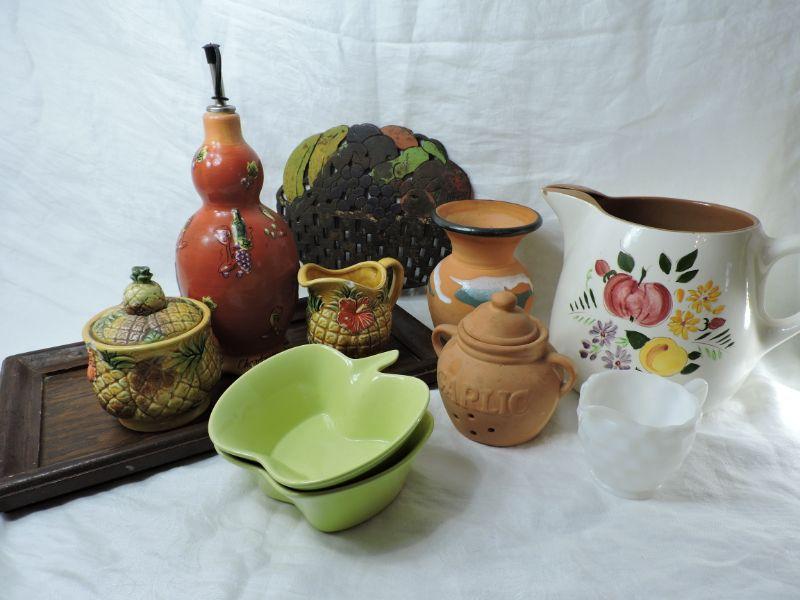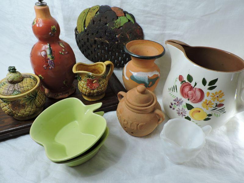 Milk glass creamer, cast iron trivet with painted fruit, Stangl pitcher, apple shaped dessert bowls, garlic keeper, colorful ceramic bottle with spout for oil, pineapple style sugar and creamer, and a southwestern vase. Please review all photos and read Terms and Conditions before placing a bid. Pick up is Wednesday, November 20 from 4-7pm and Saturday, November 23 from 9am-2pm in Mantua, New Jersey. All sales are final. All sales are as is, where is. Please bring all boxes, tools, and muscle needed to remove your items. Any photo props are not included. All measurements are approximate. Items come from dog-friendly home.
