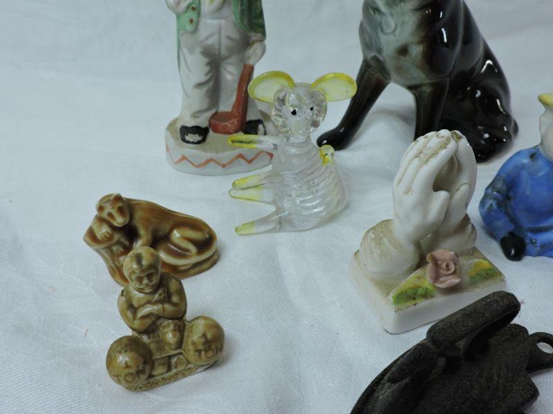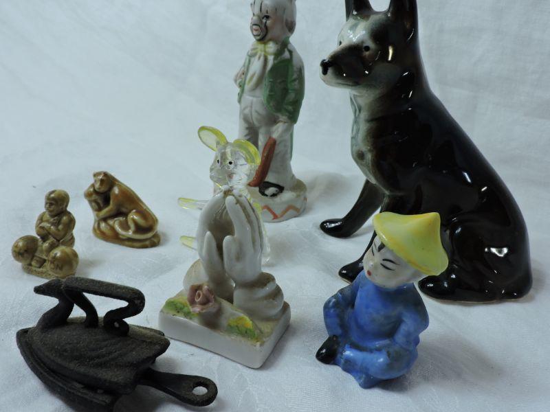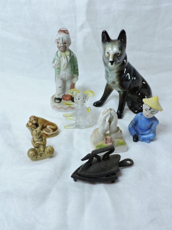 Ceramic weight lifter and monkey, praying hands, glass mouse, cast iron miniature swan iron and stand, Oriental child, a sad ceramic clown, and a dog. Bring container to remove. Please review all photos and read Terms and Conditions before placing a bid. Pick up is Wednesday, November 20 from 4-7pm and Saturday, November 23 from 9am-2pm in Mantua, New Jersey. All sales are final. All sales are as is, where is. Please bring all boxes, tools, and muscle needed to remove your items. Any photo props are not included. All measurements are approximate. Items come from dog-friendly home.