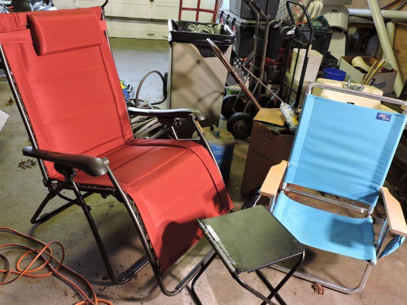 Like new, oversized zero gravity chair with canopy, a reclining beach chair and a fold up canvas stool. Please review all photos and read Terms and Conditions before placing a bid. Pick up is Wednesday, November 20 from 4-7pm and Saturday, November 23 from 9am-2pm in Mantua, New Jersey. All sales are final. All sales are as is, where is. Please bring all boxes, tools, and muscle needed to remove your items. Any photo props are not included. All measurements are approximate. Items come from dog-friendly home.