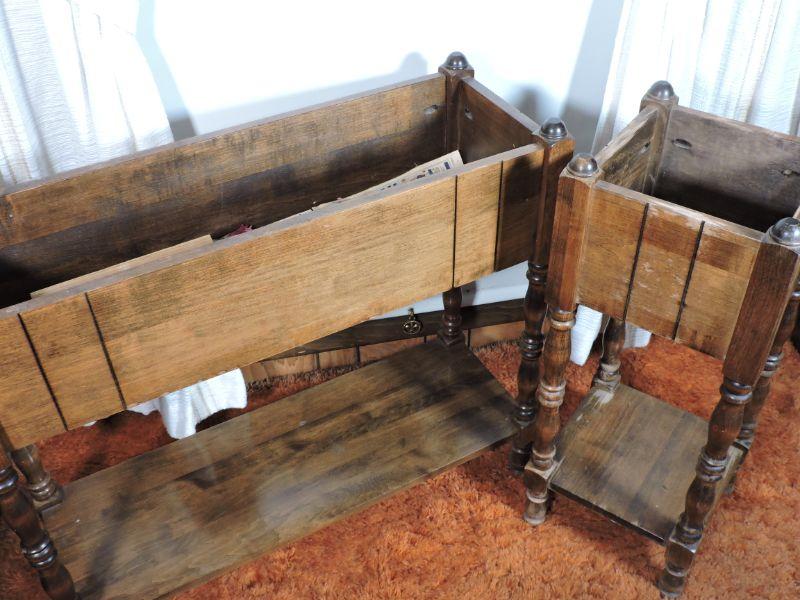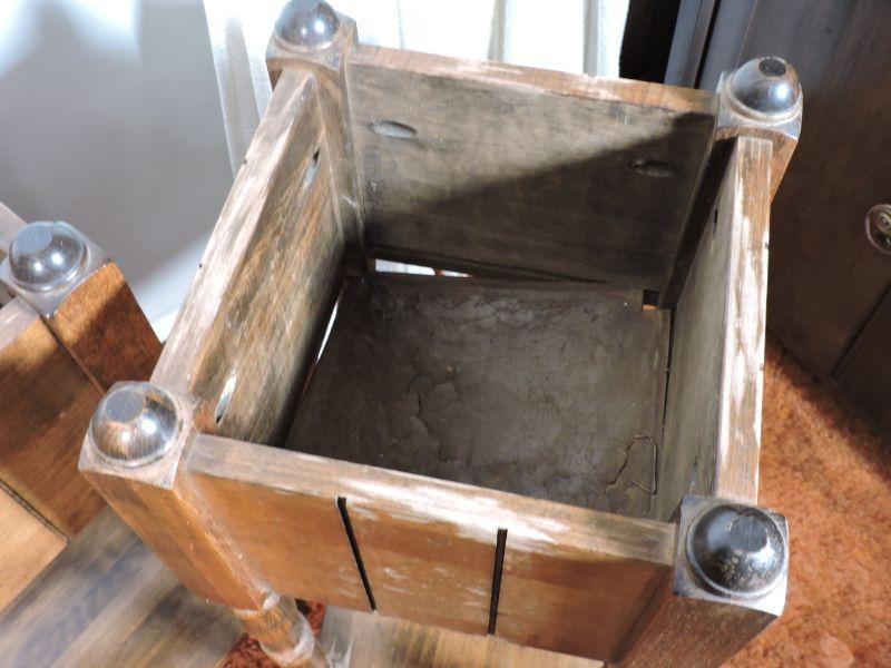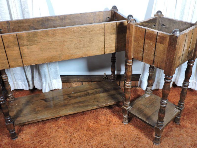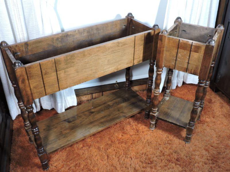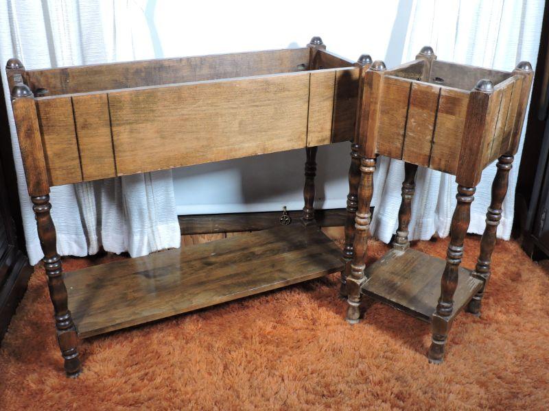 Two wooden planter boxes with shelf. Please review all photos and read Terms and Conditions before placing a bid. Pick up is Wednesday, November 20 from 4-7pm and Saturday, November 23 from 9am-2pm in Mantua, New Jersey. All sales are final. All sales are as is, where is. Please bring all boxes, tools, and muscle needed to remove your items. Any photo props are not included. All measurements are approximate. Items come from dog-friendly home.