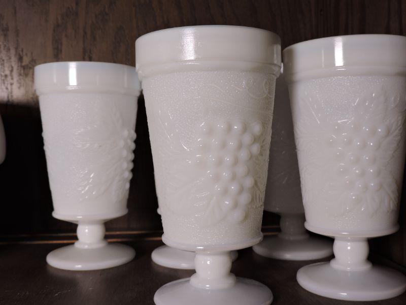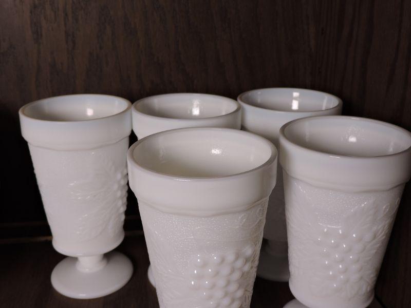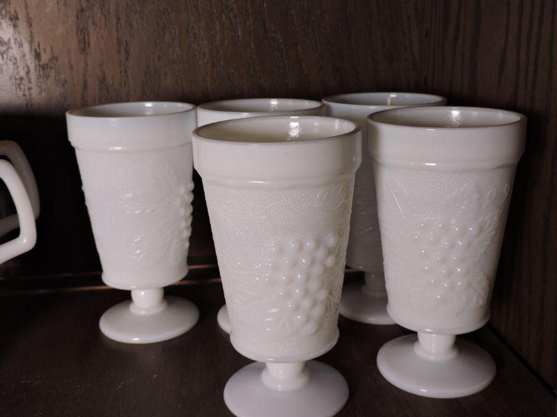 Five vintage milk glass drinking glasses. No chips. Please review all photos and read Terms and Conditions before placing a bid. Pick up is Wednesday, November 20 from 4-7pm and Saturday, November 23 from 9am-2pm in Mantua, New Jersey. All sales are final. All sales are as is, where is. Please bring all boxes, tools, and muscle needed to remove your items. Any photo props are not included. All measurements are approximate. Items come from dog-friendly home.