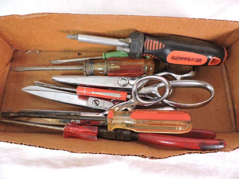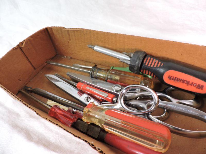 Screw drivers and scissors. Please review all photos and read Terms and Conditions before placing a bid. Pick up is Wednesday, November 20 from 4-7pm and Saturday, November 23 from 9am-2pm in Mantua, New Jersey. All sales are final. All sales are as is, where is. Please bring all boxes, tools, and muscle needed to remove your items. Any photo props are not included. All measurements are approximate. Items come from dog-friendly home.