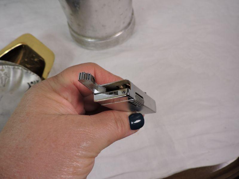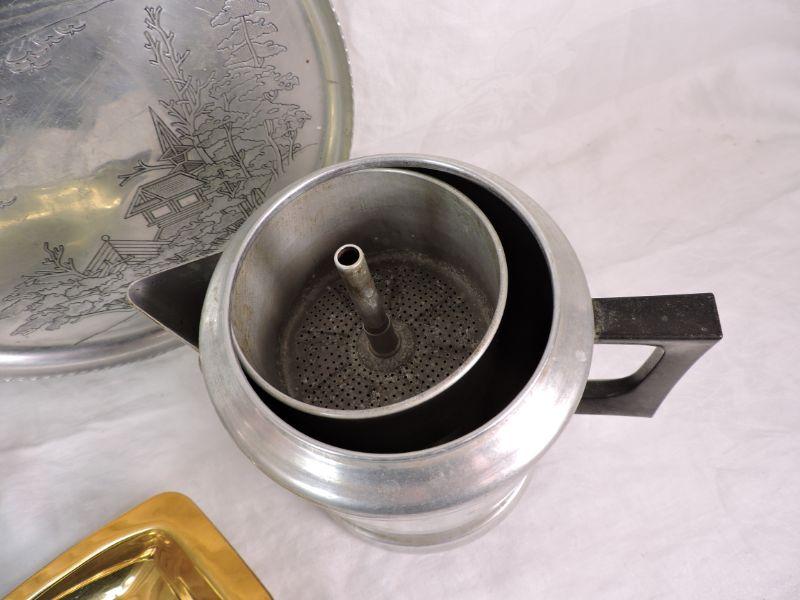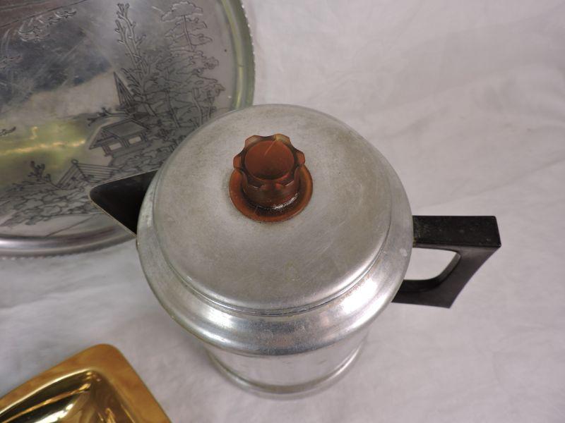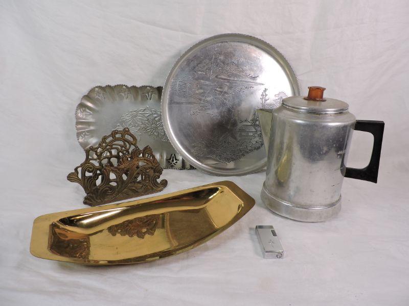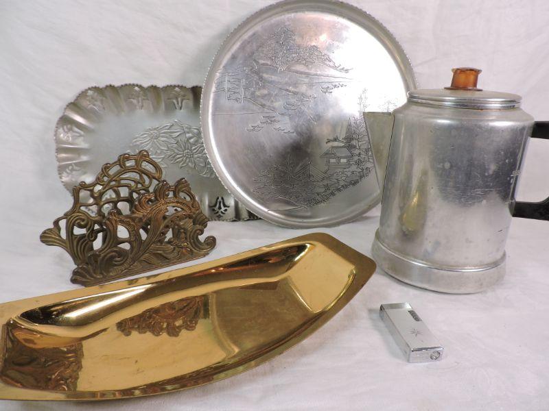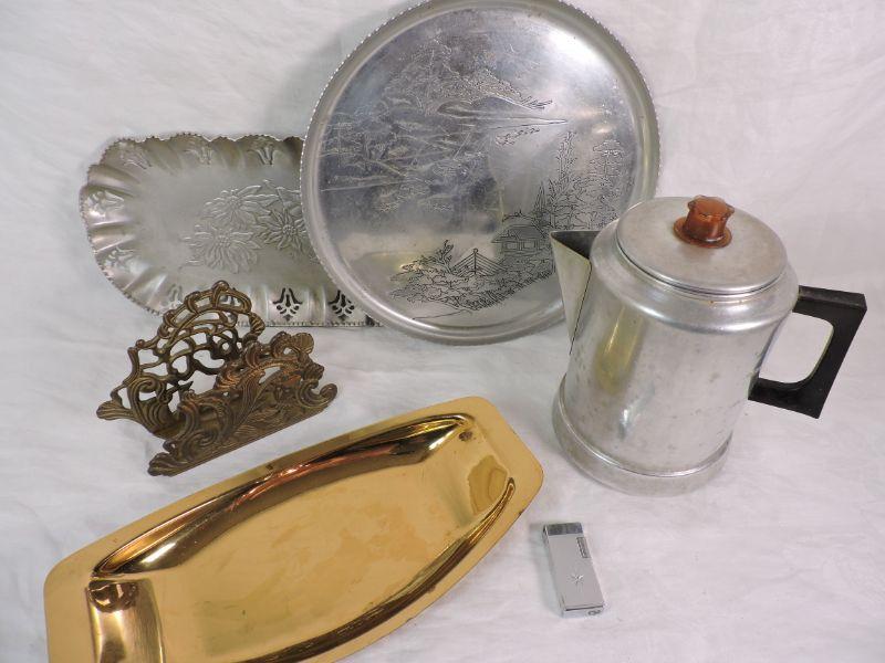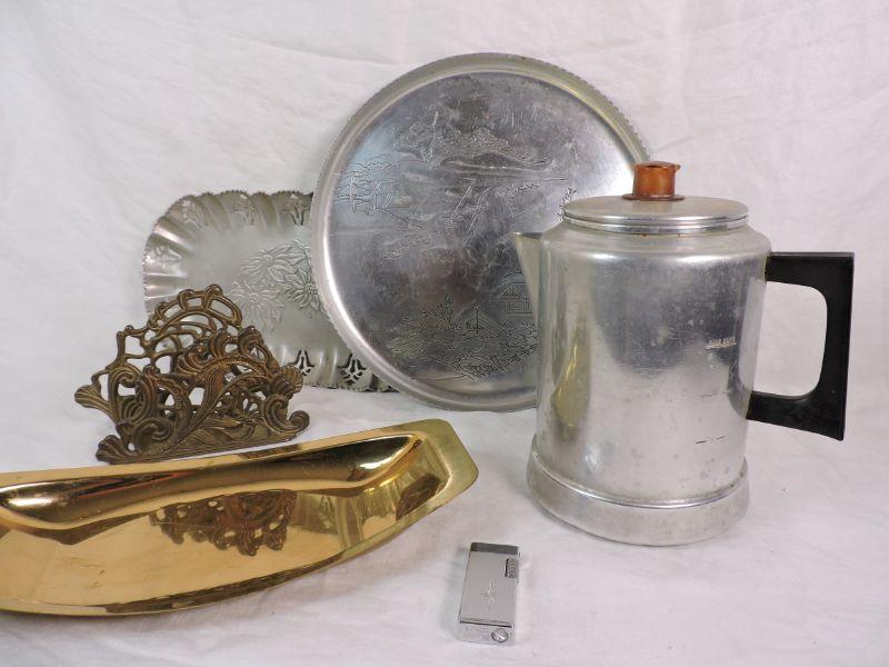 Two aluminum trays, stove top coffee pot, an interesting napkin holder, and a brass bowl. Also, a vintage lighter. Please review all photos and read Terms and Conditions before placing a bid. Pick up is Wednesday, November 20 from 4-7pm and Saturday, November 23 from 9am-2pm in Mantua, New Jersey. All sales are final. All sales are as is, where is. Please bring all boxes, tools, and muscle needed to remove your items. Any photo props are not included. All measurements are approximate. Items come from dog-friendly home.