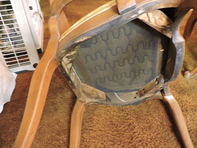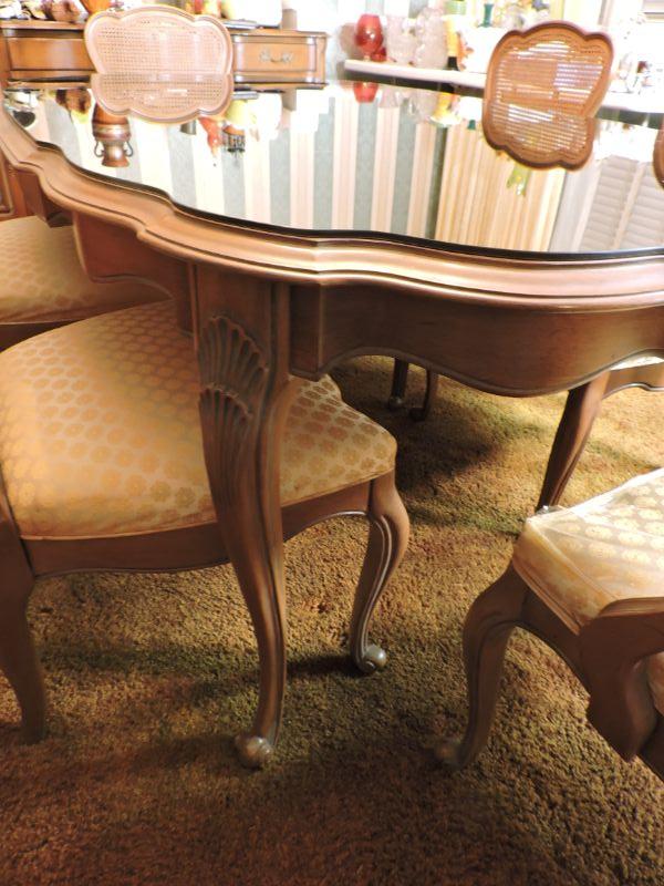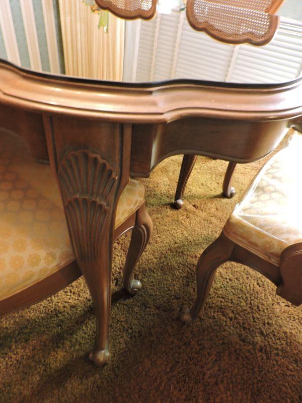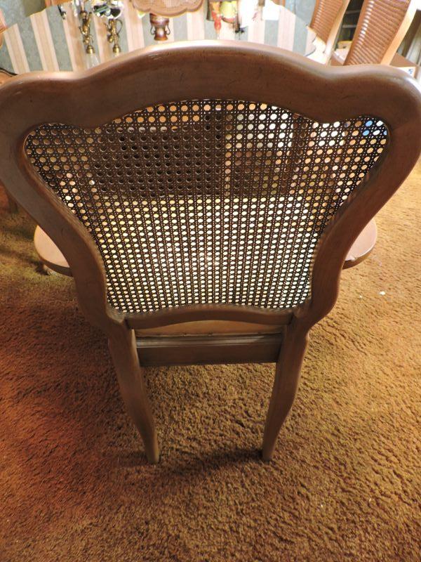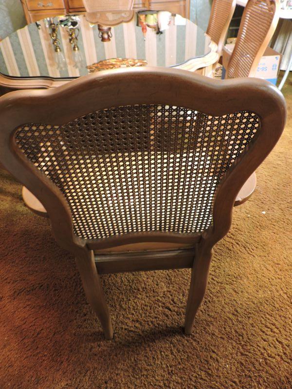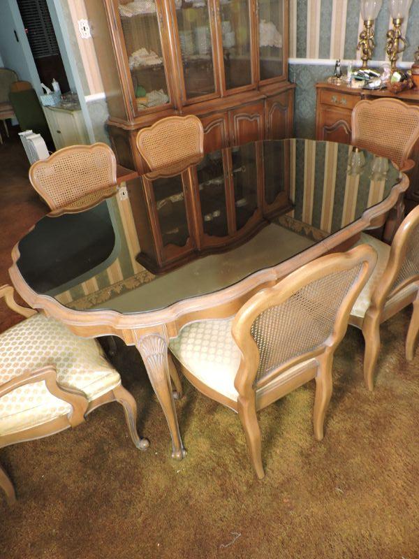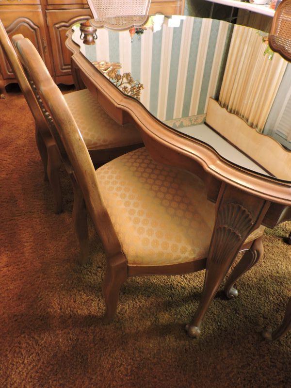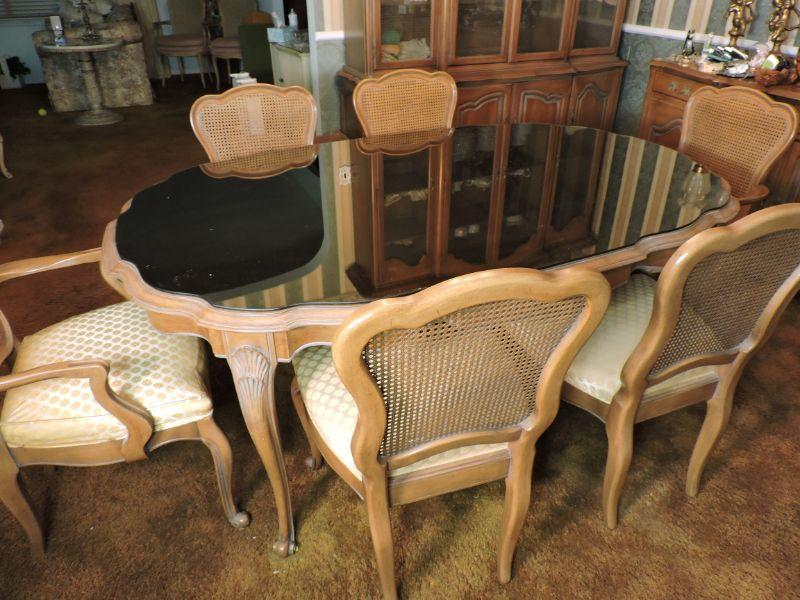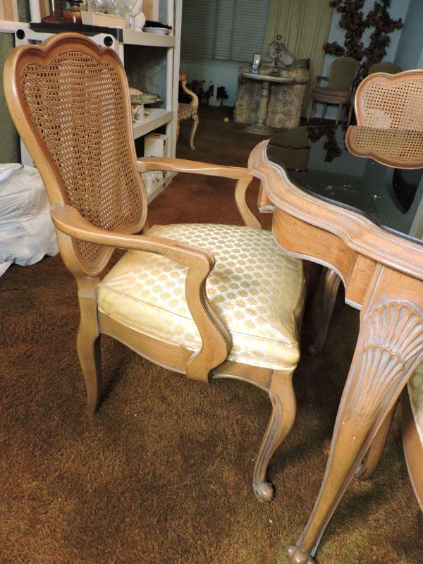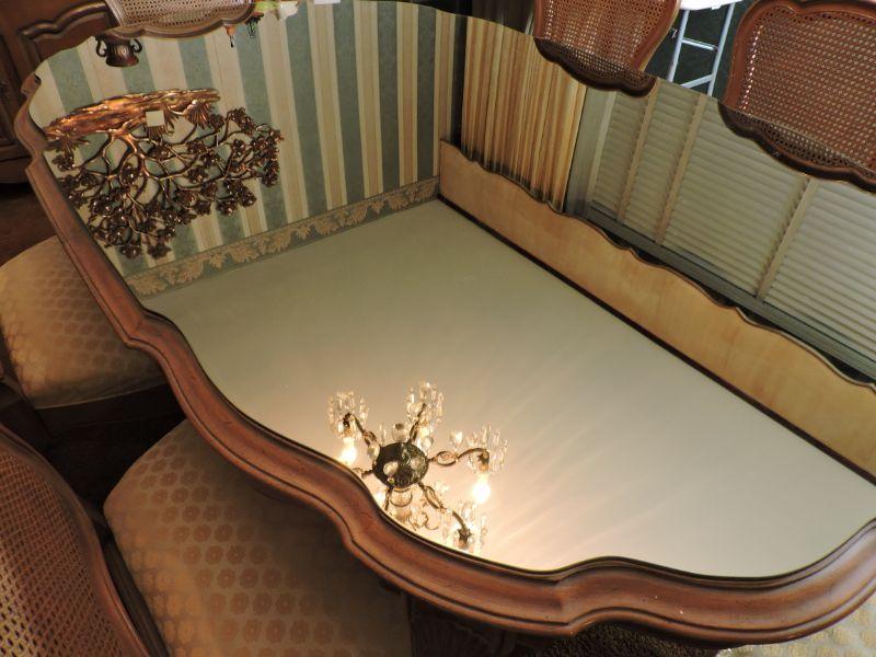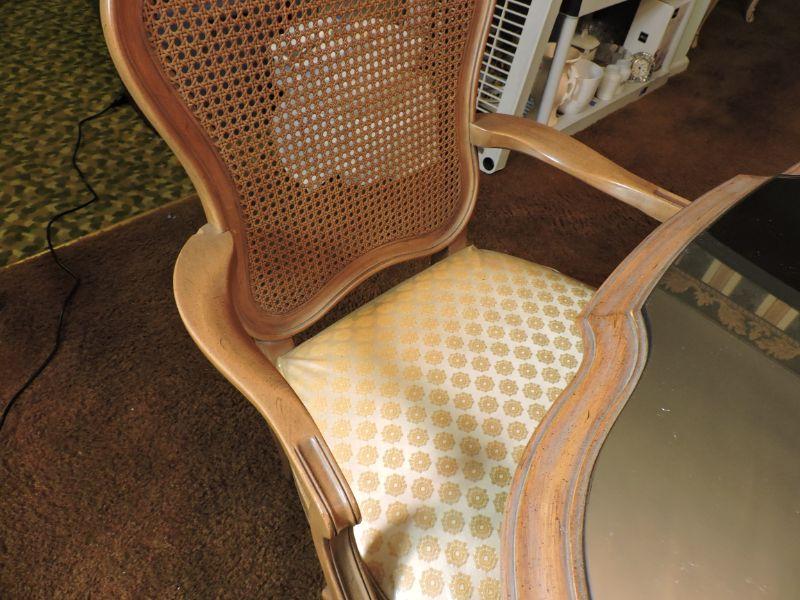 Wood table with French Provincial style. Table has a large stain, but the mirrored top covers it. Six chairs, two of them arm chairs. Nicely upholstered seats and cane backs. Please review all photos and read Terms and Conditions before placing a bid. Pick up is Wednesday, November 20 from 4-7pm and Saturday, November 23 from 9am-2pm in Mantua, New Jersey. All sales are final. All sales are as is, where is. Please bring all boxes, tools, and muscle needed to remove your items. Any photo props are not included. All measurements are approximate. Items come from dog-friendly home.