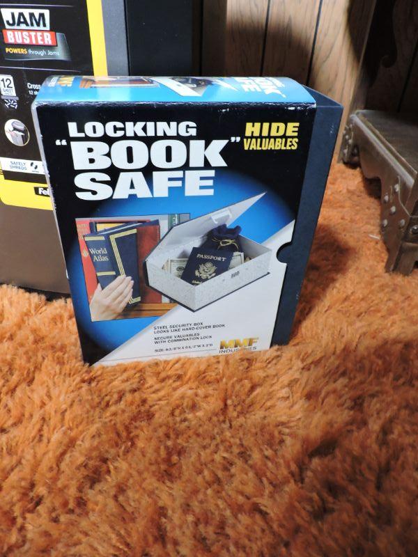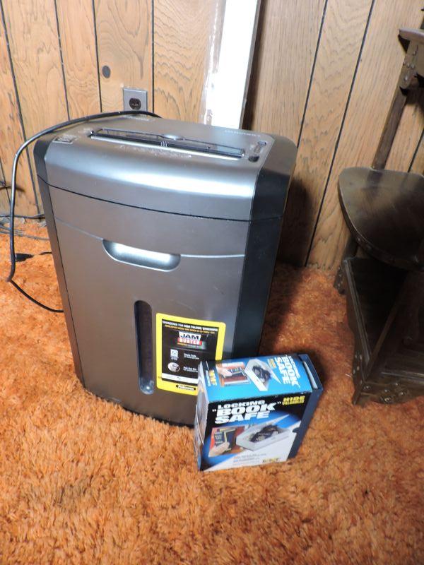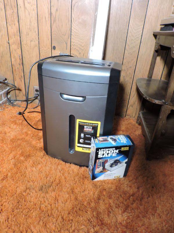 A locking safe that looks like a book, and a shredder, untested. Please review all photos and read Terms and Conditions before placing a bid. Pick up is Wednesday, November 20 from 4-7pm and Saturday, November 23 from 9am-2pm in Mantua, New Jersey. All sales are final. All sales are as is, where is. Please bring all boxes, tools, and muscle needed to remove your items. Any photo props are not included. All measurements are approximate. Items come from dog-friendly home.