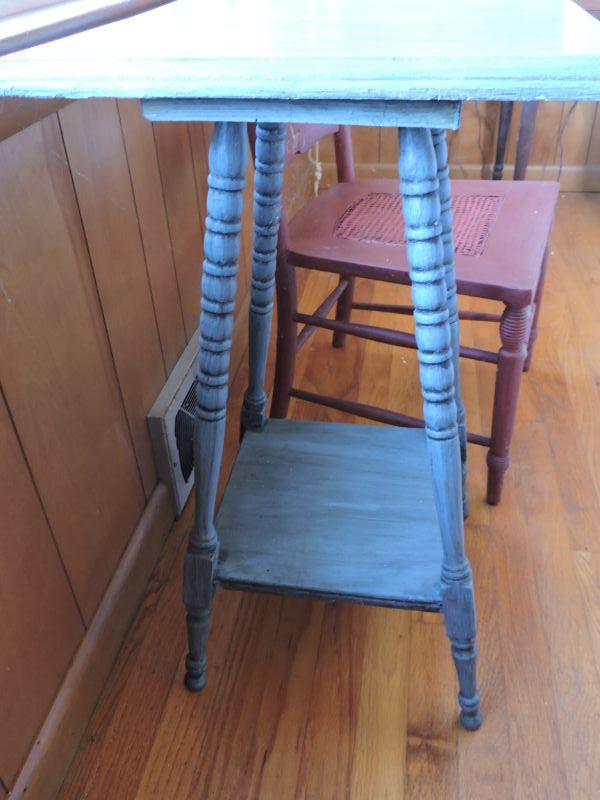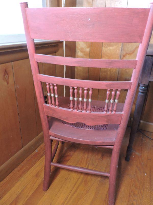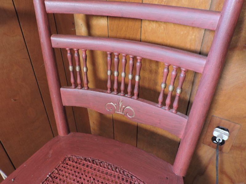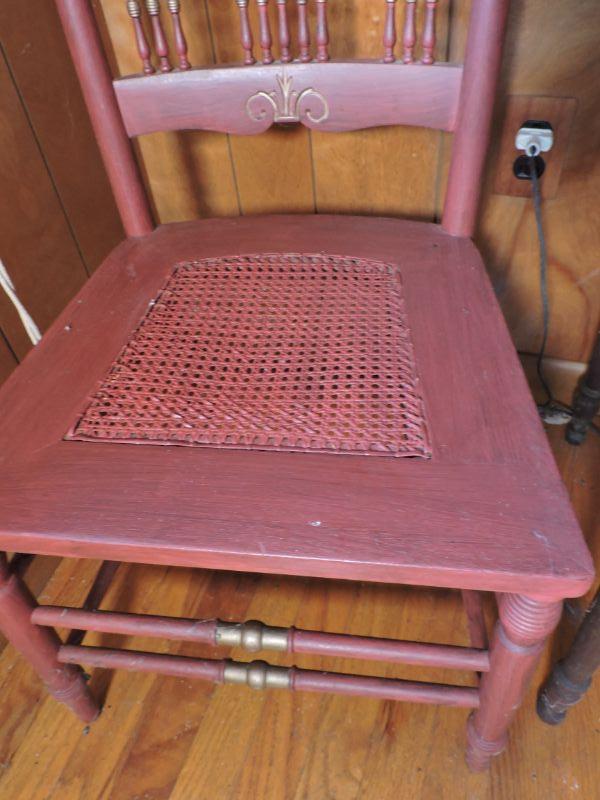 Wooden side table with turned legs and shelf on bottom. Chair has caned seat and back with spindles and carved designs. Please read Terms and Conditions before placing a bid. Pick up is Saturday, November 30 from 9am to 3 pm in Bridgeton, NJ. All sales are final. All sales are as is, where is. Please review all photos. Any props included in photos are not included in listing. All measurements are approximate.