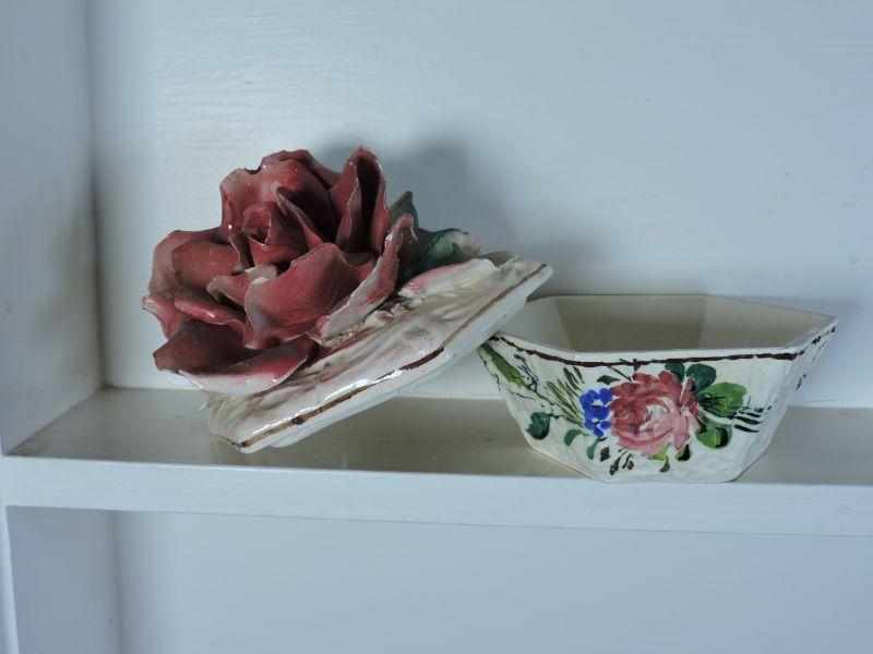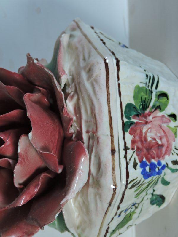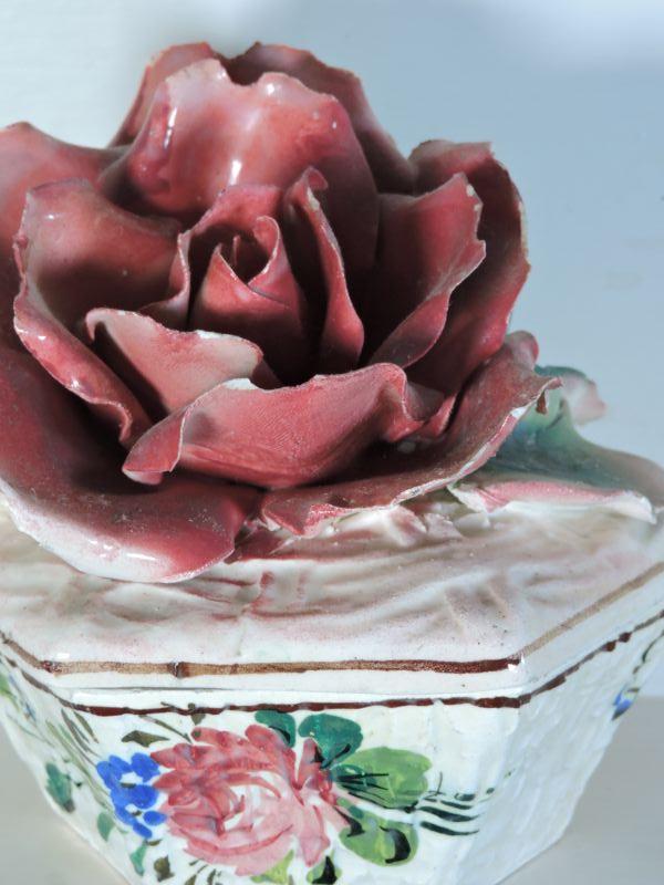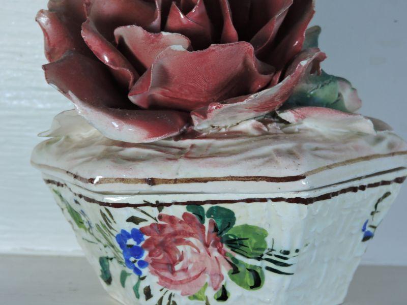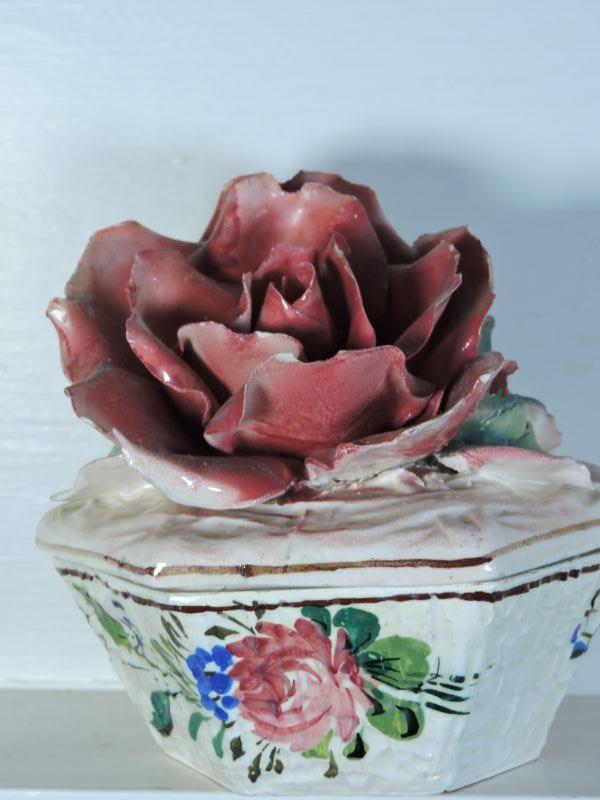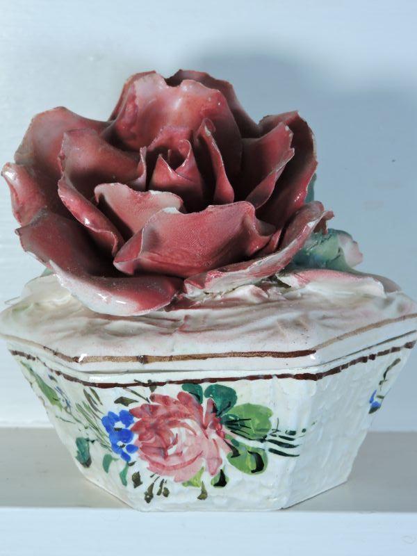 Trinket box with rose. Made in Italy. Please read Terms and Conditions before placing a bid. Pick up is Saturday, November 30 from 9am to 3 pm in Bridgeton, NJ. All sales are final. All sales are as is, where is. Please review all photos. Any props included in photos are not included in listing. All measurements are approximate.