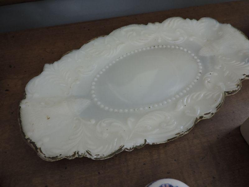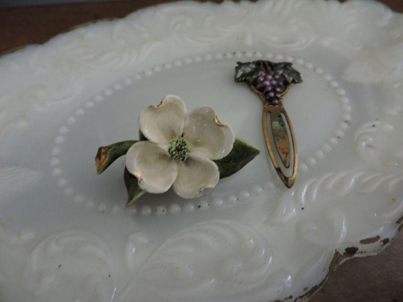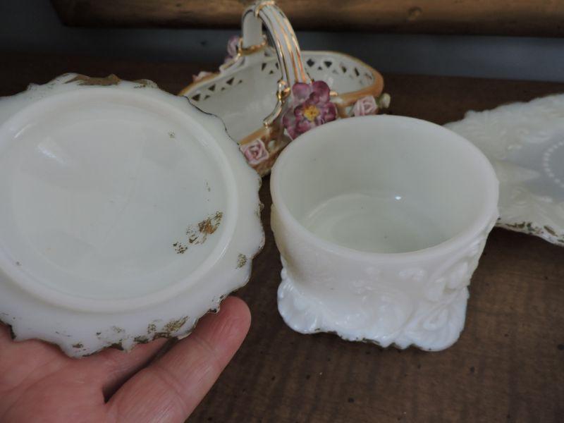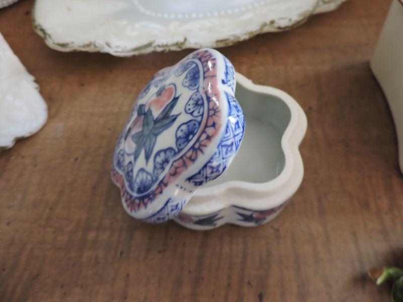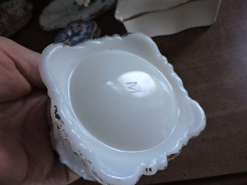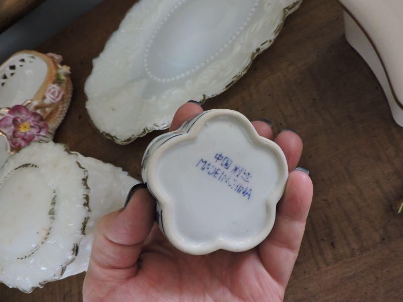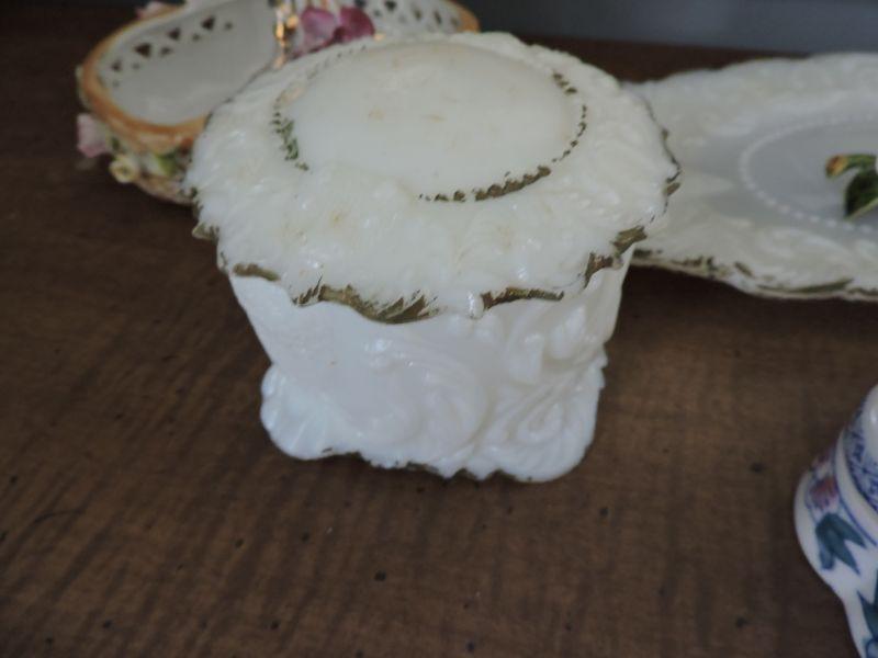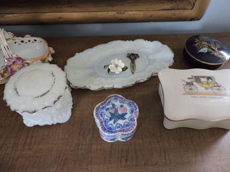 Milk glass and china covered trinket boxes, porcelain basket, flower pin, and more. Please read Terms and Conditions before placing a bid. Pick up is Saturday, November 30 from 9am to 3 pm in Bridgeton, NJ. All sales are final. All sales are as is, where is. Please review all photos. Any props included in photos are not included in listing. All measurements are approximate.