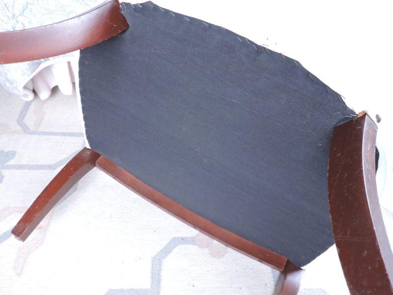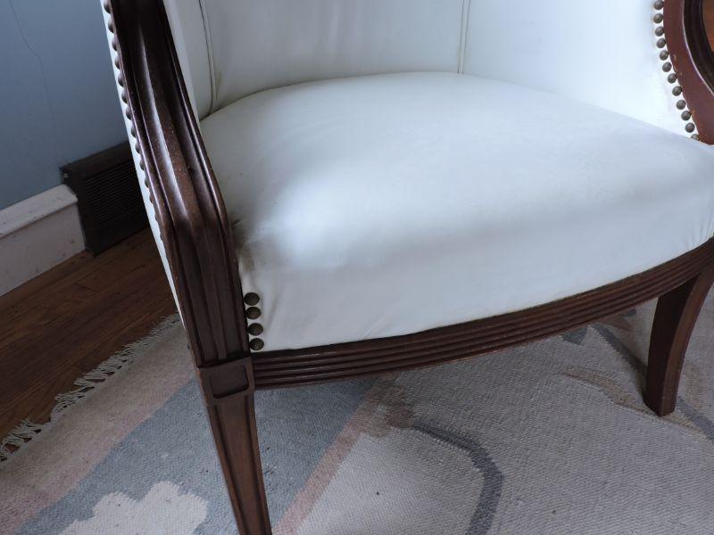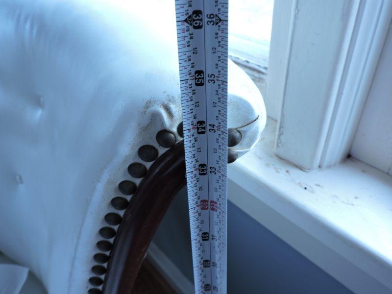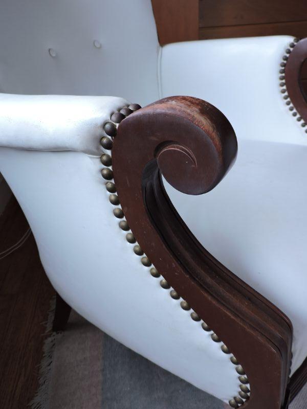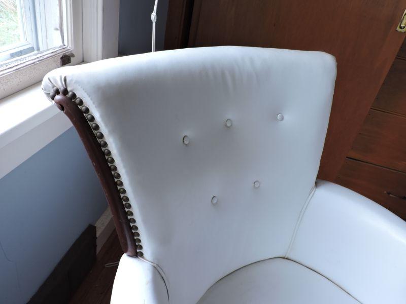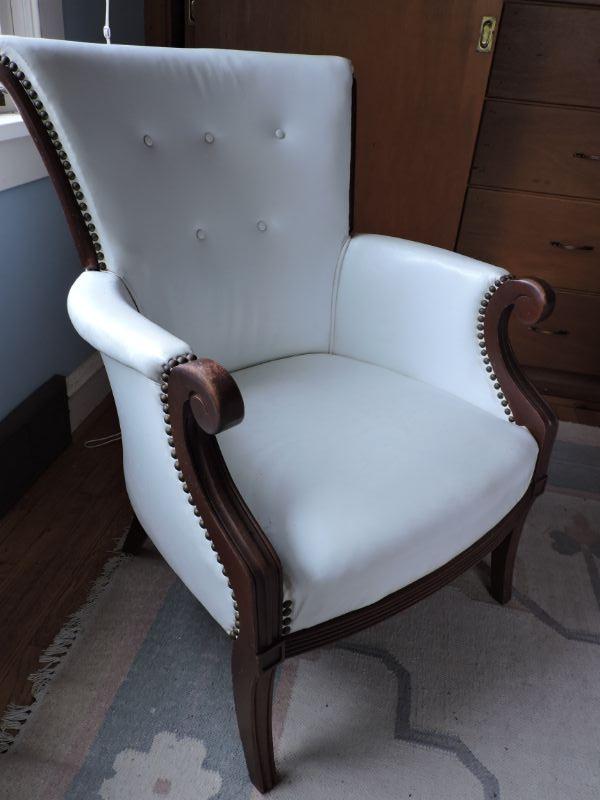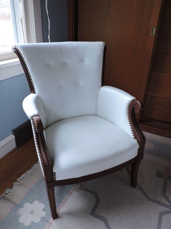 Vintage wooden chair covered in white leather with nail head trim. Please read Terms and Conditions before placing a bid. Pick up is Saturday, November 30 from 9am to 3 pm in Bridgeton, NJ. All sales are final. All sales are as is, where is. Please review all photos. Any props included in photos are not included in listing. All measurements are approximate.