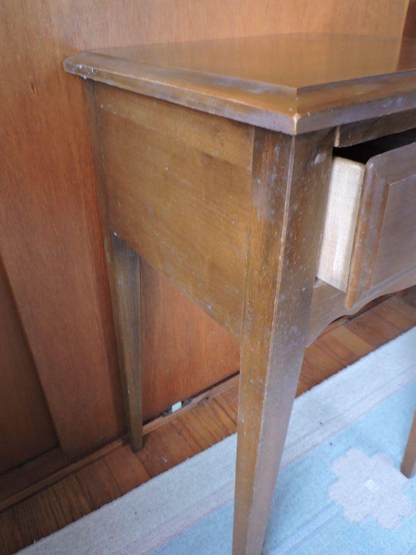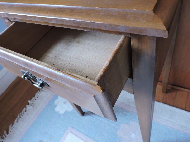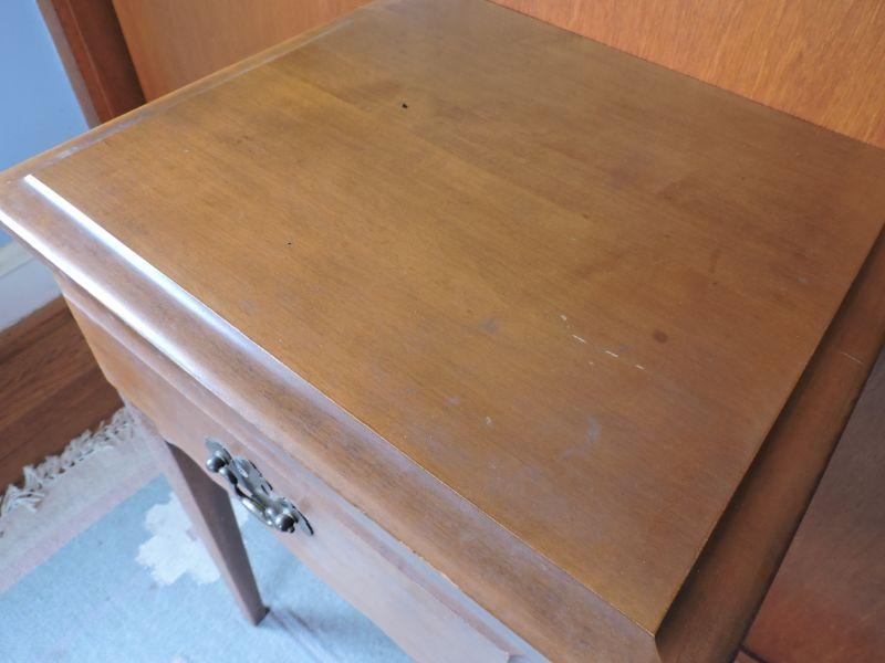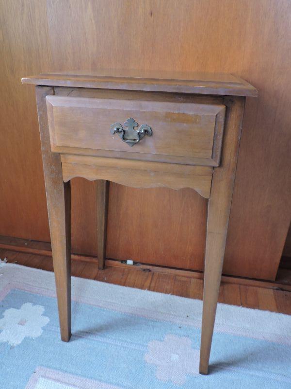 Wooden side table with one drawer. Needs cleaning. Please read Terms and Conditions before placing a bid. Pick up is Saturday, November 30 from 9am to 3 pm in Bridgeton, NJ. All sales are final. All sales are as is, where is. Please review all photos. Any props included in photos are not included in listing. All measurements are approximate.