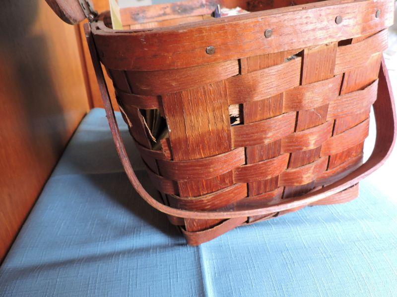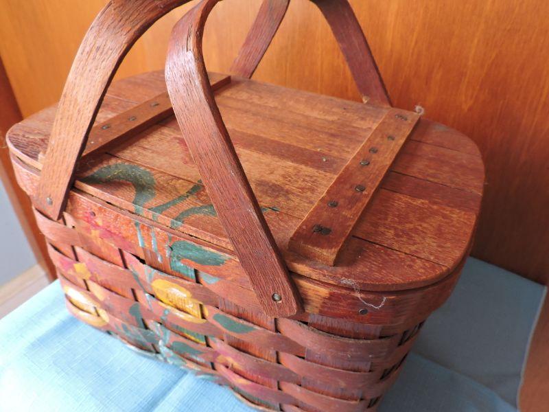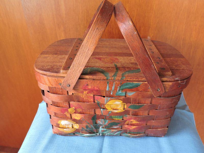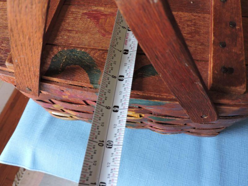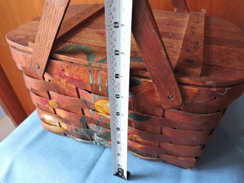 Vintage wooden basket with painted flowers. Has small damage. Contents included. Please read Terms and Conditions before placing a bid. Pick up is Saturday, November 30 from 9am to 3 pm in Bridgeton, NJ. All sales are final. All sales are as is, where is. Please review all photos. Any props included in photos are not included in listing. All measurements are approximate.