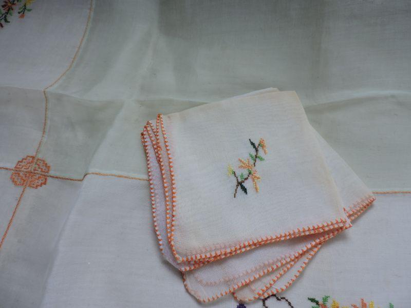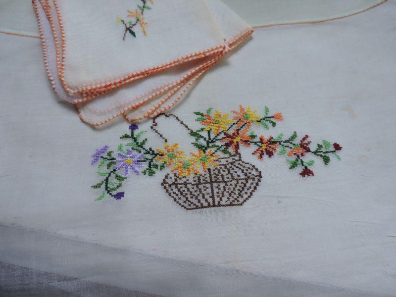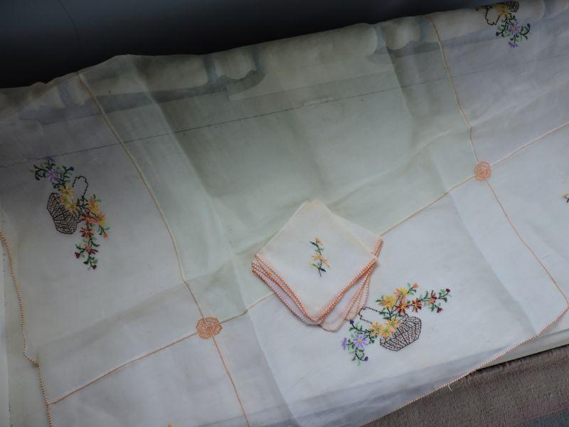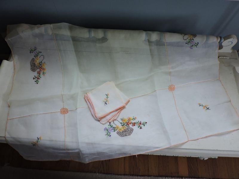 Hand embroidered tablecloth and napkins. Please read Terms and Conditions before placing a bid. Pick up is Saturday, November 30 from 9am to 3 pm in Bridgeton, NJ. All sales are final. All sales are as is, where is. Please review all photos. Any props included in photos are not included in listing. All measurements are approximate.