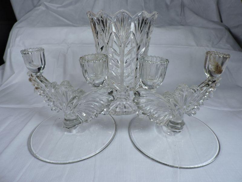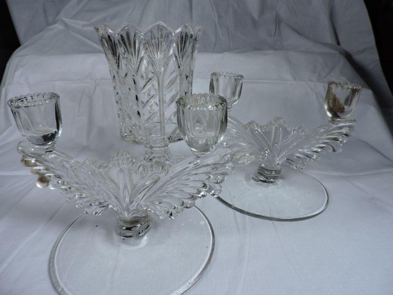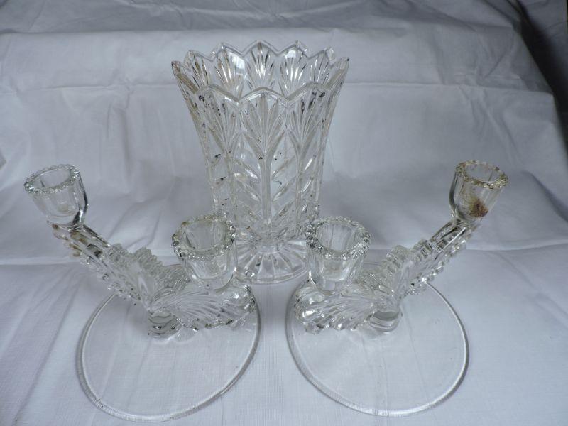 Vase with scalloped top, and a set of candle holders. Nice center piece. Please read Terms and Conditions before placing a bid. Pick up is Saturday, November 30 from 9am to 3 pm in Bridgeton, NJ. All sales are final. All sales are as is, where is. Please review all photos. Any props included in photos are not included in listing. All measurements are approximate.