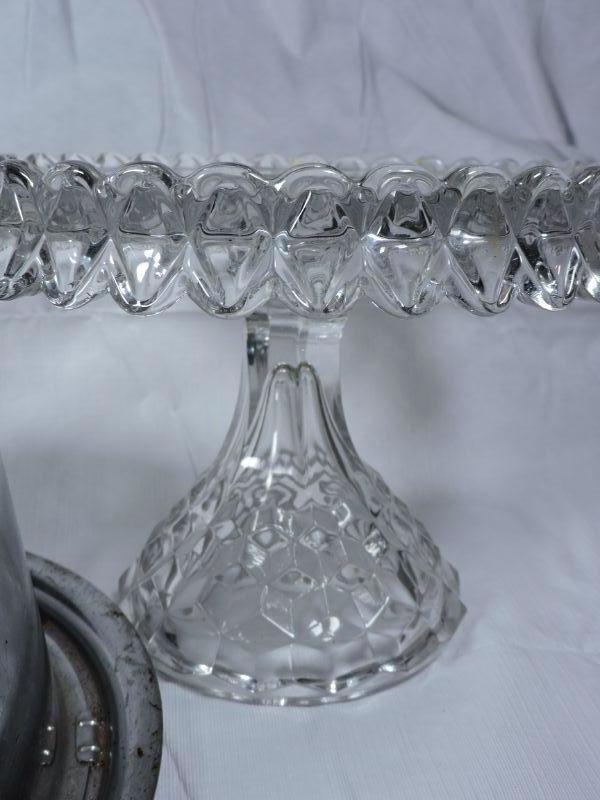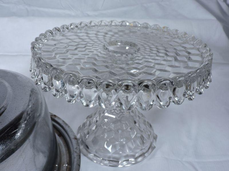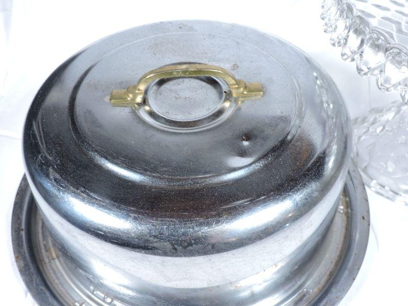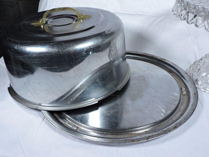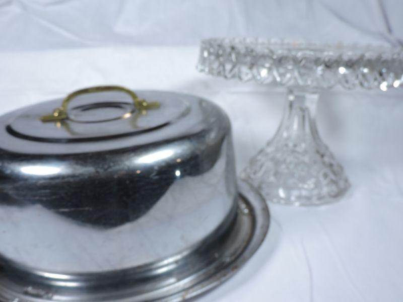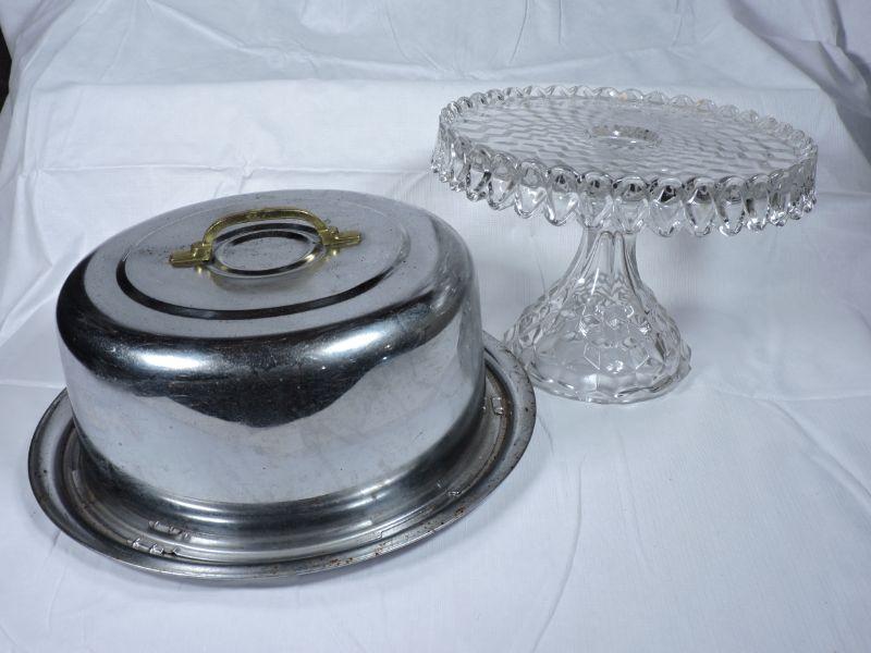 Vintage glass cake stand and a stainless steel carrier. Please read Terms and Conditions before placing a bid. Pick up is Saturday, November 30 from 9am to 3 pm in Bridgeton, NJ. All sales are final. All sales are as is, where is. Please review all photos. Any props included in photos are not included in listing. All measurements are approximate.