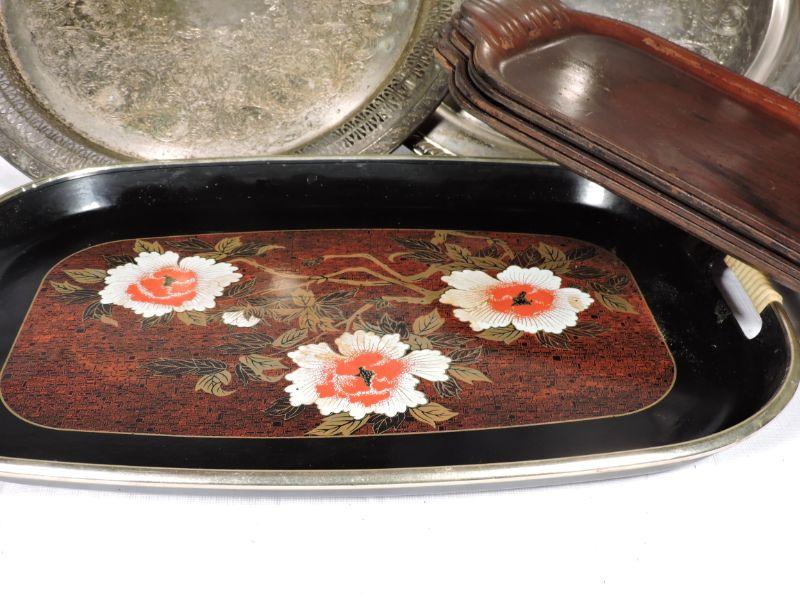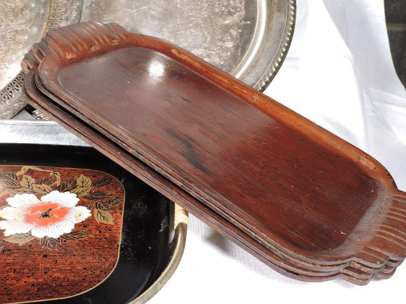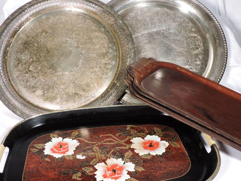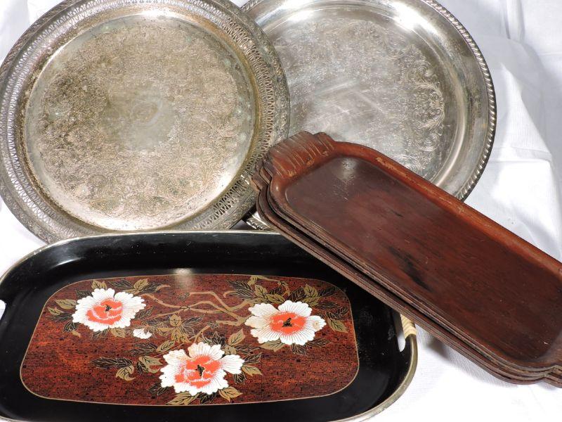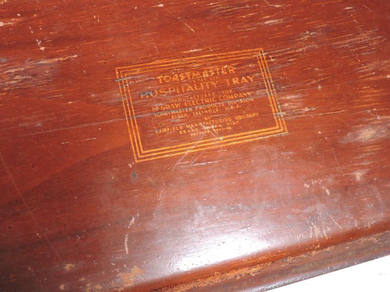 Silver plate, orient, and wooden Toastmaster Hospitality Trays. Please read Terms and Conditions before placing a bid. Pick up is Saturday, November 30 from 9am to 3 pm in Bridgeton, NJ. All sales are final. All sales are as is, where is. Please review all photos. Any props included in photos are not included in listing. All measurements are approximate.