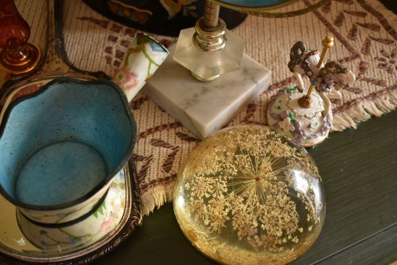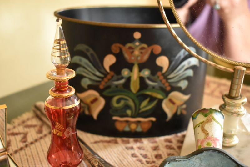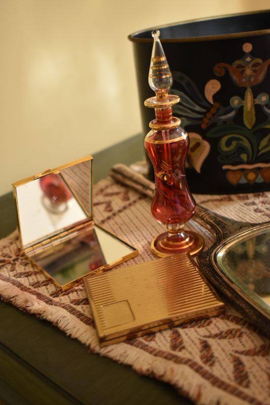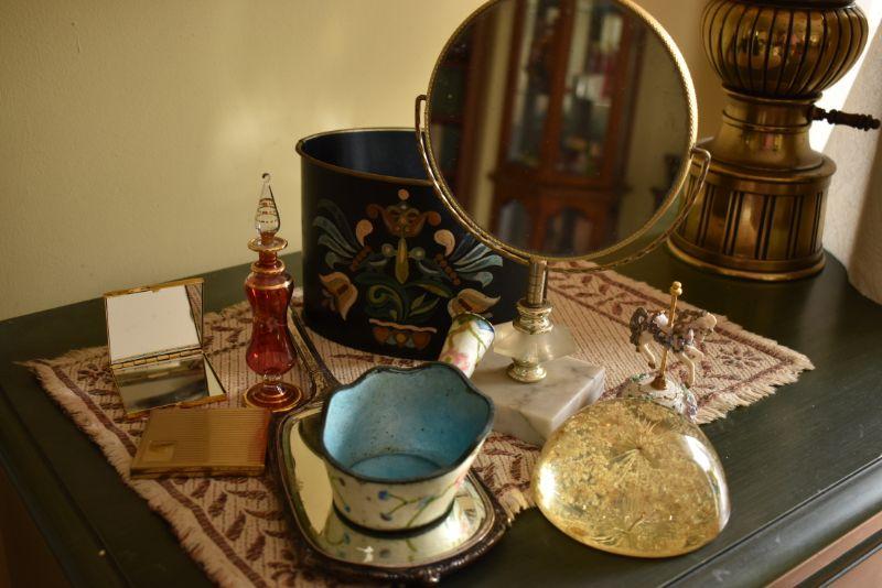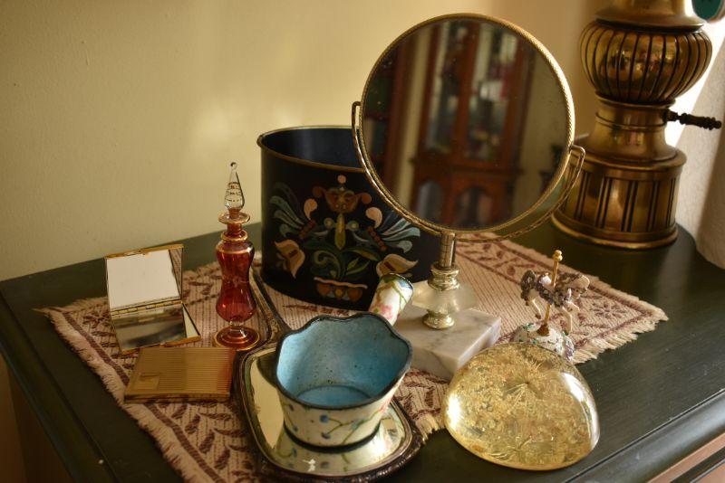 Magnifying mirror on marble stand, pretty perfume bottle and more in this lot! Please read Terms and Conditions before placing a bid. Pick up is Saturday, November 30 from 9am to 3 pm in Bridgeton, NJ. All sales are final. All sales are as is, where is. Please review all photos. Any props included in photos are not included in listing. All measurements are approximate.