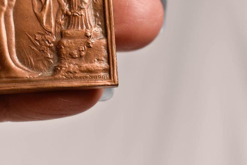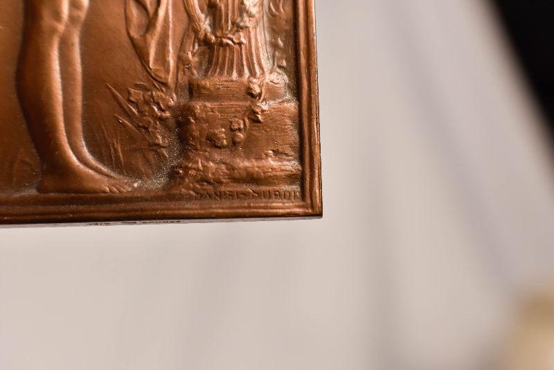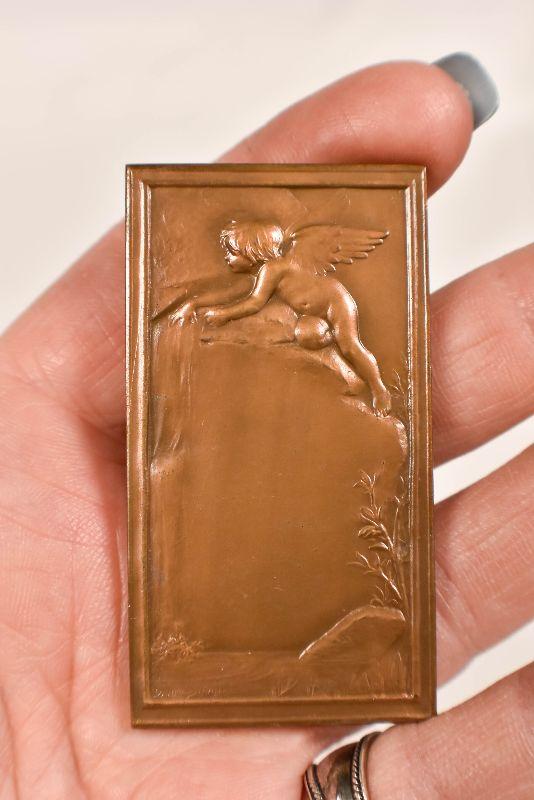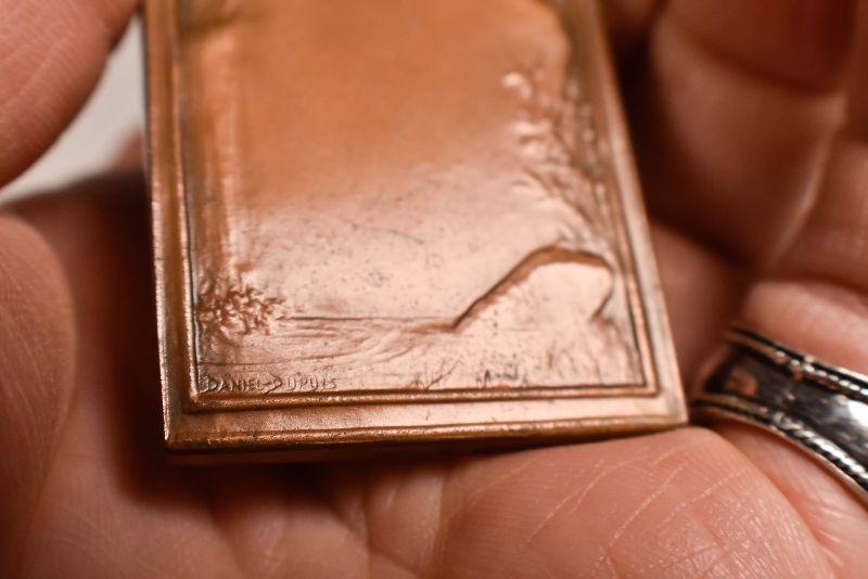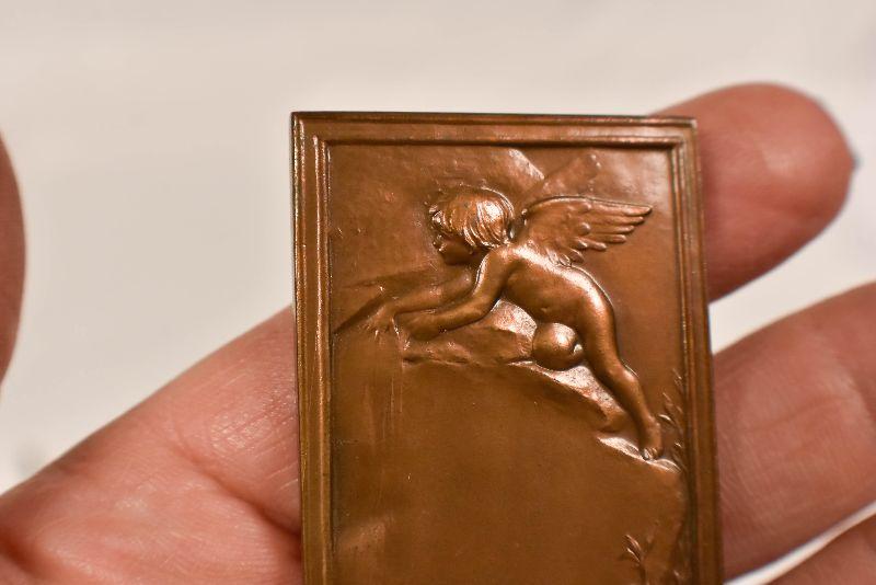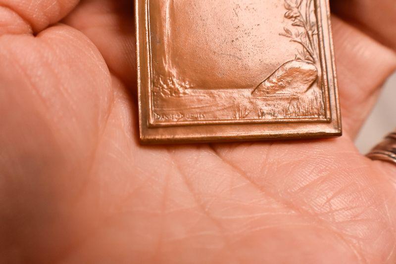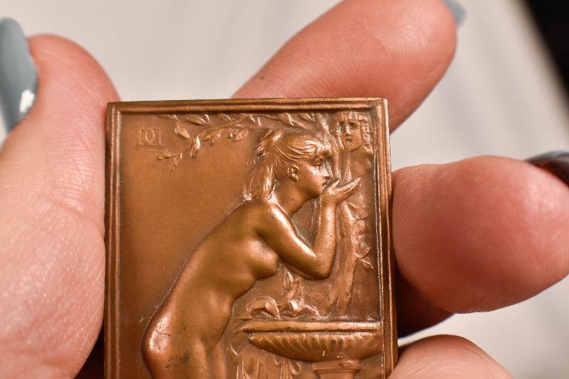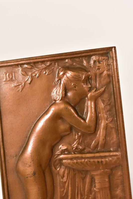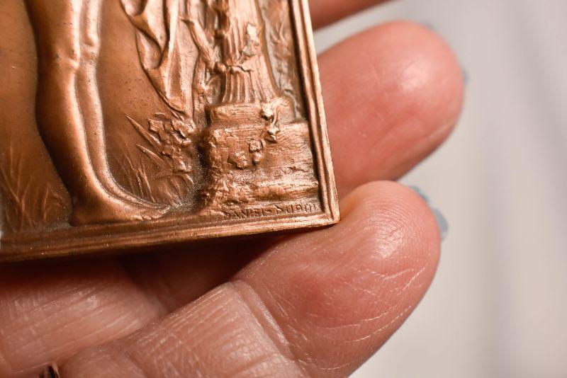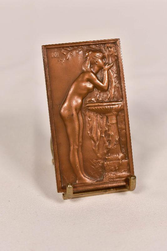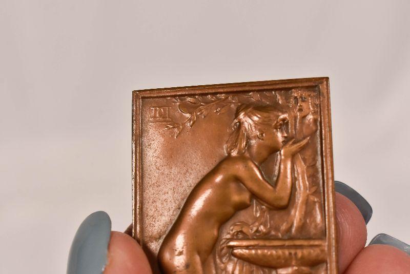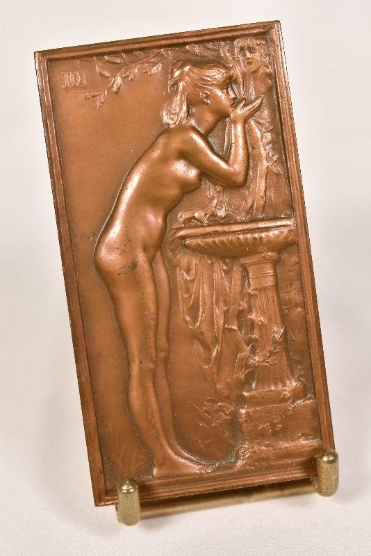 A rare find here, bronze plaquette "The Spring" by Daniel Dupuis. Standing nude girl drinking at fountain (on front). Small male angel, crawling along rock discovering a spring (on back.)