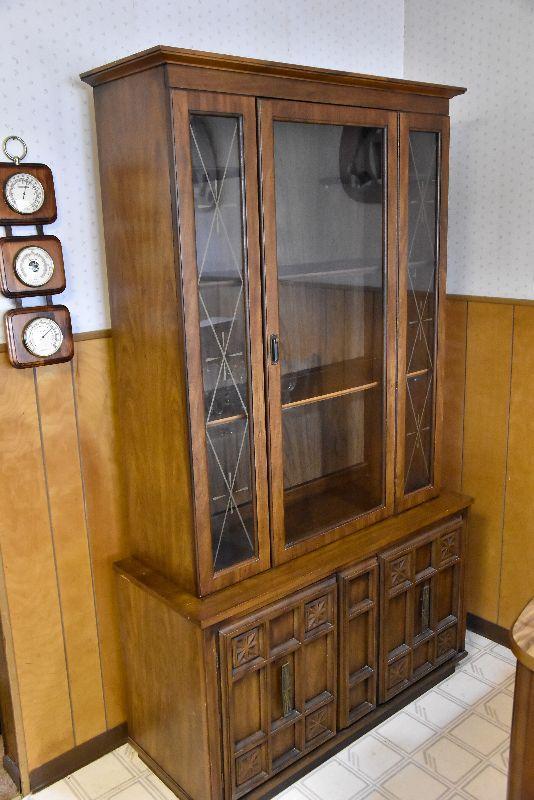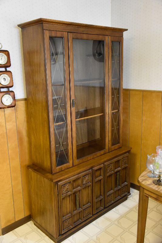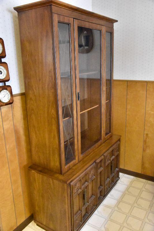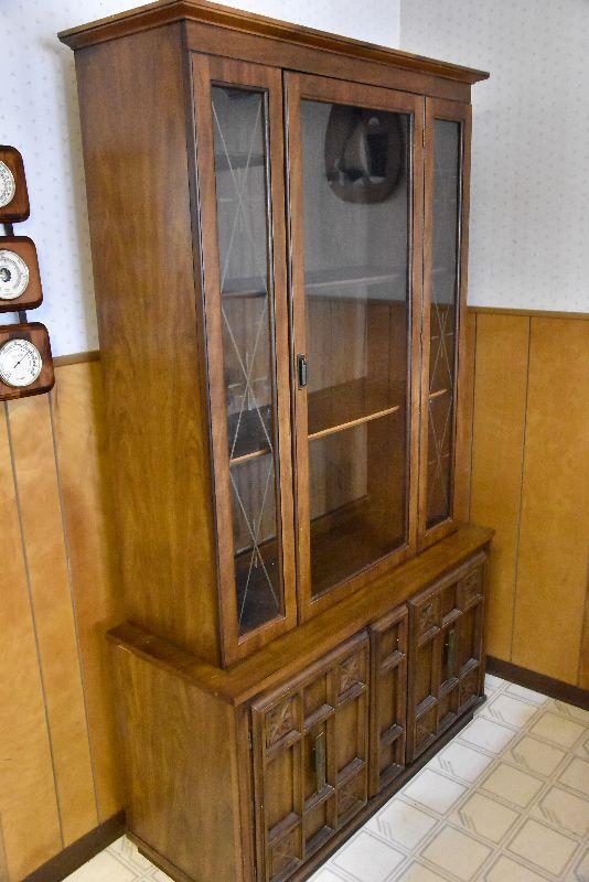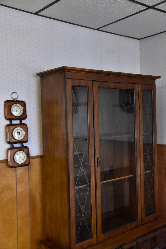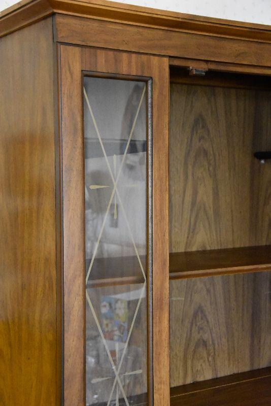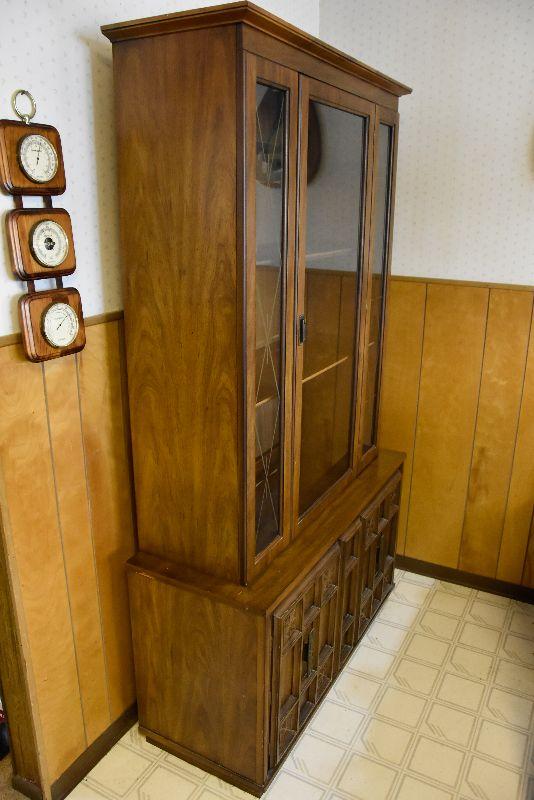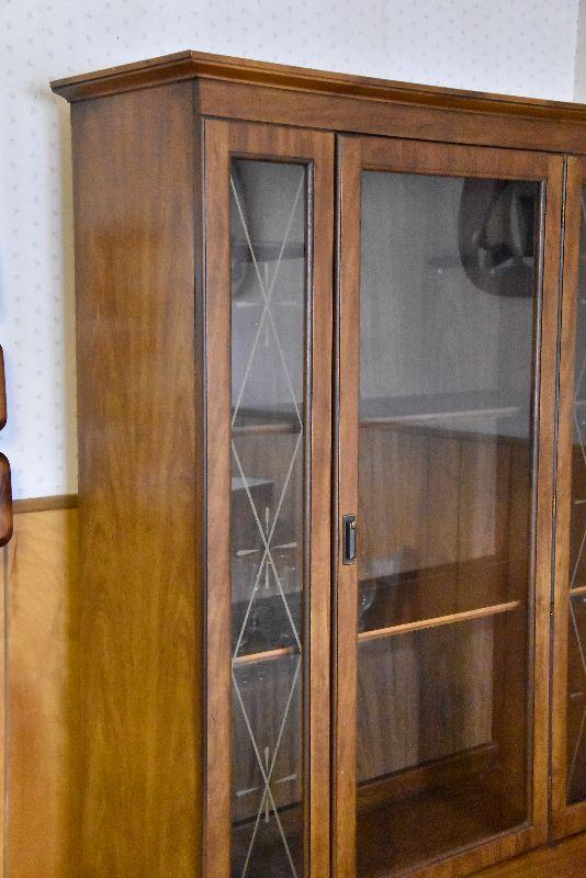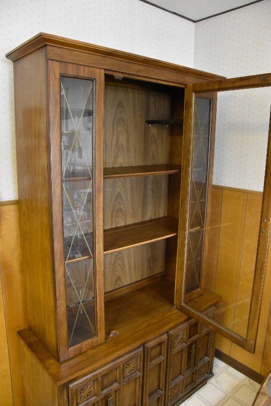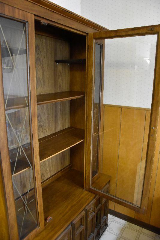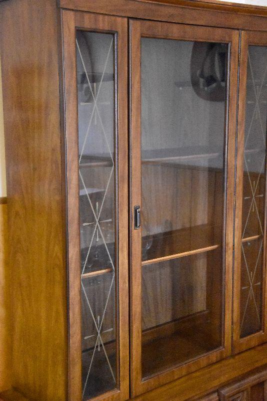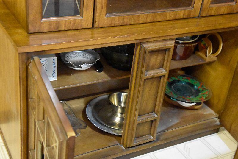 Wooden cabinet with glass doors and wooden shelves. Bottom has storage area with one shelf. Heavy, bring help to move.