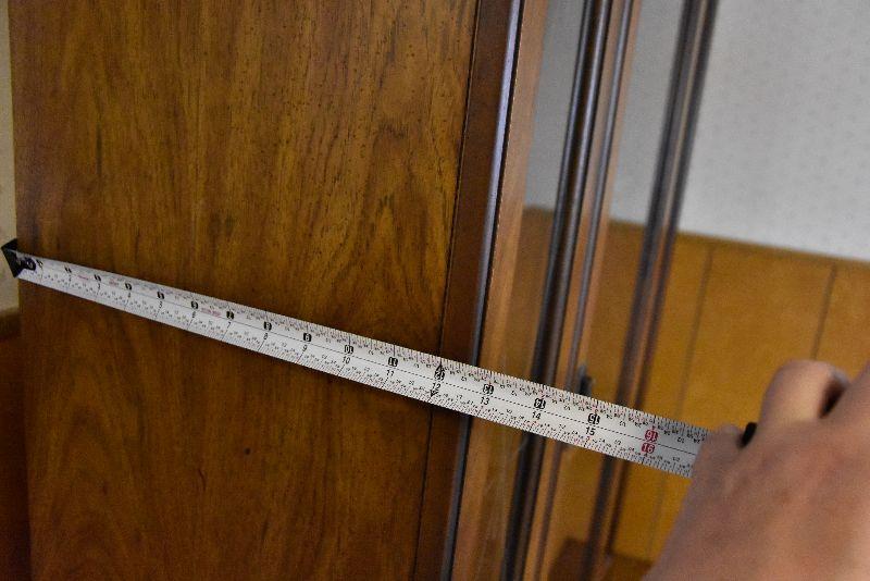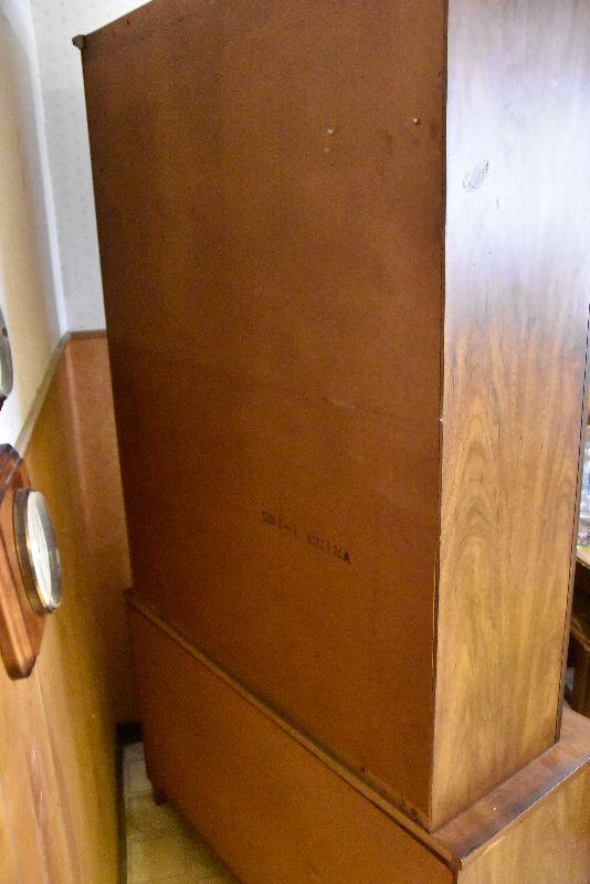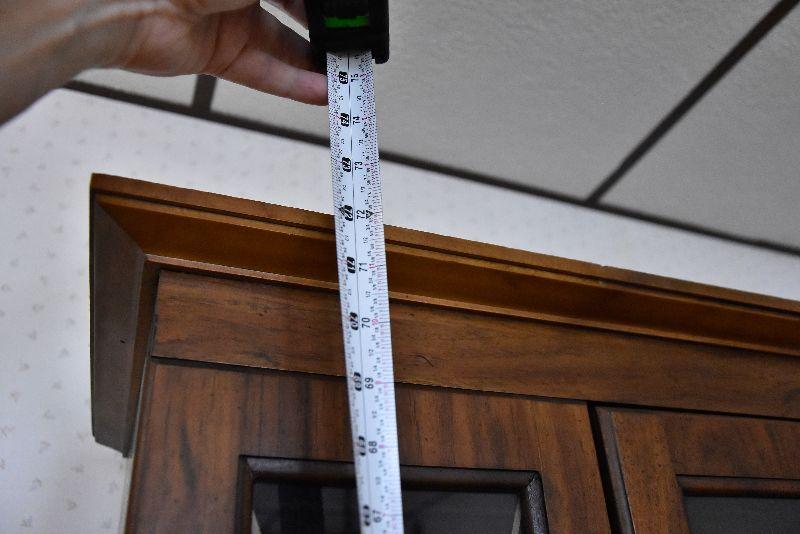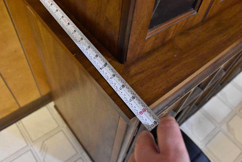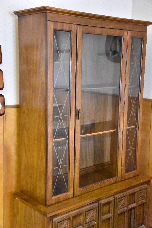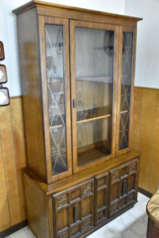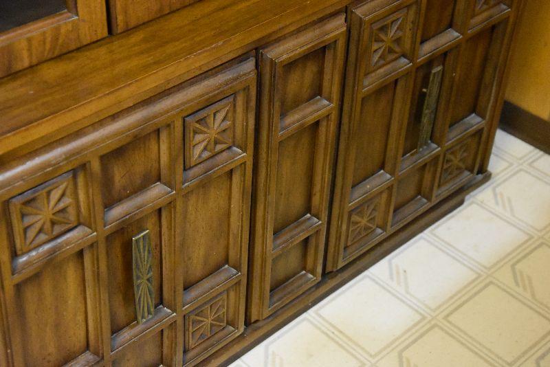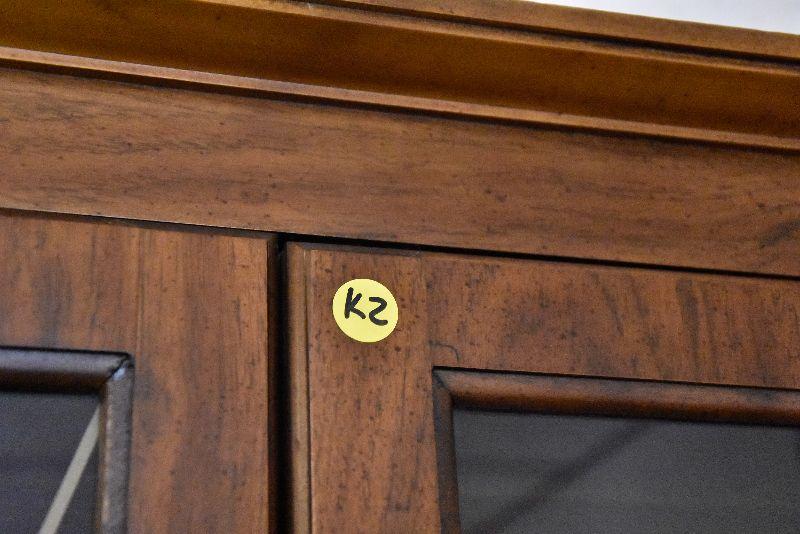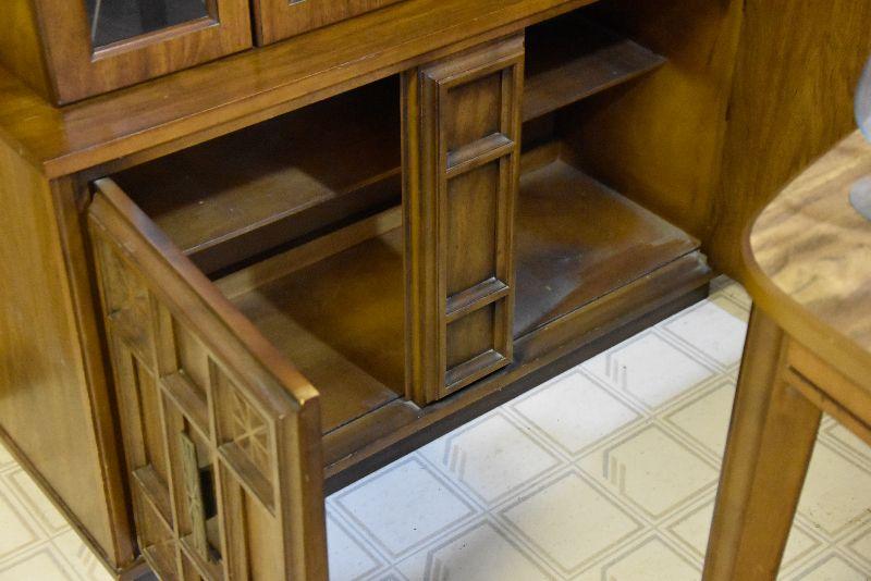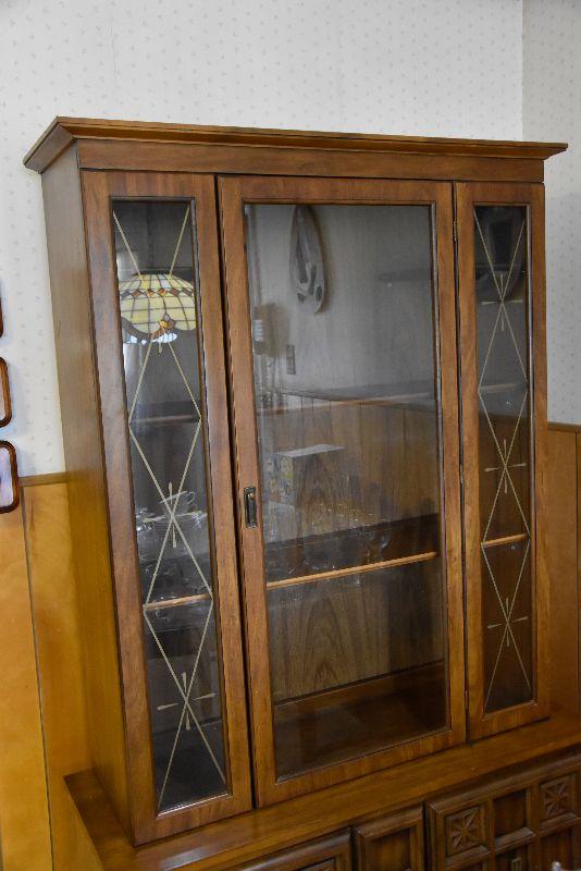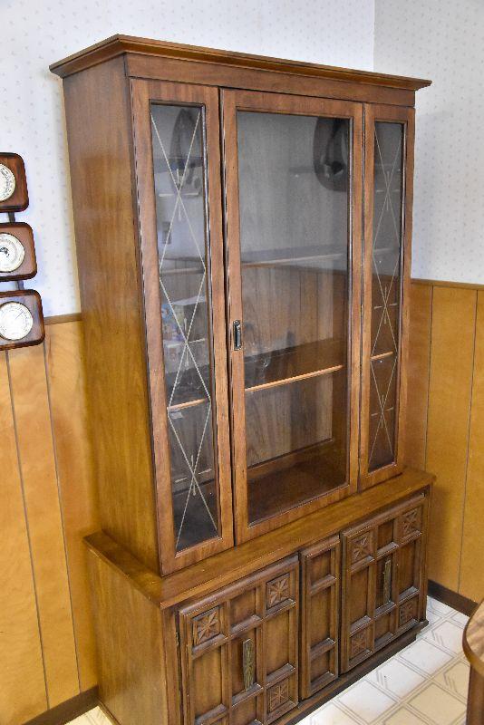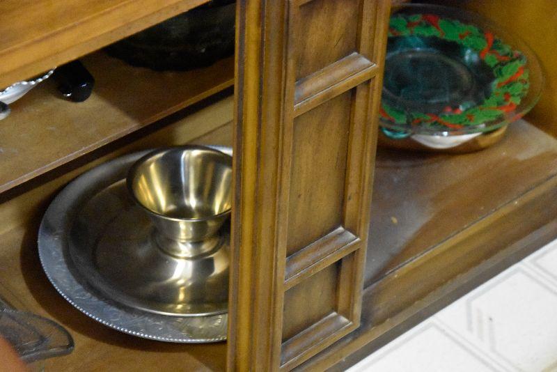 Wooden cabinet with glass doors and wooden shelves. Bottom has storage area with one shelf. Heavy, bring help to move.