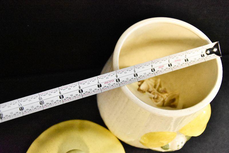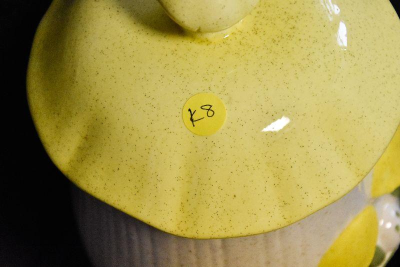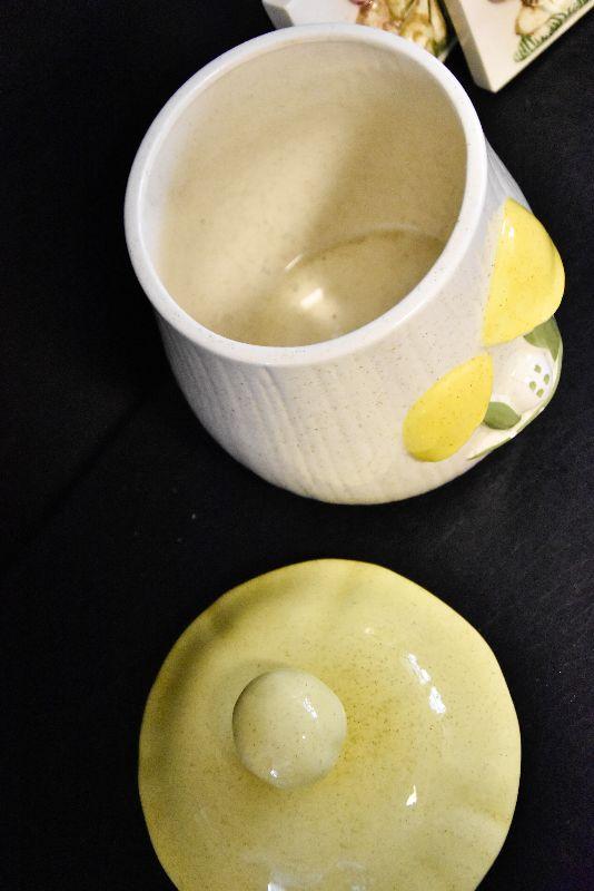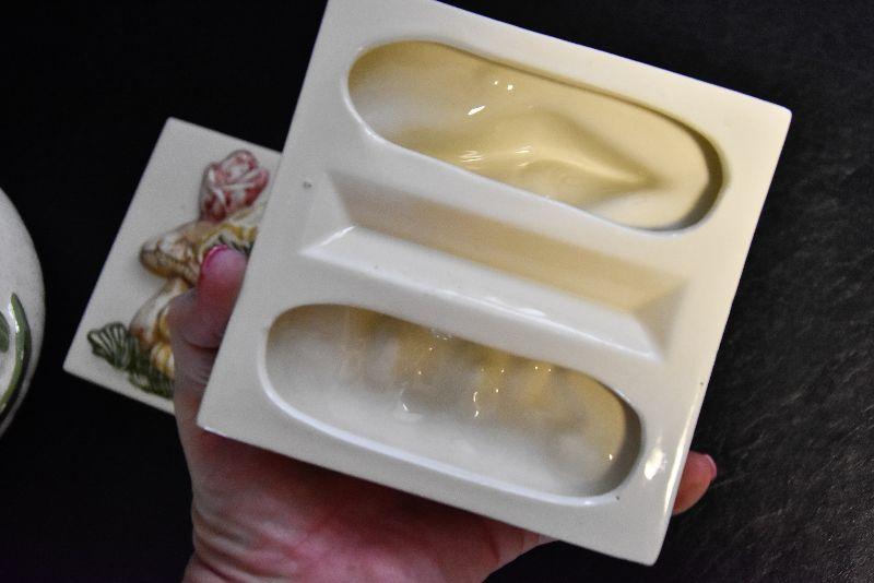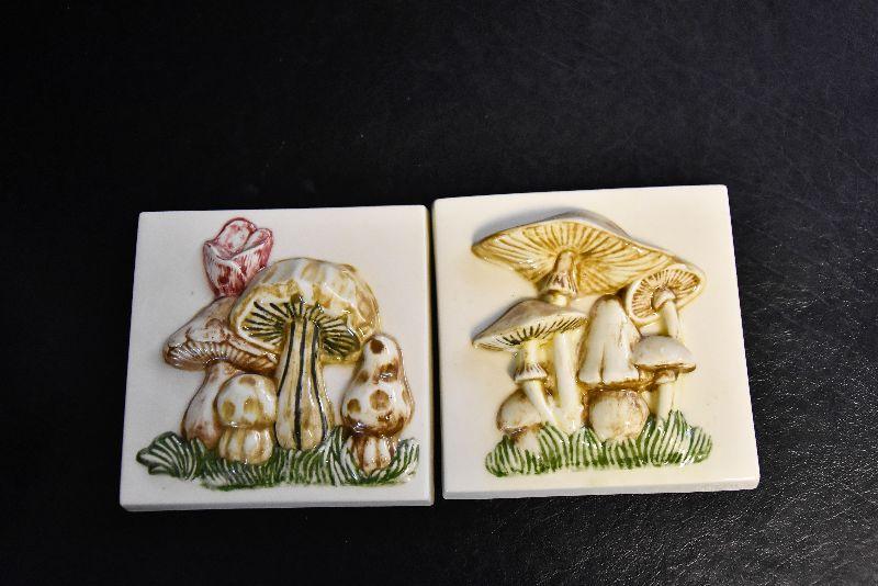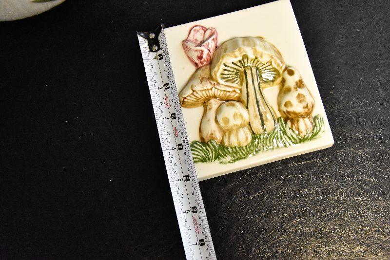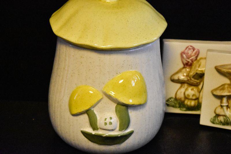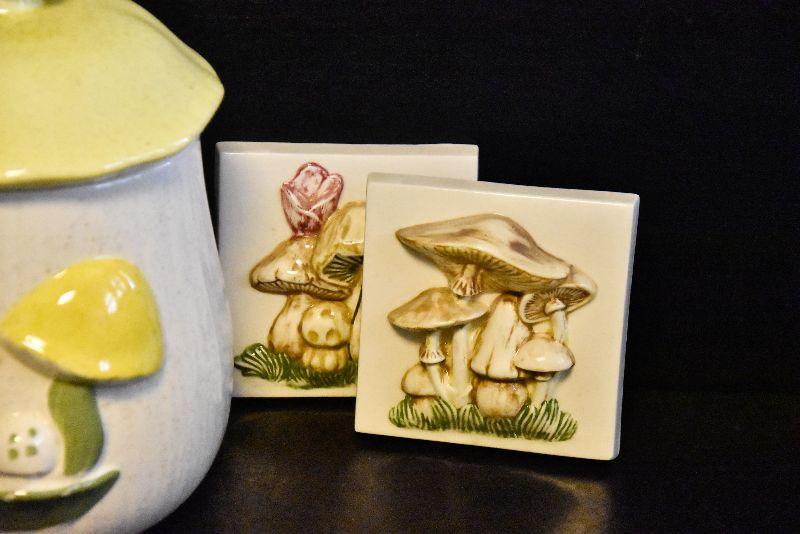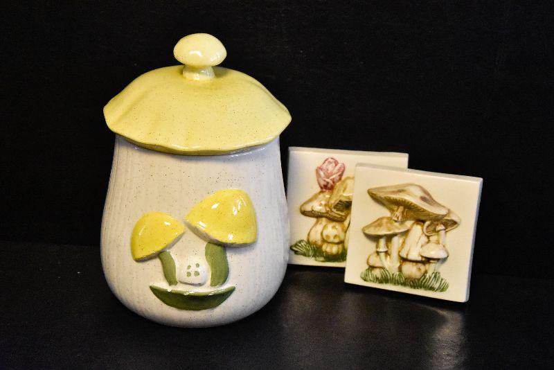 Vintage canister with mushrooms, and two vintage, ceramic wall plaques, with mushroom design.