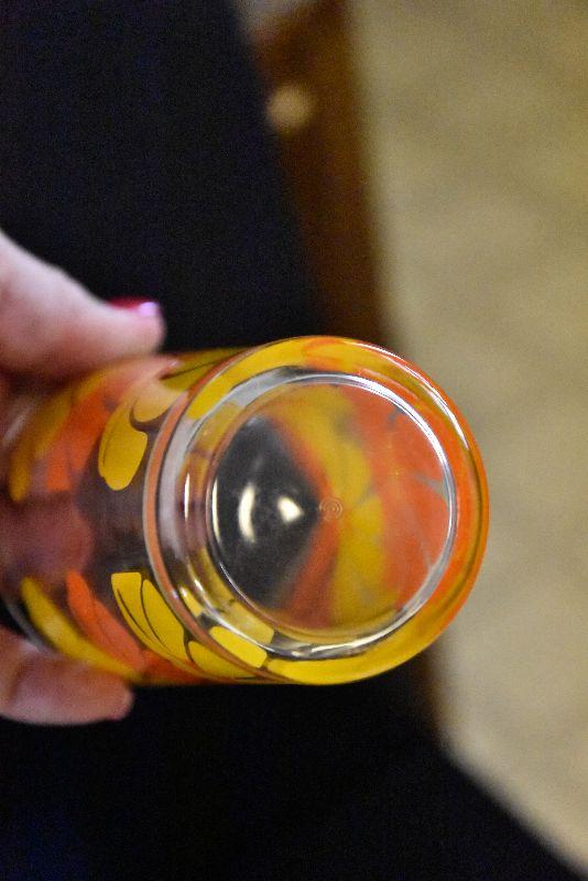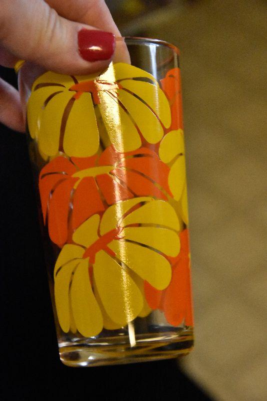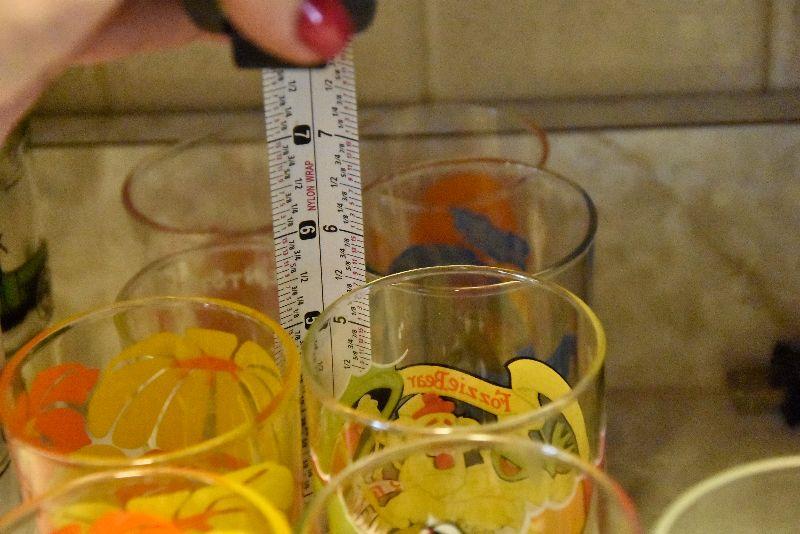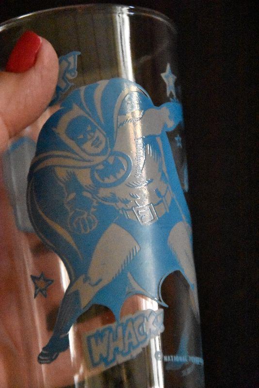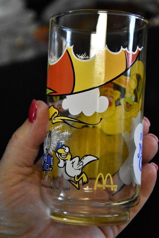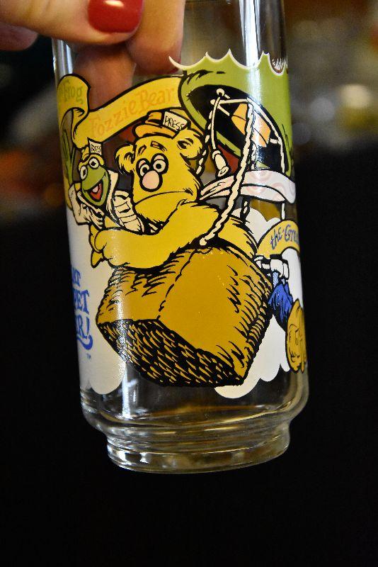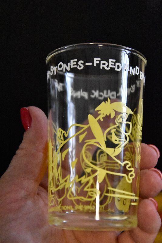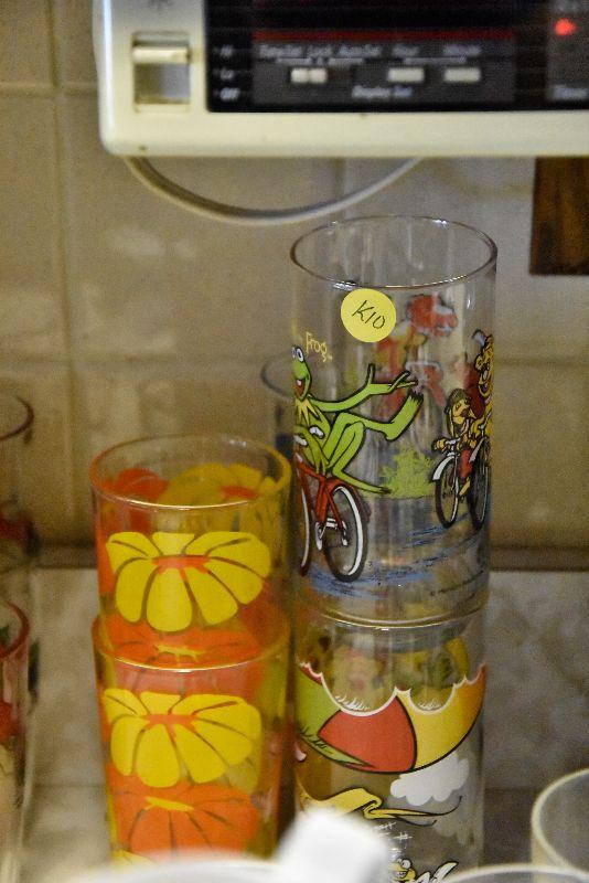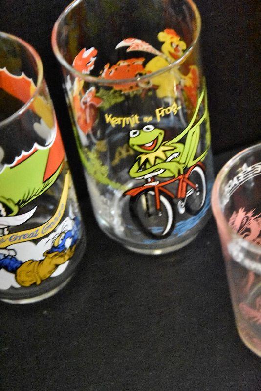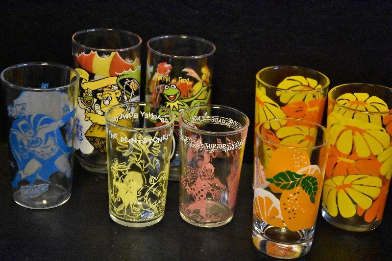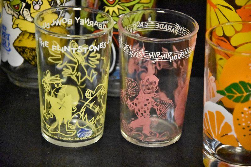 Colorful selection of vintage drinking glasses. McDonalds glasses with Kermit the Frog, a Batman glass, Fred Flintstone, and more. Bring box for packing.