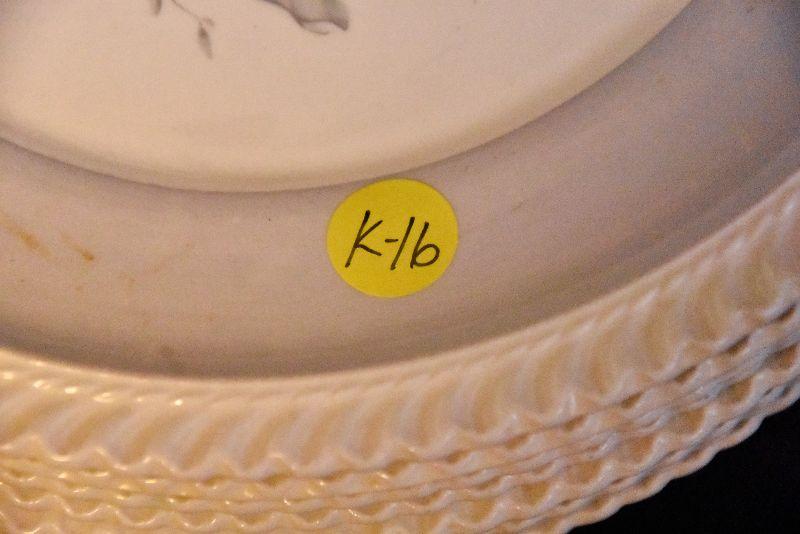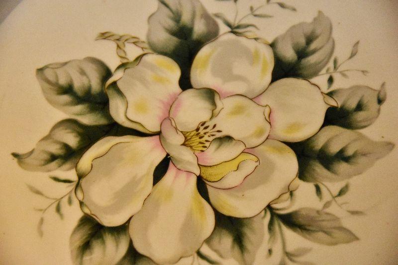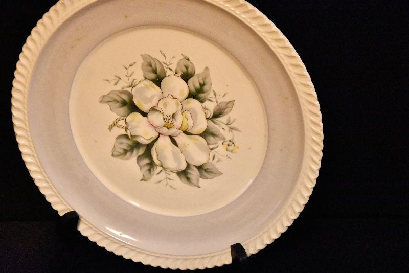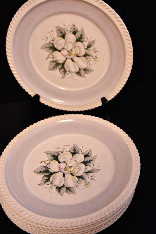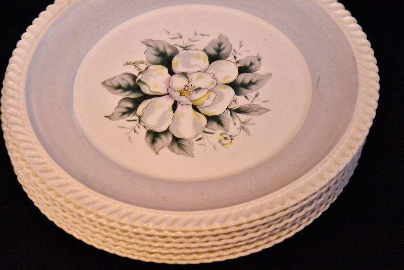 Seven dinner plates in the White Magnolia pattern with fluted rim.. No chips.