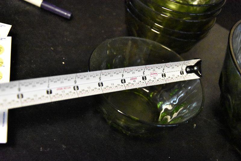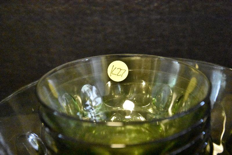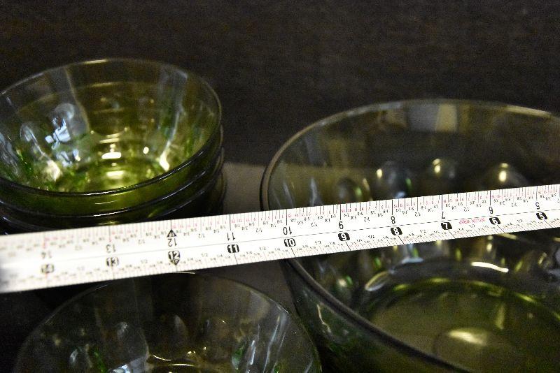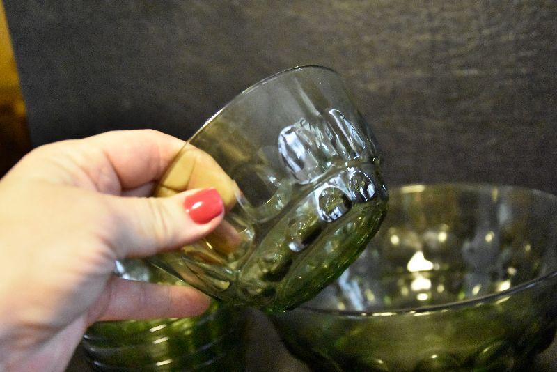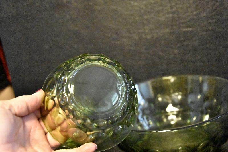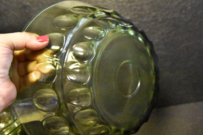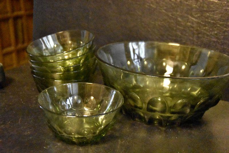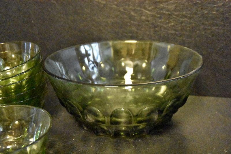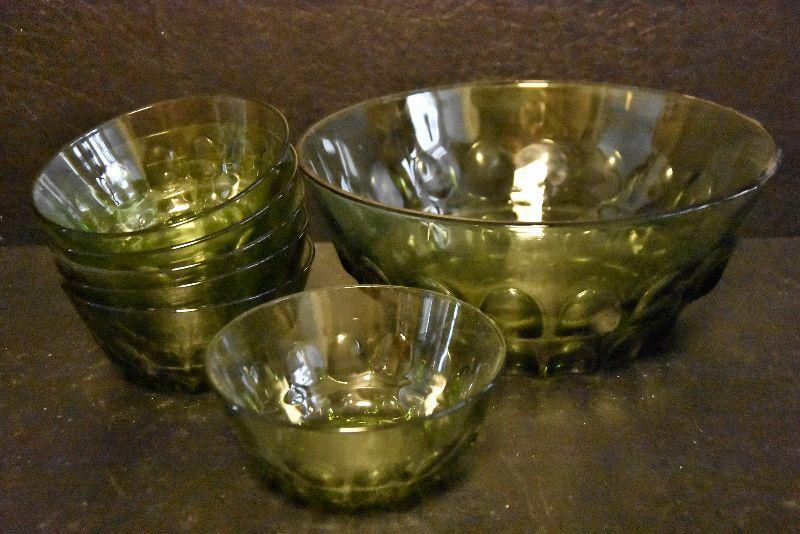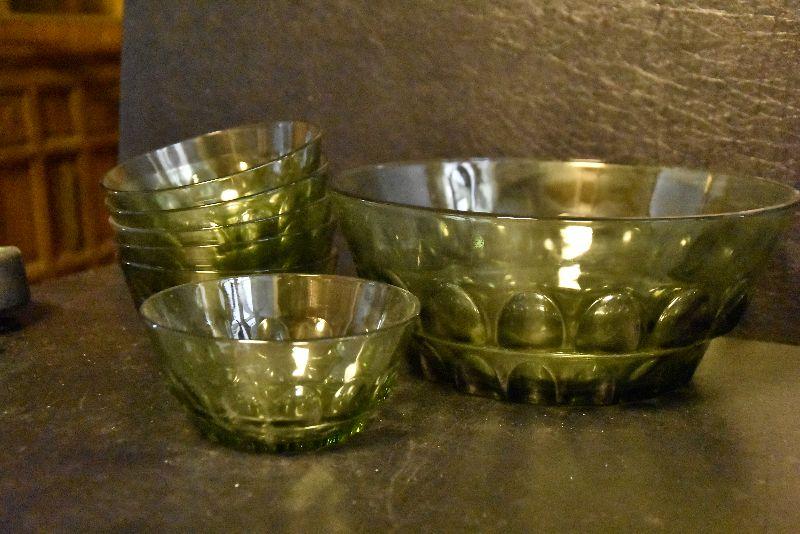 Vintage, green glass bowls with matching serving bowl. Salad or dessert? Your choice.