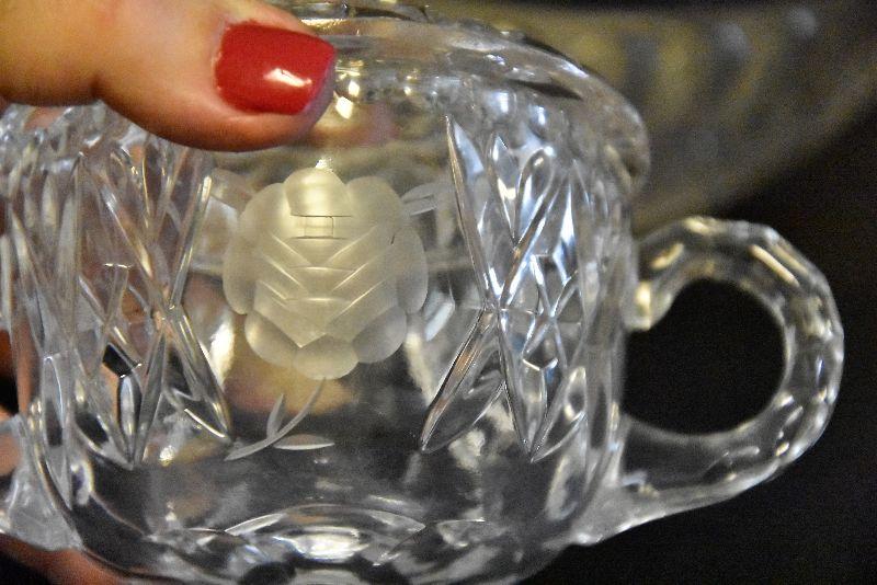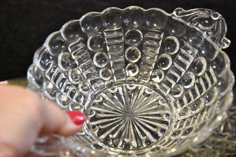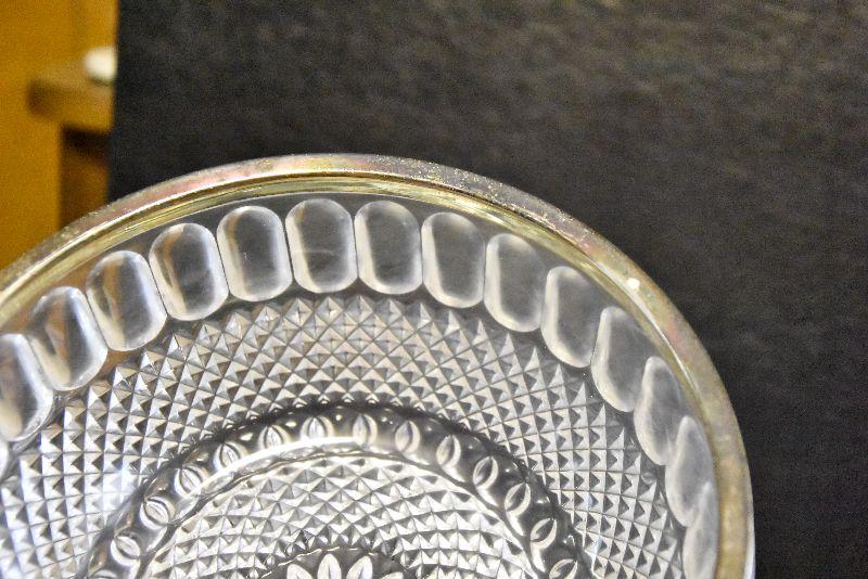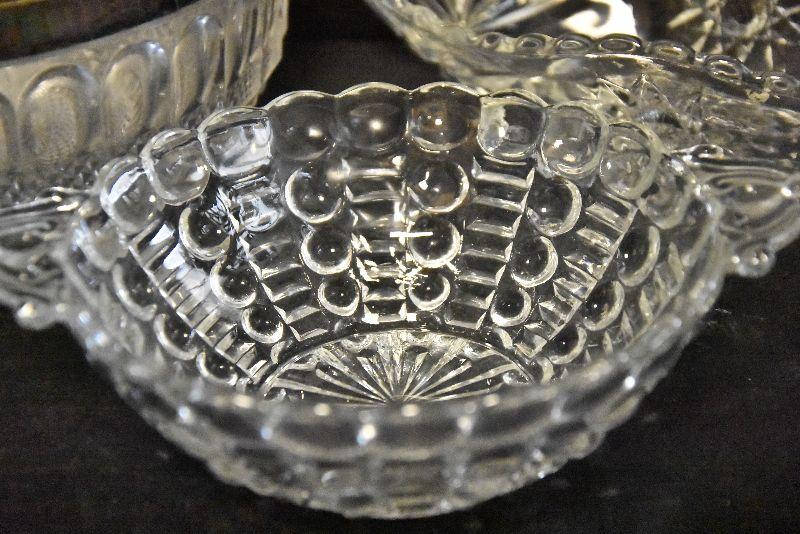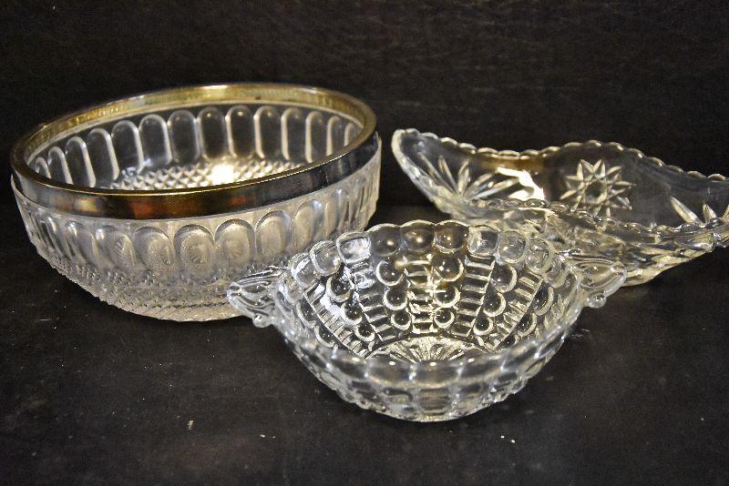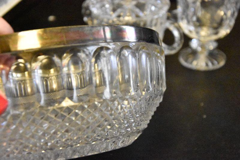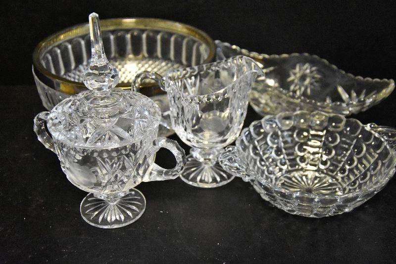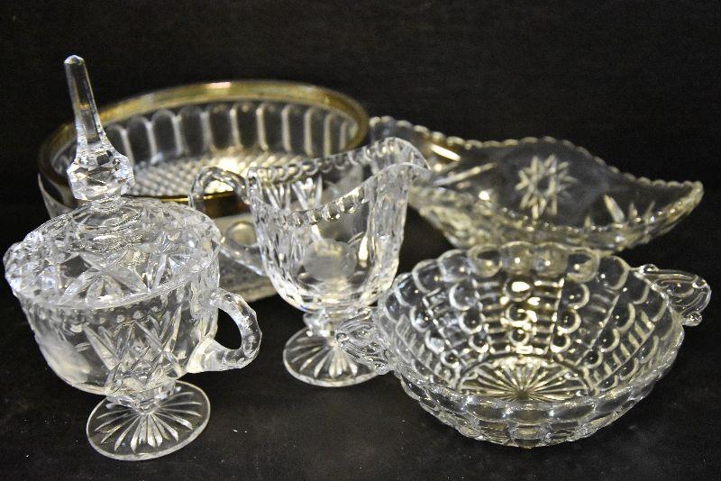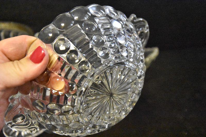 Stunning sugar and creamer, silver plate rimmed bowl, glass bubble bowl with handles, and a pressed glass, oblong bowl. Bring box for packing.