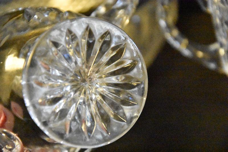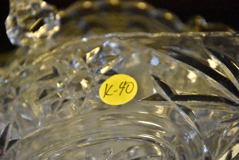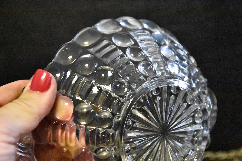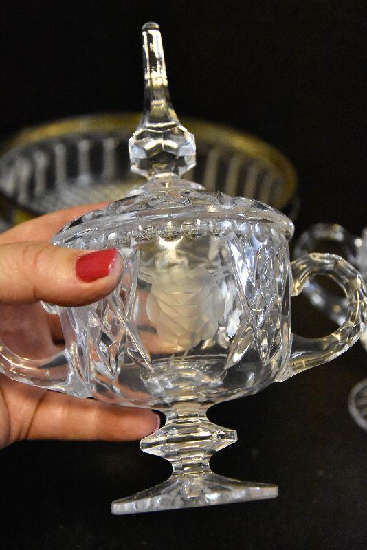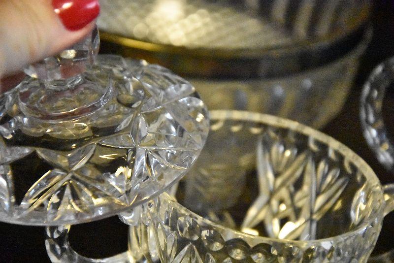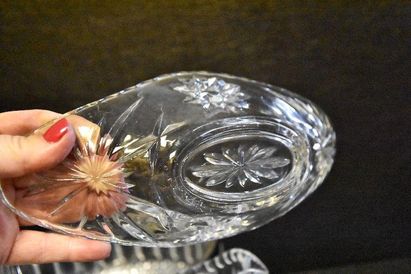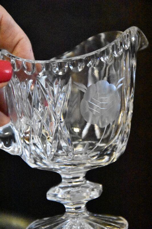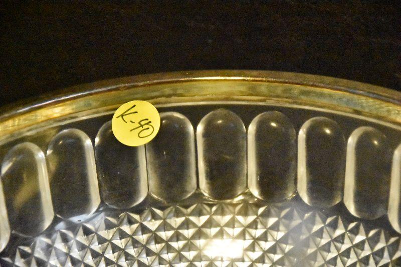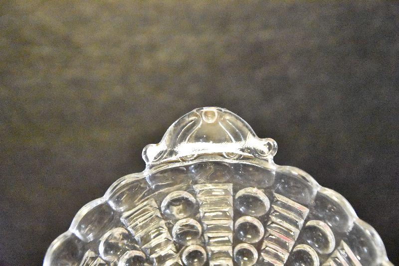 Stunning sugar and creamer, silver plate rimmed bowl, glass bubble bowl with handles, and a pressed glass, oblong bowl. Bring box for packing.