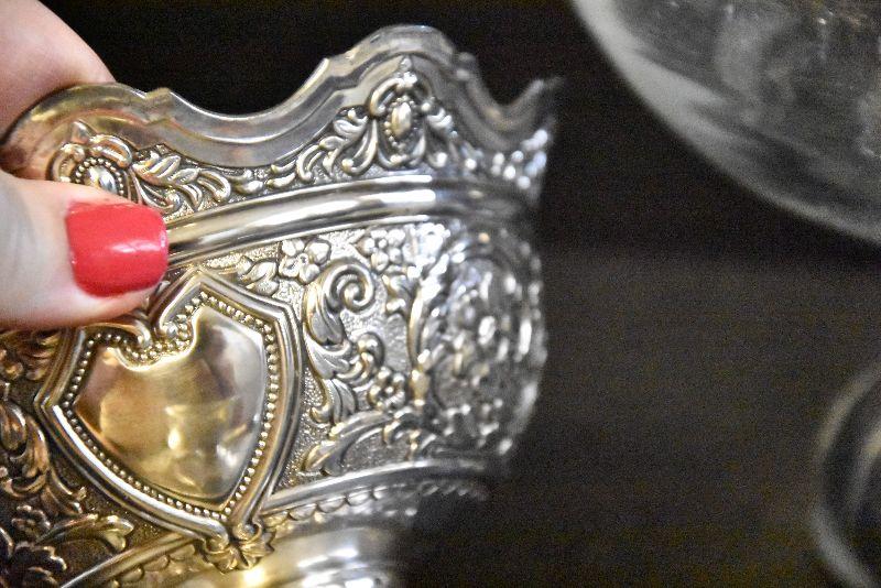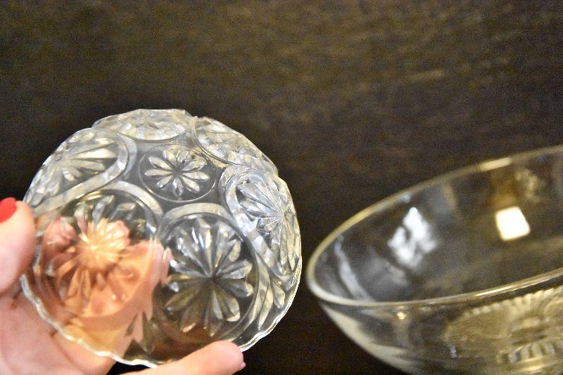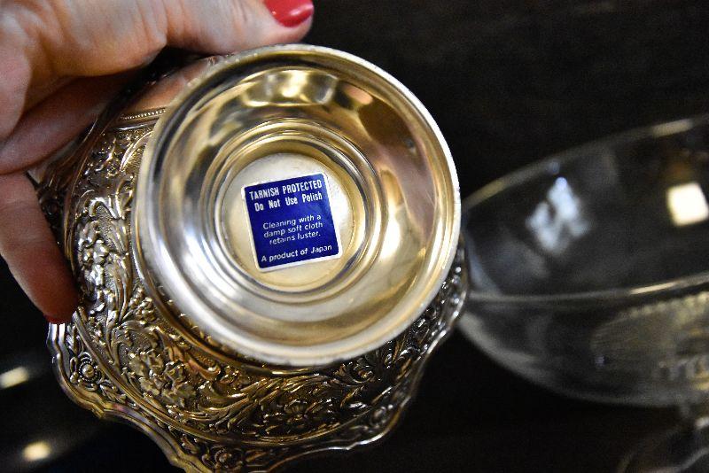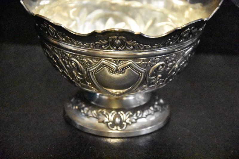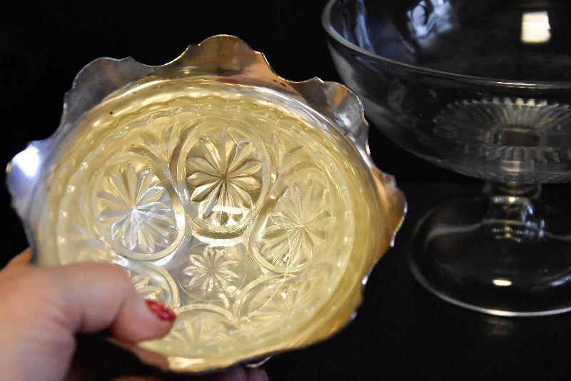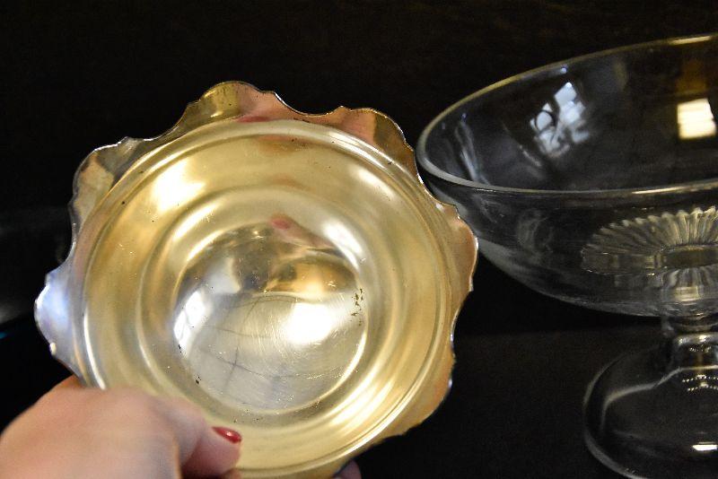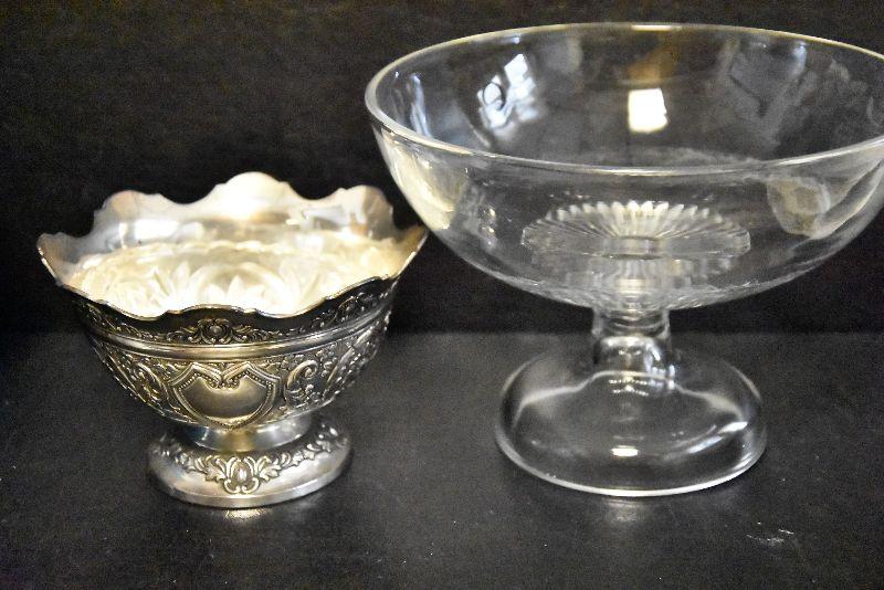 Silver toned bowl with glass insert, and a glass compote. Great for entertaining.