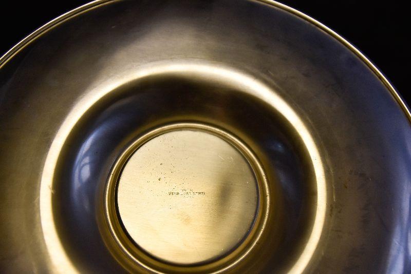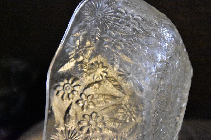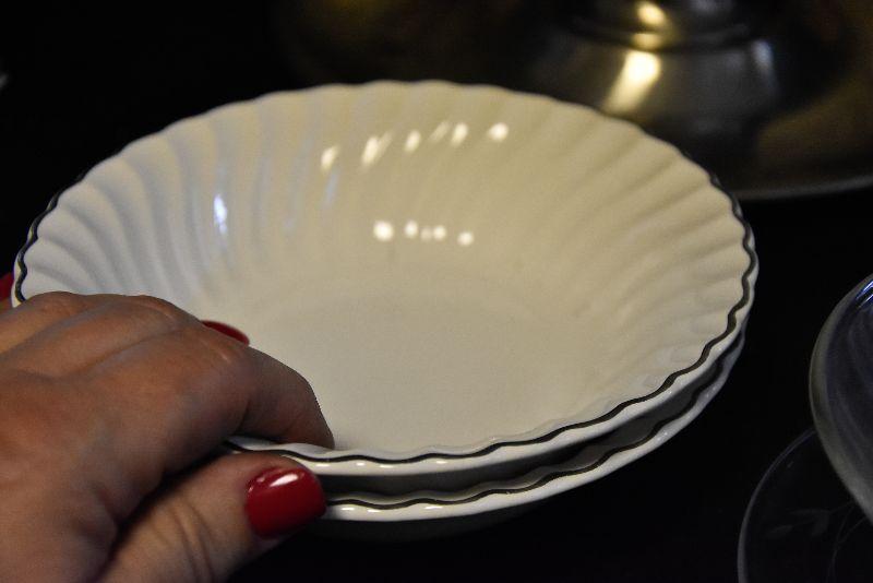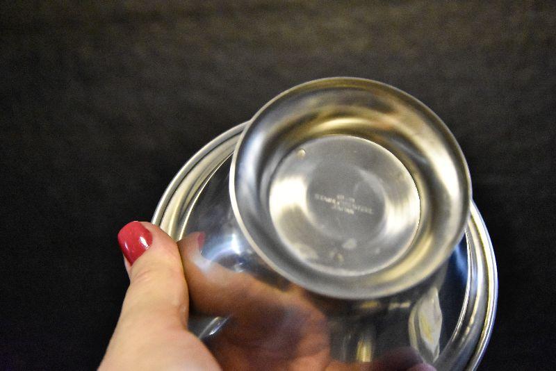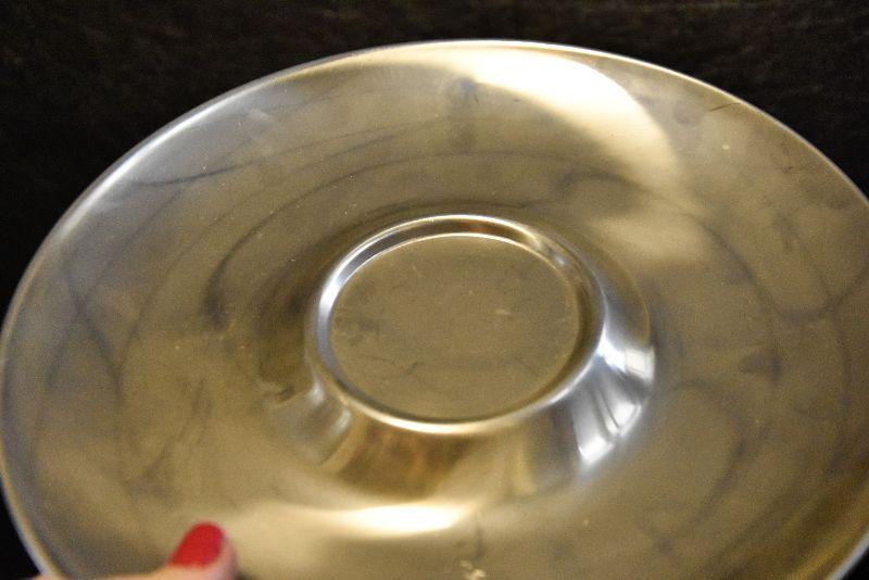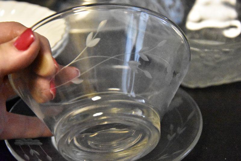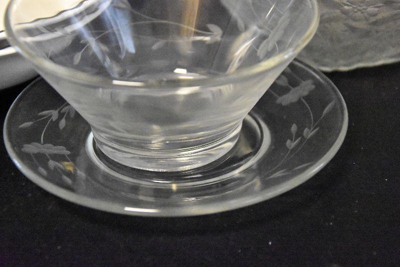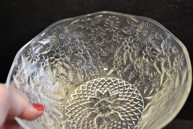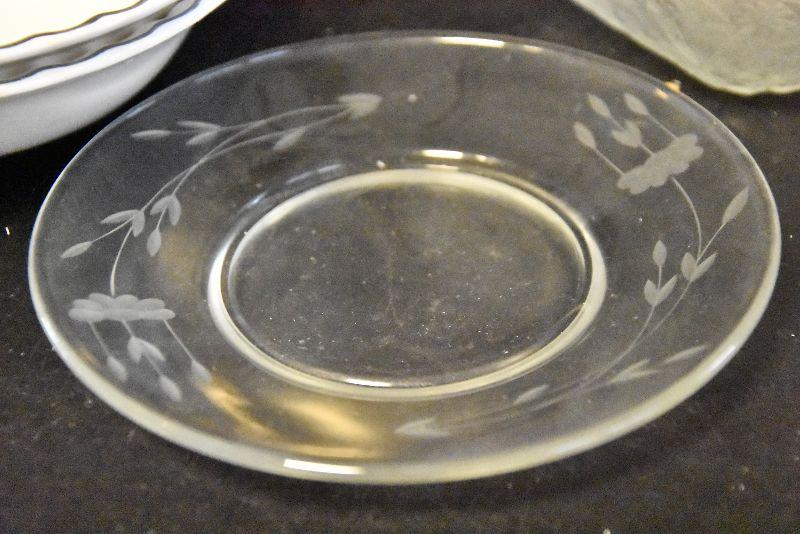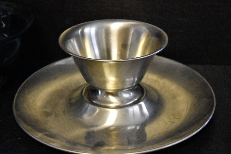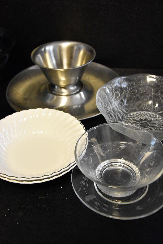 Stainless steel chip and dip, etched glass bowl with charger, swirled bowls, and a pressed glass bowl. Bring box for packing.