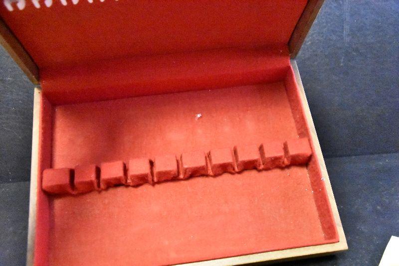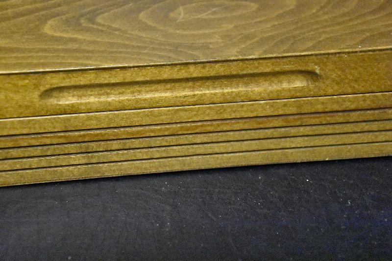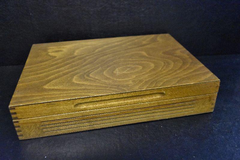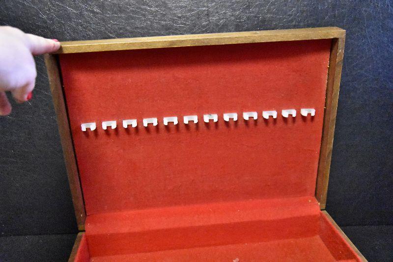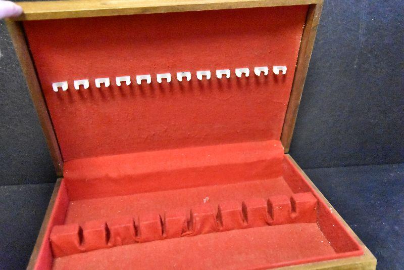 Vintage wooden silverware box with velvet like lining.