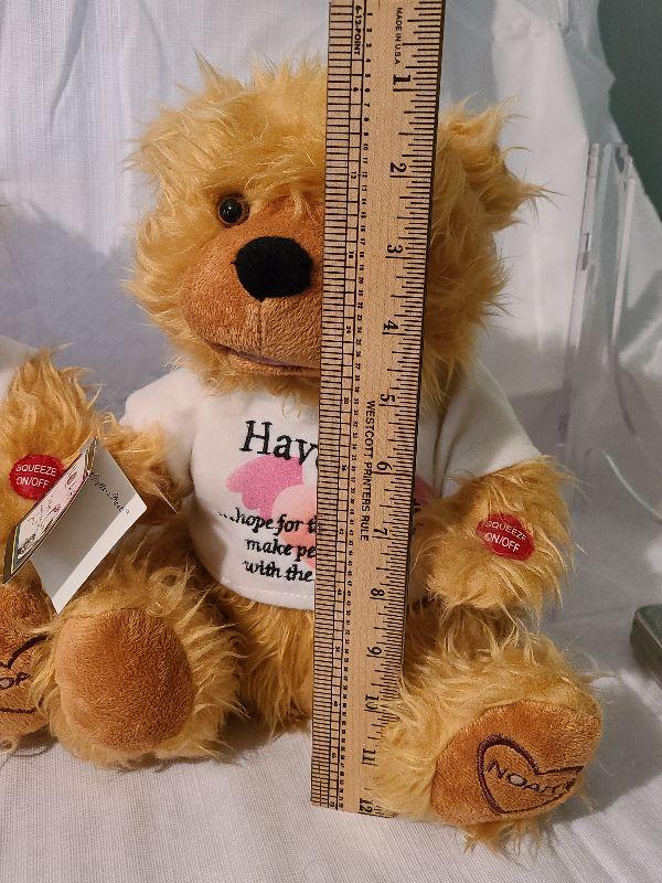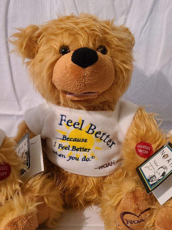 These bears are so cool. They are designed to give as gifts to give encouragement. Each has a recorded message and when you squeeze the paw, the mouth moves and talks. May require new batteries. Please see pictures for contents of the lot, size and condition. Thank you for looking and have fun bidding!
