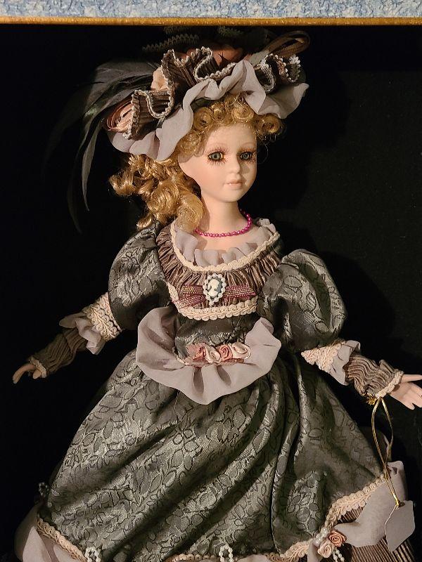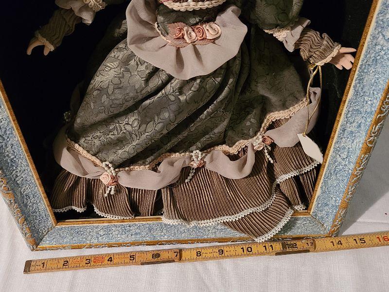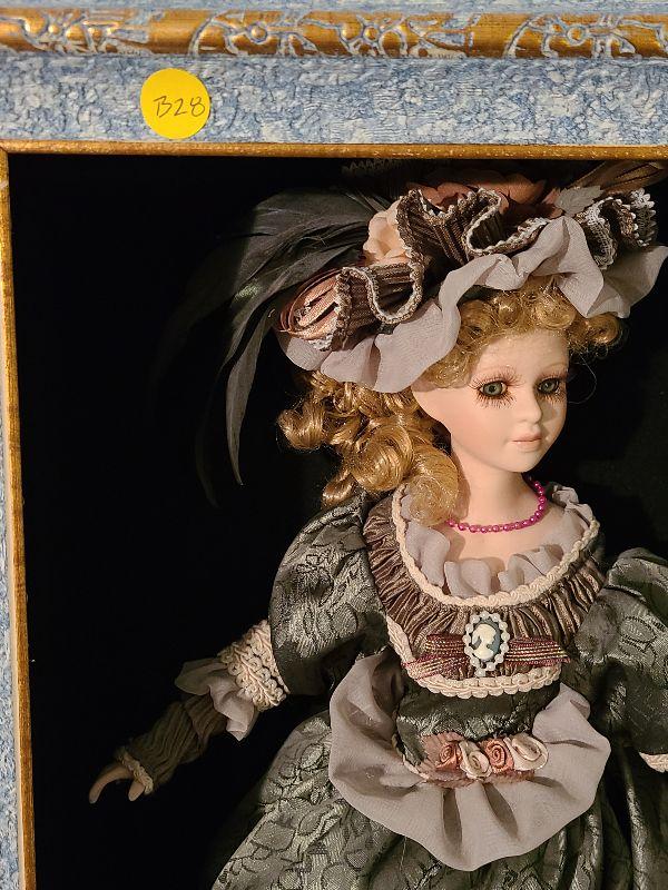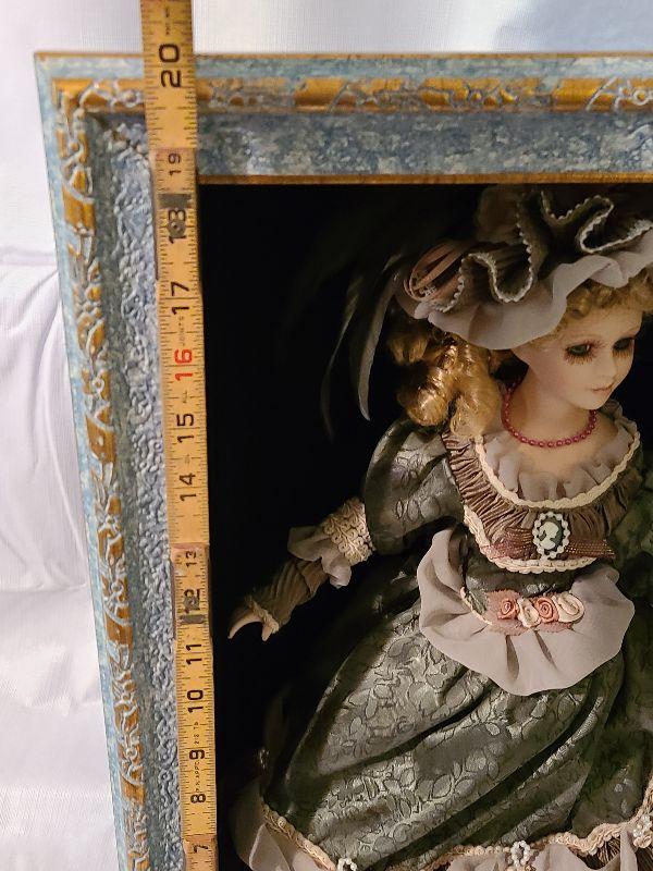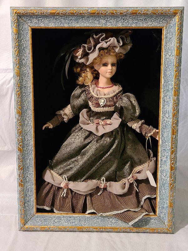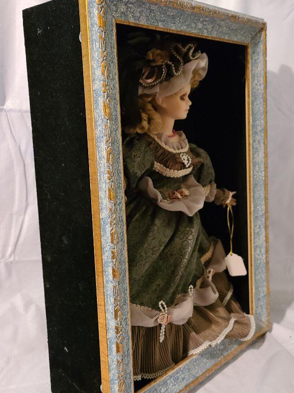 This beautiful porcelain doll is in a hanging wall display box! Unique Find! Please see all pictures for contents of the lot, size and condition. Thank you for looking and have fun bidding