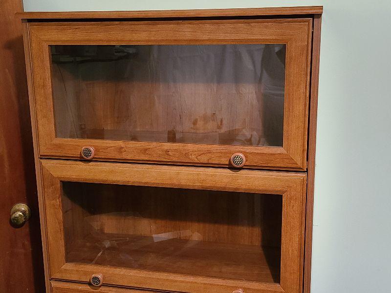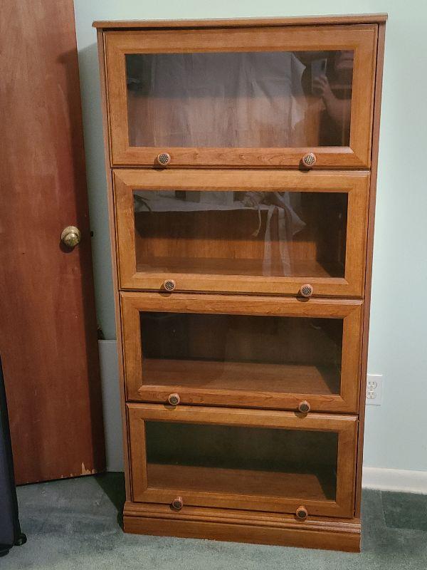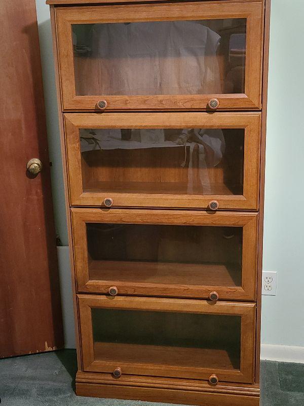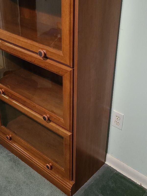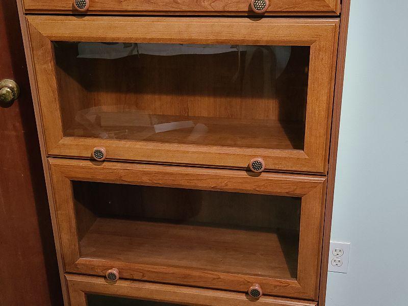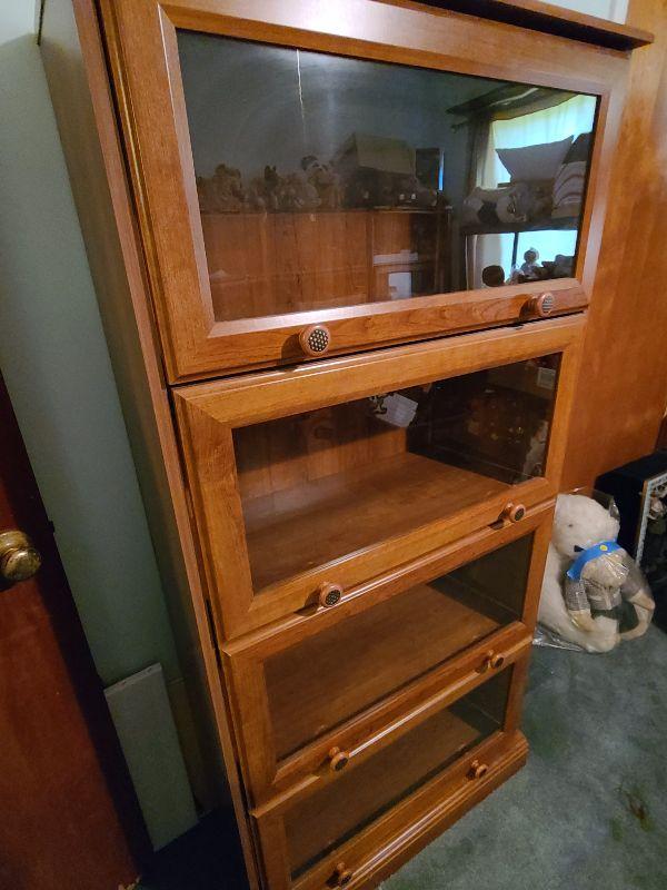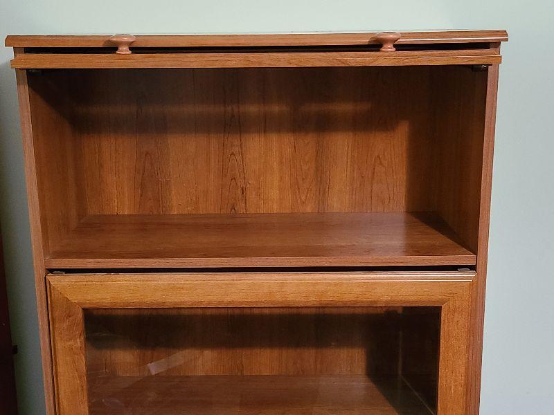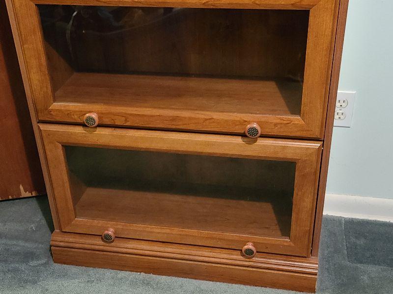 This is a very nice bookshelf in the style of a barrister bookshelf. We will be listing two of these. This listing is for one of the set. Please see all pictures for contents of the lot, size and condition. Thank you for looking and have fun bidding.