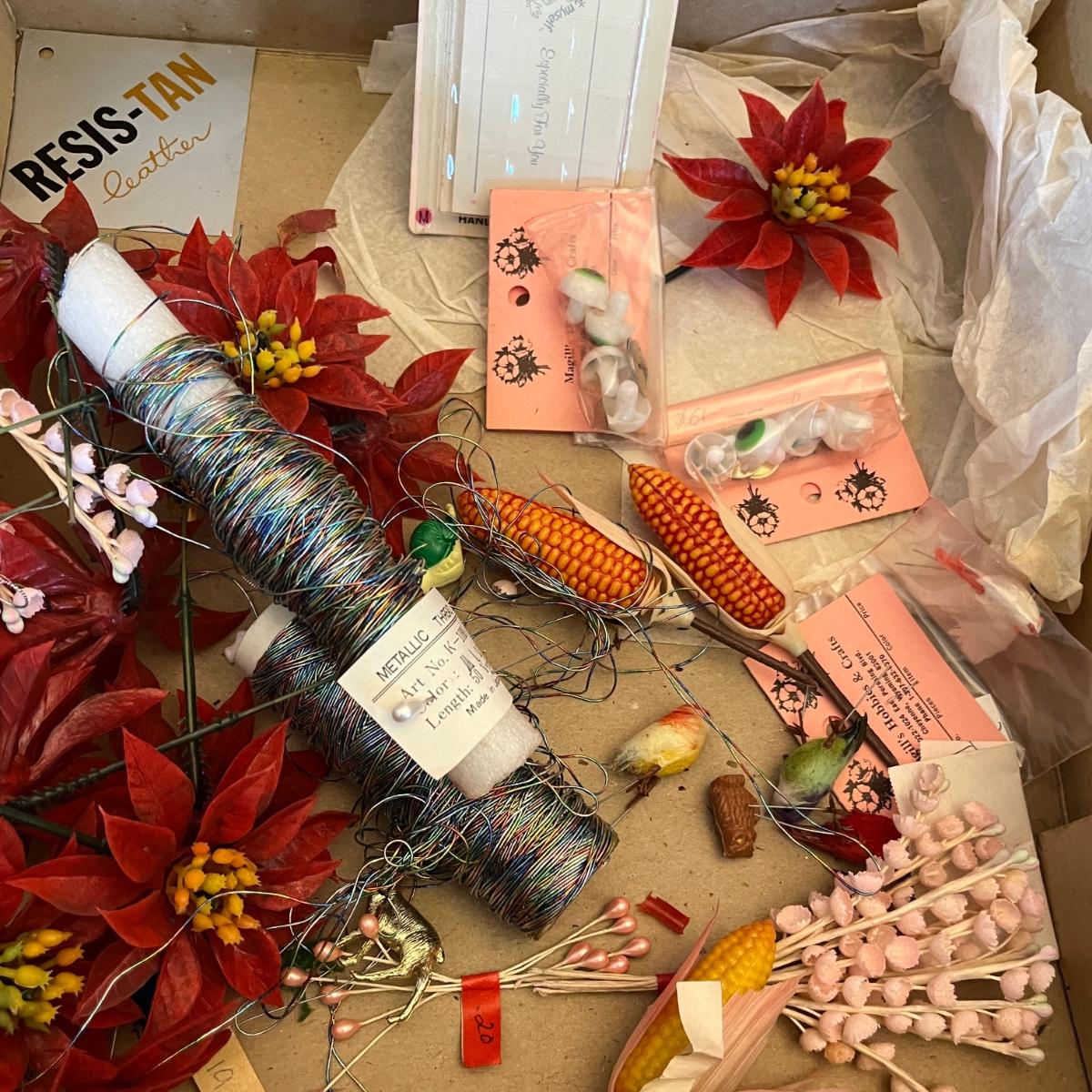 Box of Christmas crafting items