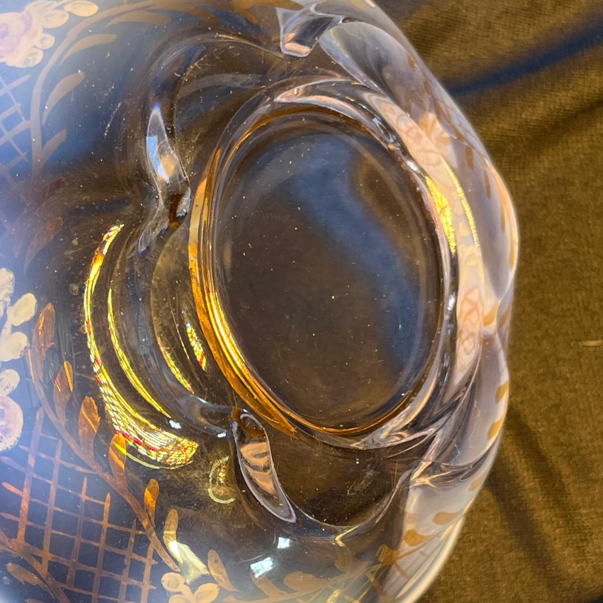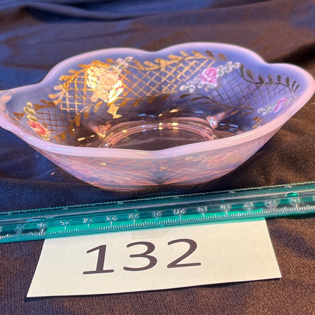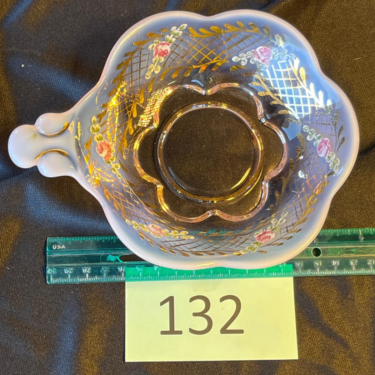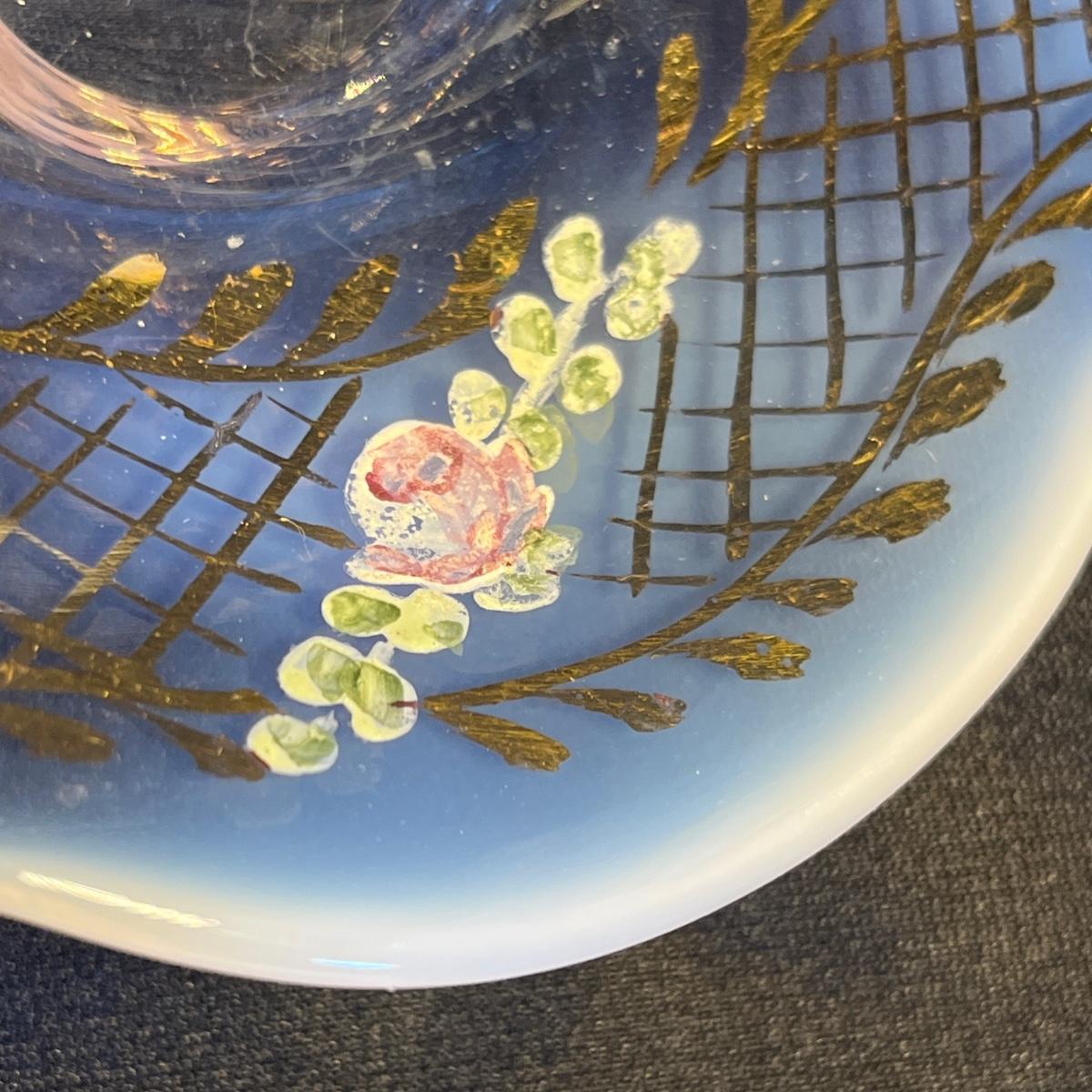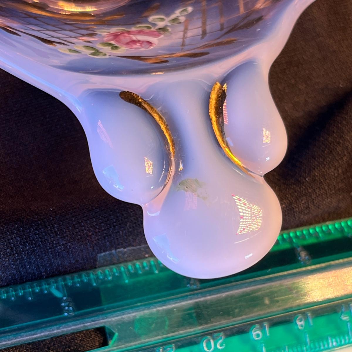 Most people confuse this with either Fostoria or Fenton. Duncan & Miller made some great opalescent glass. This one was decorated for the Charleton Line...a decorating company. No wear or damage.
