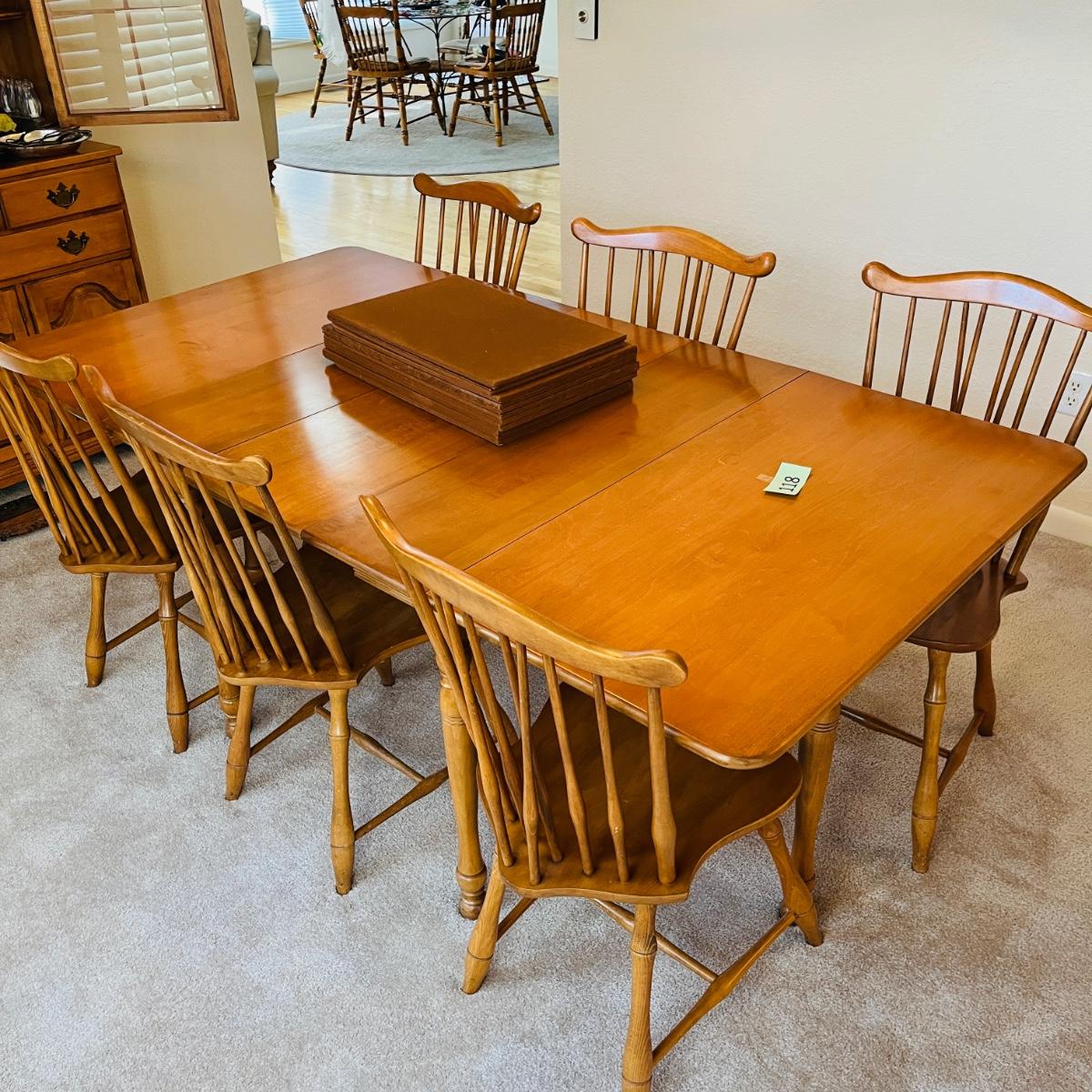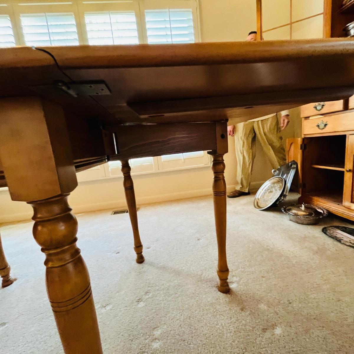 Great table! Comes with pads, one leaf, 6 chairs. Table condenses as it has drop sided leaves too! Very clean. No damage!