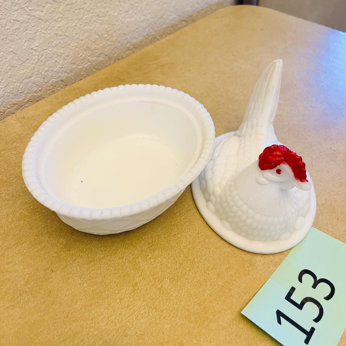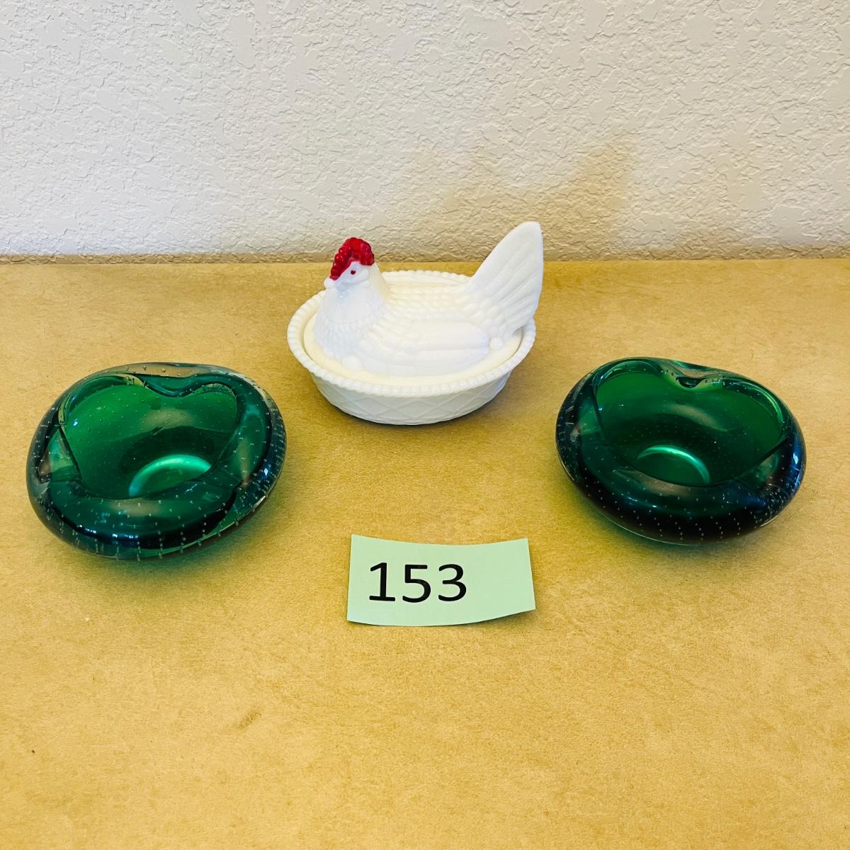 Murano ashtrays, Westmoreland Hen on nest candy box. No damage.