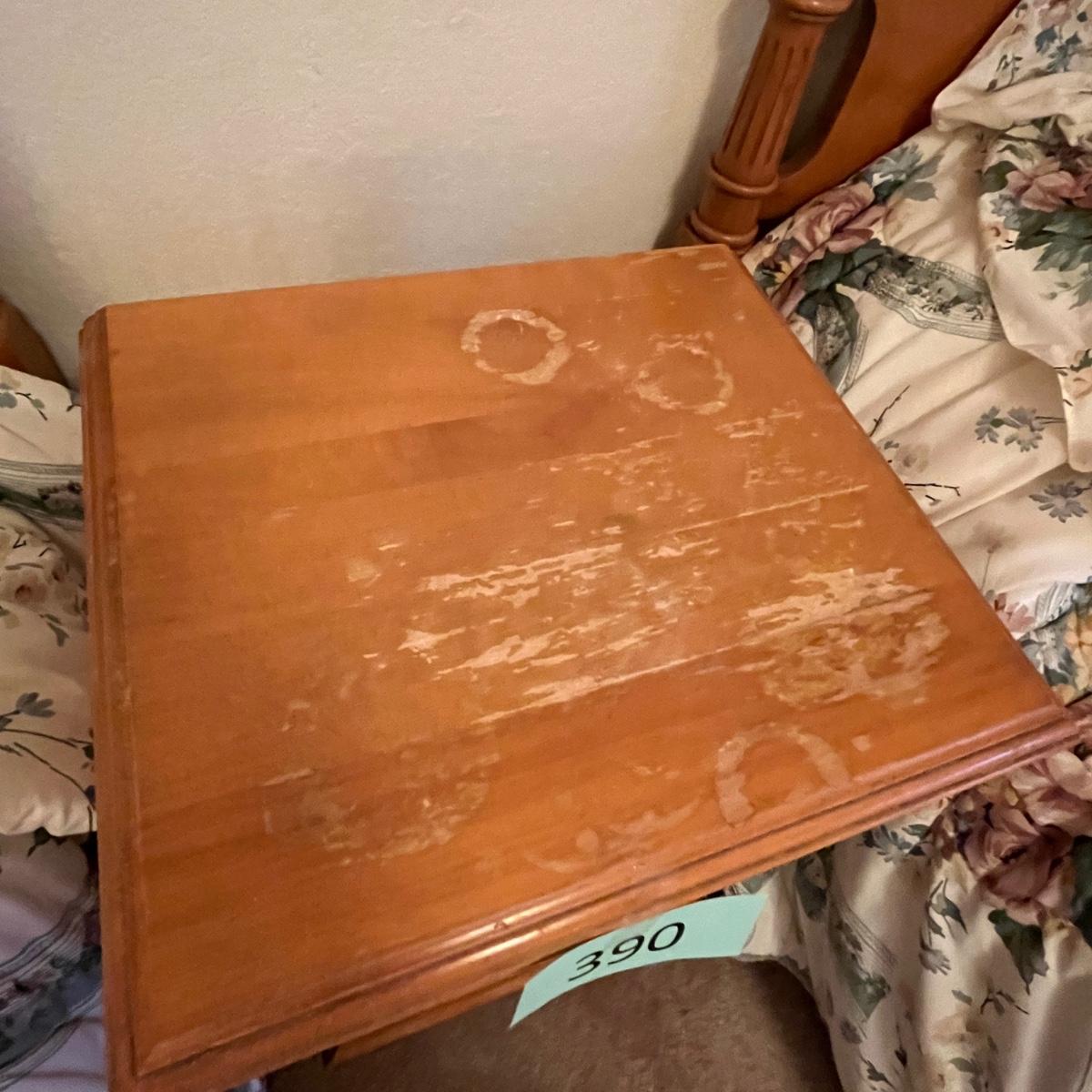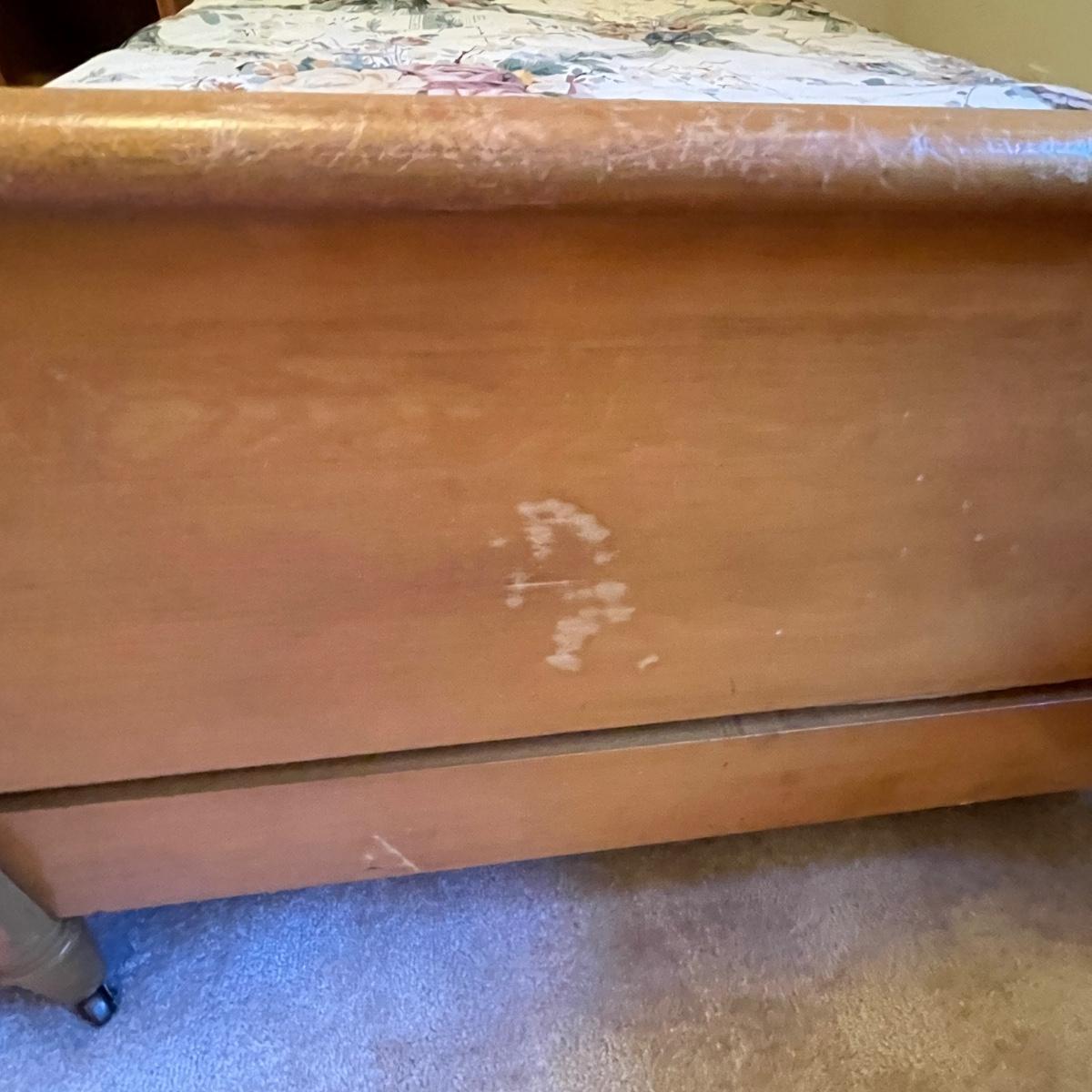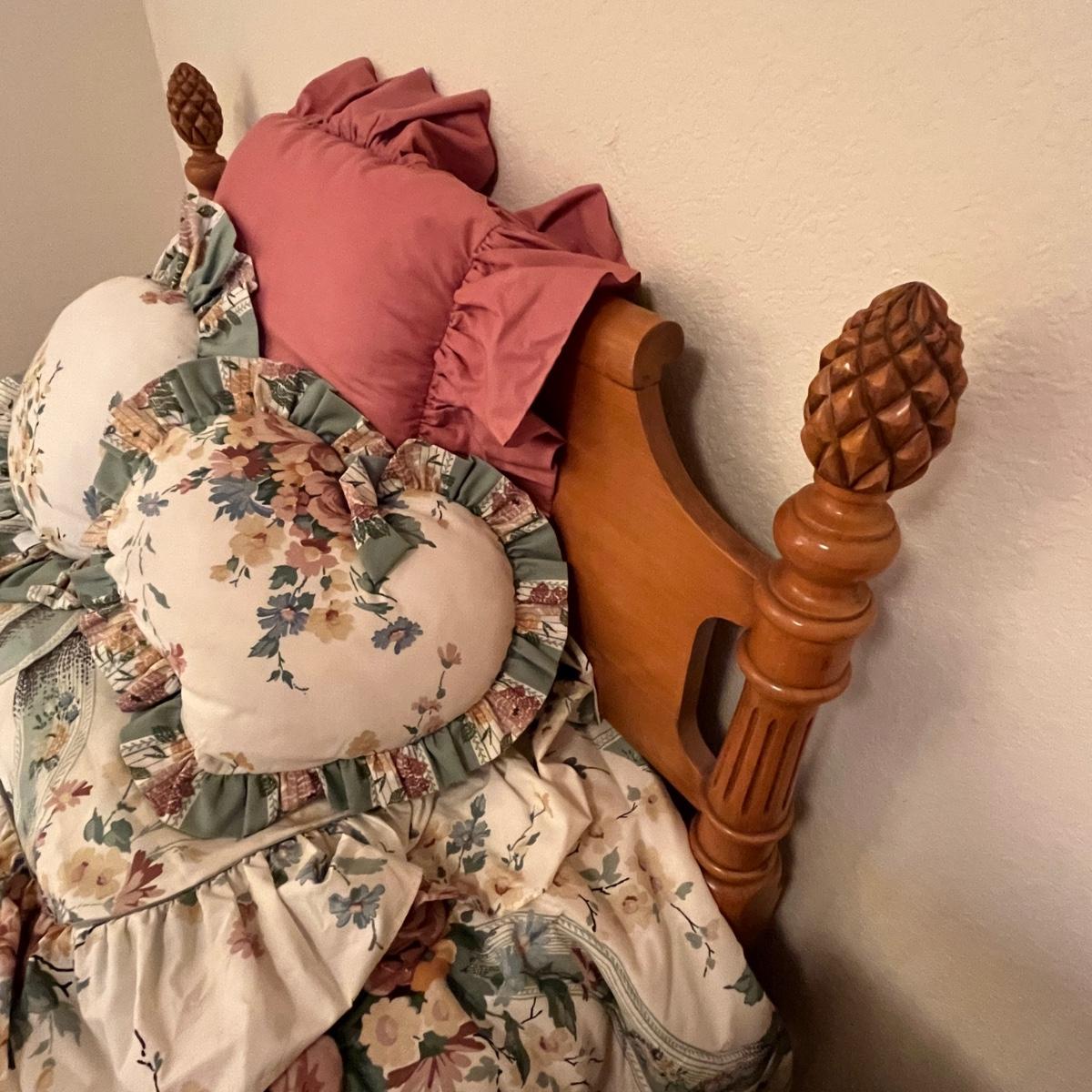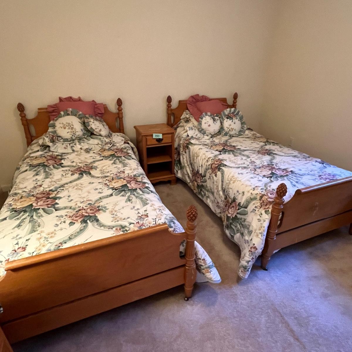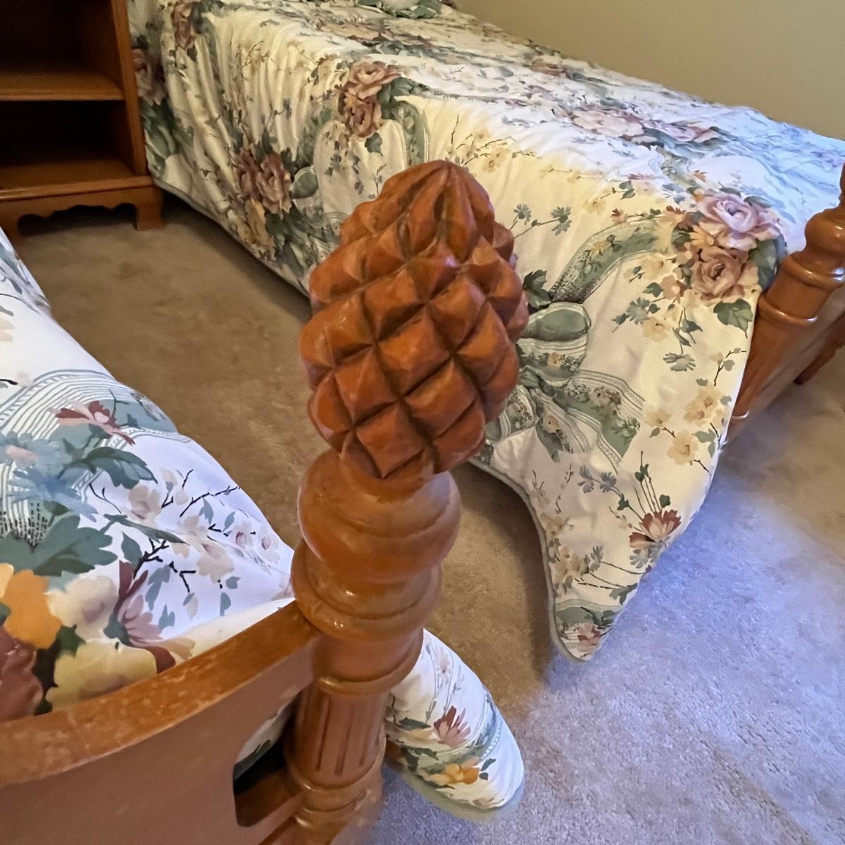 Great for 2 girls! Maple/ Birch Early American style with Pineapple finials! This comes with sheets, blankets, comforters, & nite stand! Very clean!